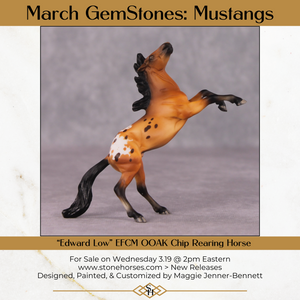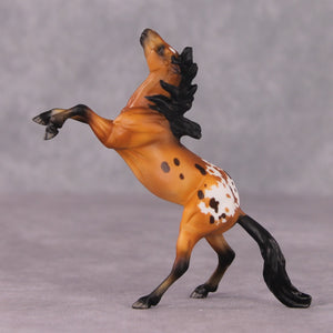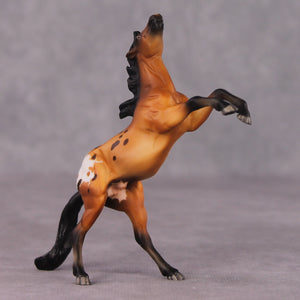 “Edward Low” is a mini version of Salispian, featuring the same color design in his shaded wild bay appaloosa coat with loads of detailing, spotting around his sheath, four perfectly striped hooves, and accurately painted eyes with visible sclera for a horse throwing his head as high as he is! He has a totally resculpted head and neck position, including weight added to his neck and shoulders to make him a beefier stallion.