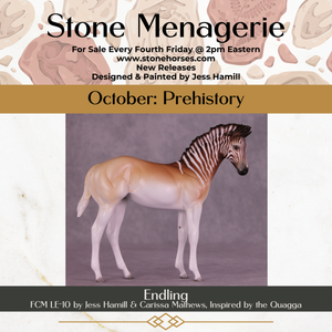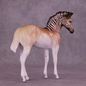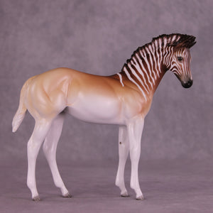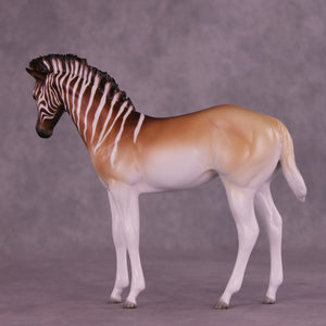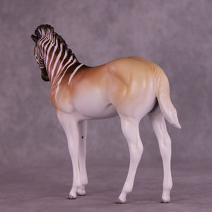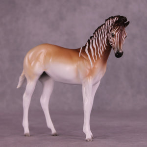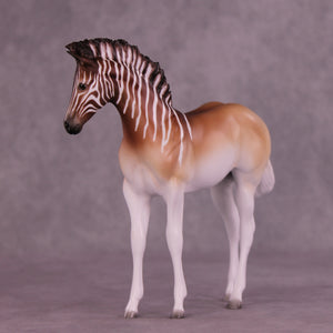 Endling is an FCM Weanling in a limited run of 10 pieces inspired by the historical Quagga. She has a dramatically customized standing-up mane by Carissa Mathews, and Jess painted her to a gorgeously detailed stripe design fading into a beautifully soft pangare body color. She is ready to ship now.