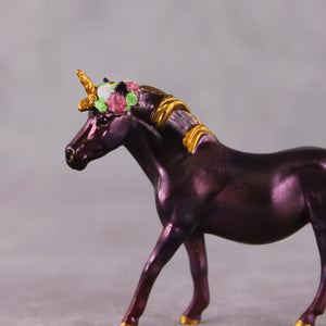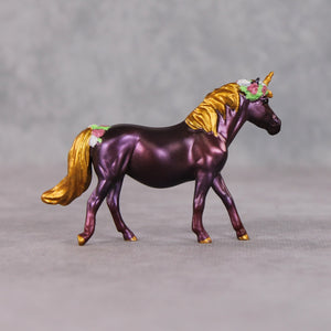 "Este’s Sister" is the nighttime version of Este – similar, but darker and moodier. Kristen gave her a customized swishing tail, a unicorn horn of course, plus a flower crown and flowers at the top of her tail. She is then painted to a deep shimmery purple plum, with golden hooves.