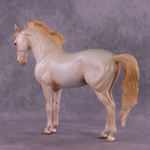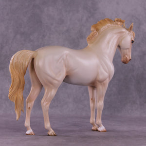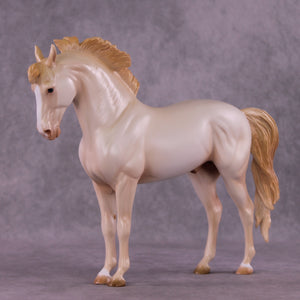 Eugene is a new customization on our Andalusian sculpture, featuring a long loose flowing tail and customized upstanding short mane by Melanie Miller. Ashley painted him to a stunningly dimensional cremello pearl with a blaze and two low socks. Ashley is phenomenal at the cream dilutes and this guy is a stellar example of her work! He comes in all finish options.