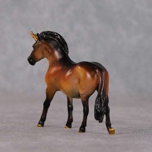 "Fairy Bread" is another amazing fantasy creation straight from the pages of an epic fairytale. Kristen customized her to have a short unicorn style tail, a short spiky mane, and of course a unicorn horn. She is then painted to a luscious shaded wild bay with a dorsal stripe, to blend in to the underbrush. She is currently satin matte and extra finish is available on this piece.
