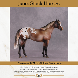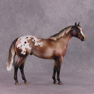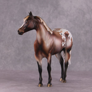 “Ferguson” features our fluffy pony mane on both sides of his neck, along with the loose shorter pony tail for the full appaloosa look. Amanda also gave him extra facial carving before painting him to this lovely varnish bay roan blanket appaloosa with dramatic shading throughout.