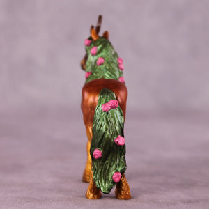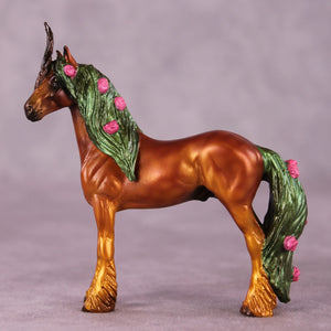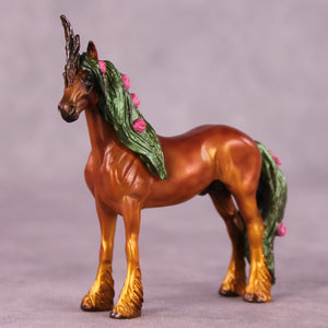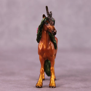 “Ferrin” is our Chip Drafter customized into a forest unicorn with a curved tree branch style horn, extra full customized mane and tail on both sides of his neck, and pink flowers woven through. Kristen painted him to a shining shaded chestnut with golden detailing, a lovely little forest creature.