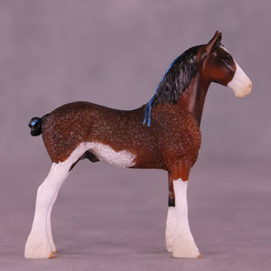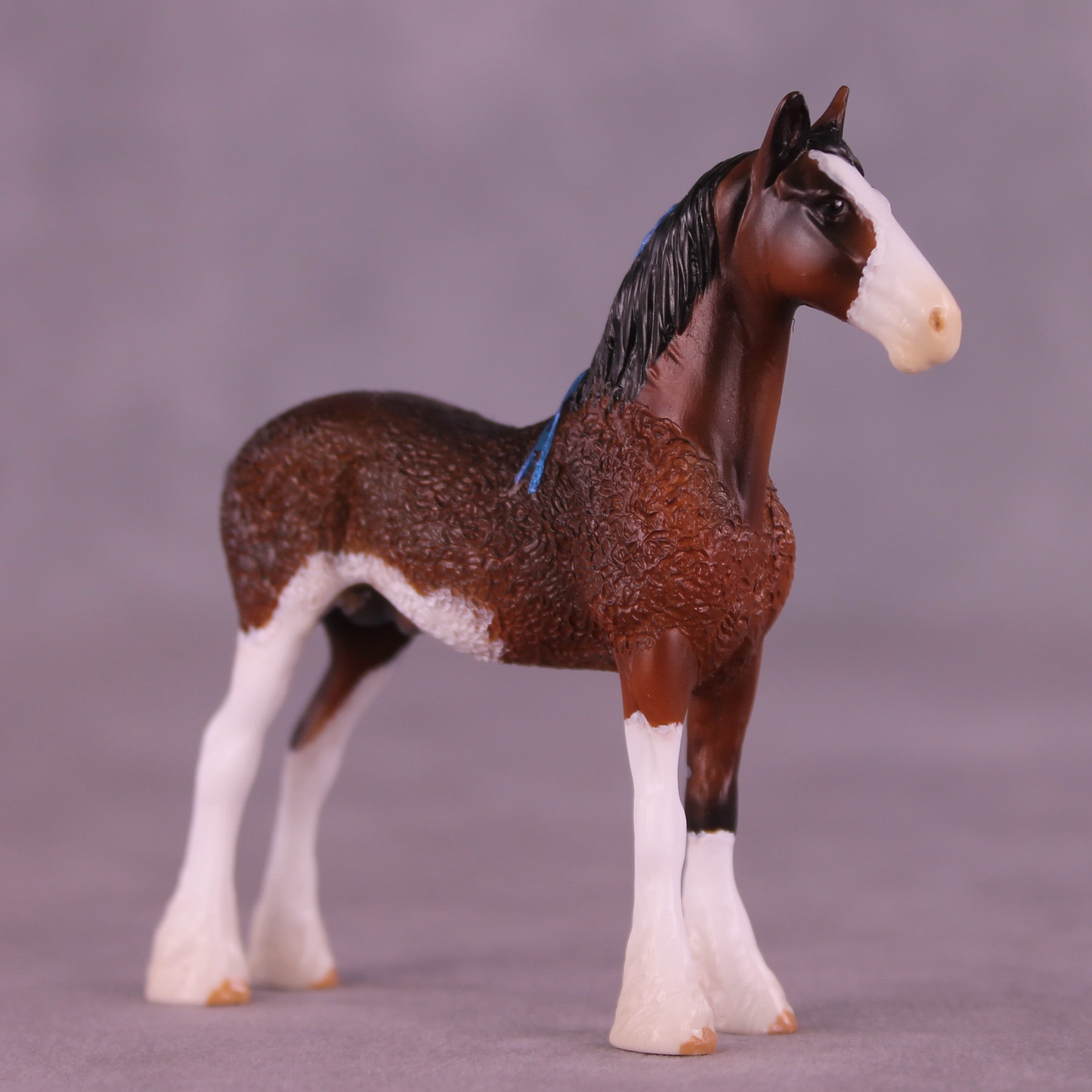 Kristen took our Chip Drafter and gave him a proudly straightened customized head and neck position, and then did extensive re-working on his whole body to represent the show Draft ‘soaping’ technique! She did a marvelous job and this gentleman looks fresh from a draft horse show ring. He is painted to a lovely shaded bay sabino with high shaded white socks, a wide blaze, and coordinating blue ribbons in his mane and tail. He comes in matte finish and no finish changes are offered on this piece.