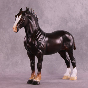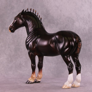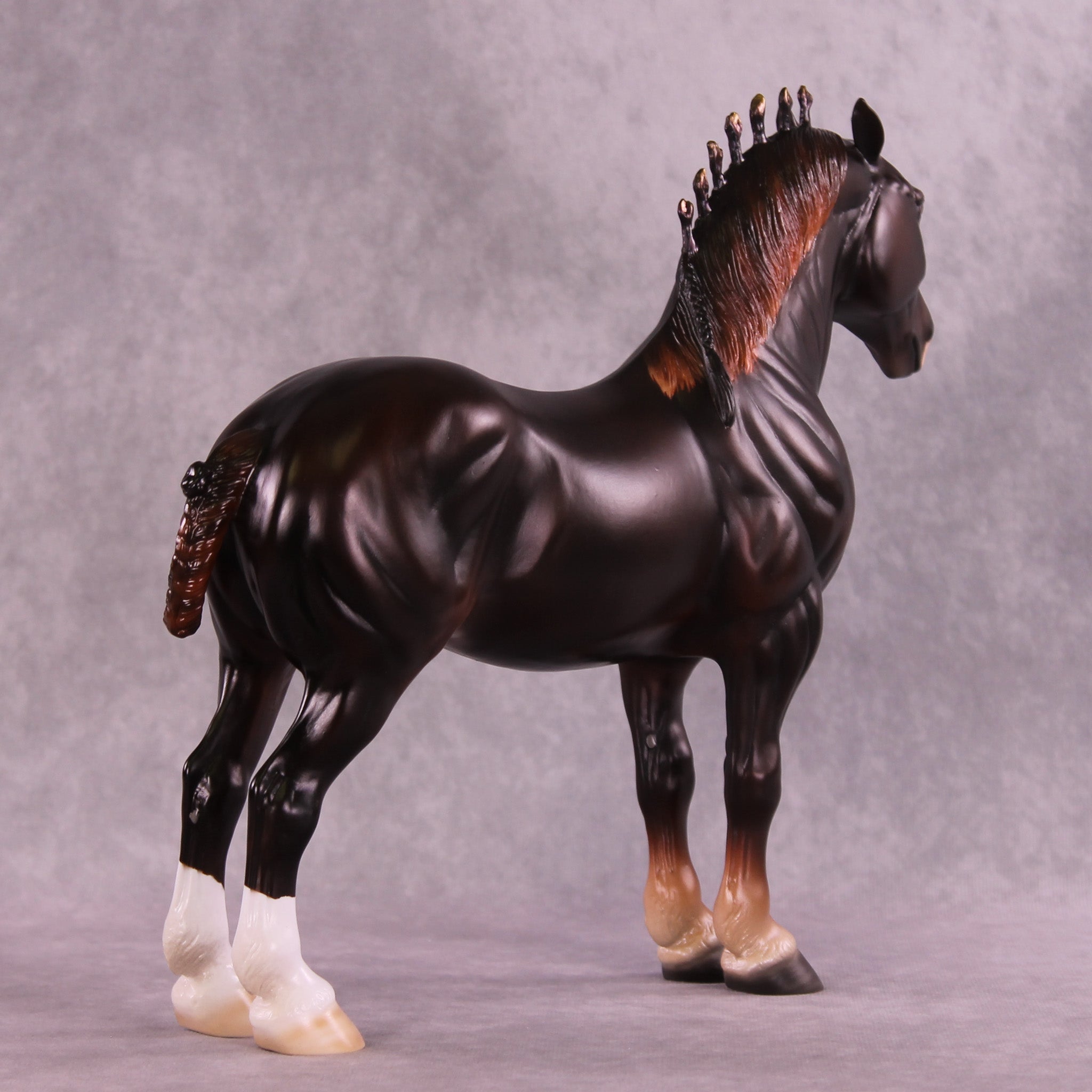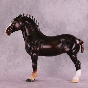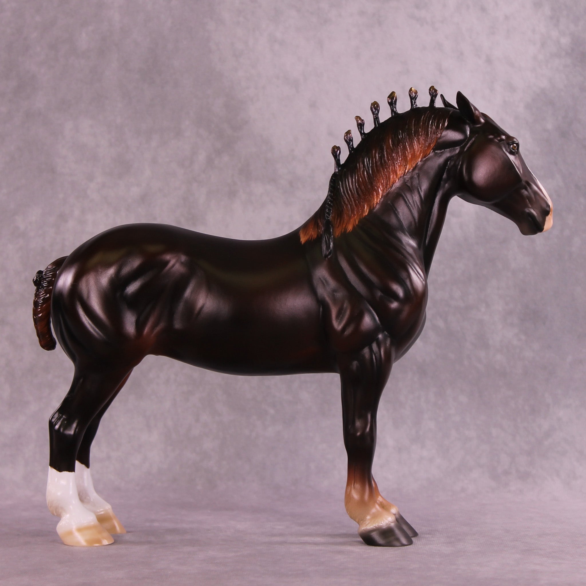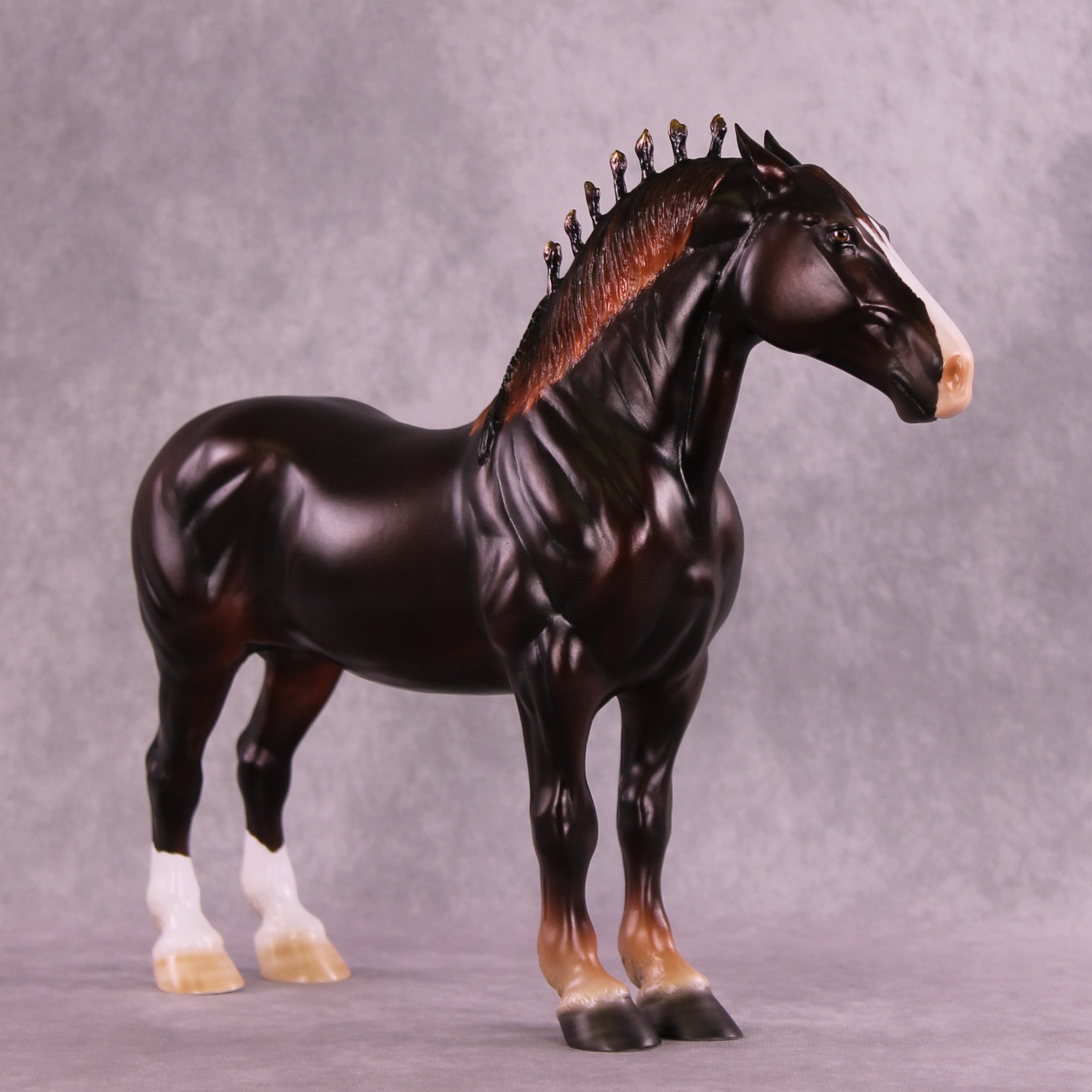 Mel worked with our iconic Standing Drafter to give him big pinned ears, along with customized bobs in the shape of flames, along with a customized fully braided drafter tail. Firewall indeed – none may pass this imposing drafter. Ashley painted him to a beautifully deep liver chestnut with a big blaze and two hind socks – complete with black ribbons and metallic shading in his bobs. He is available in all finish options.