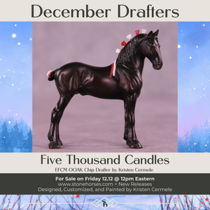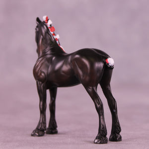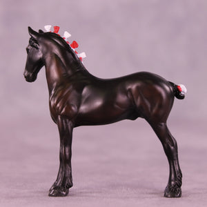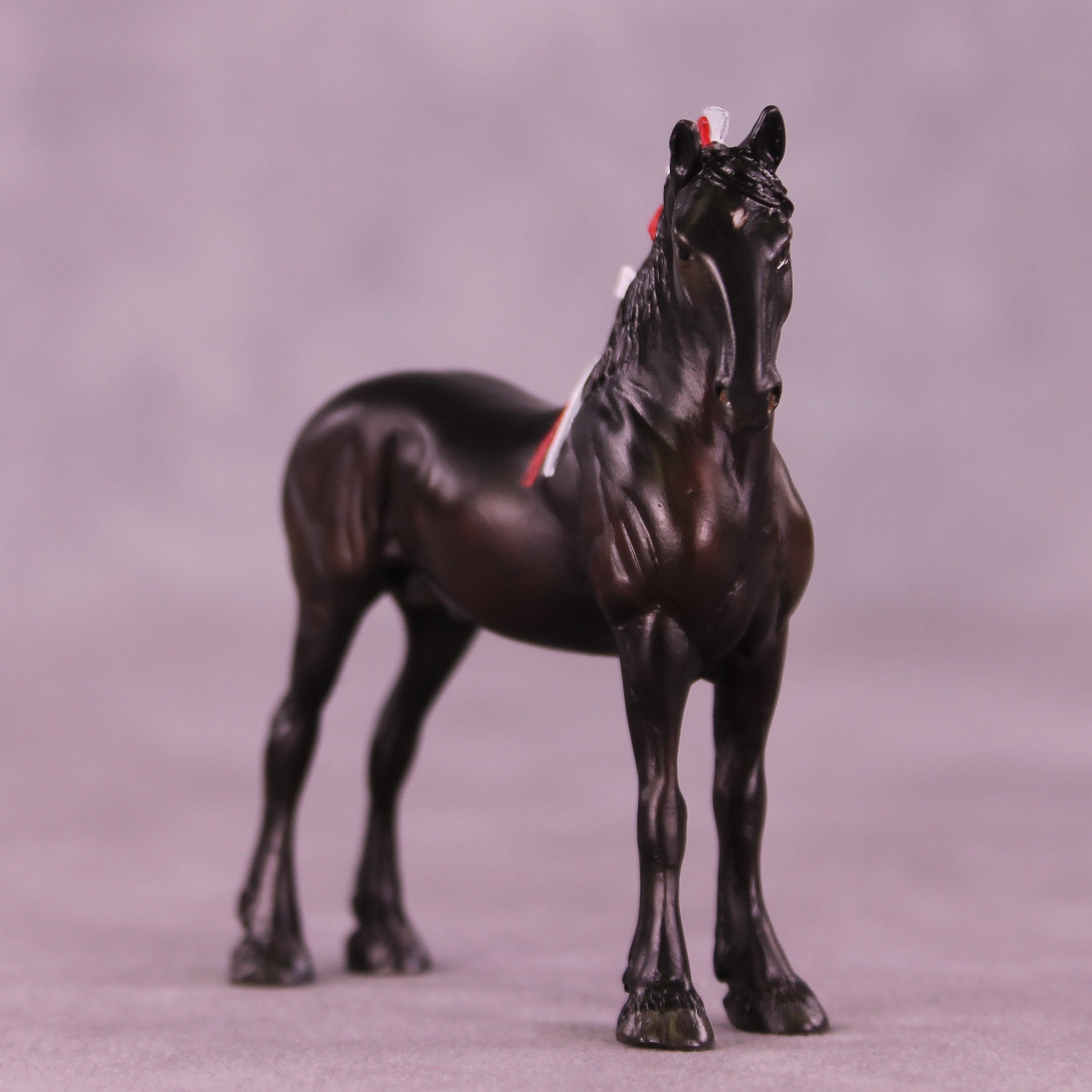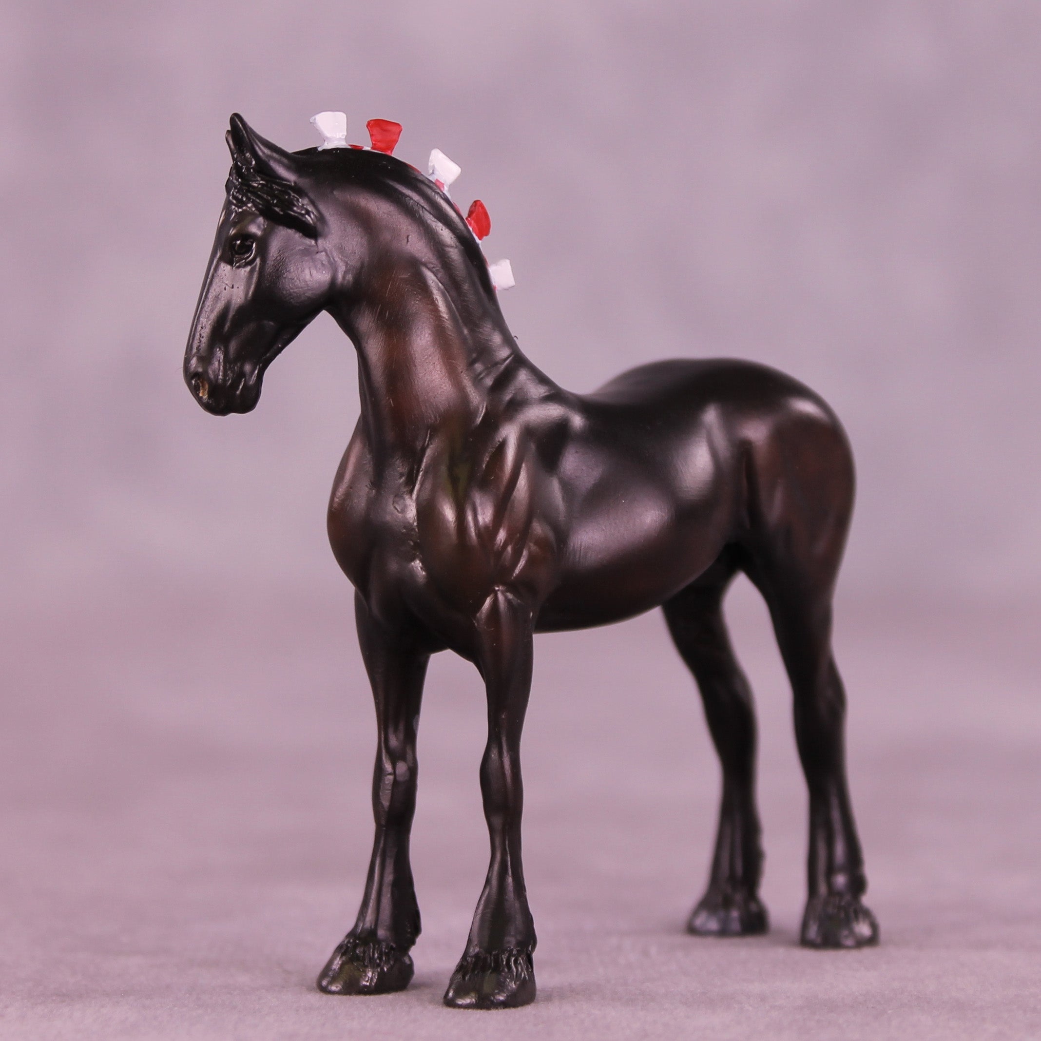 Kristen gave our Chip Drafter the total show horse makeover! She first took the clippers to him, customizing his lower legs to a cleaner look with less feather on all four legs. She gave him an inquisitive turned and tucked head and neck, a new customized mane with draft show horse flights in red and white, with matching red and white ribbons in his tail. He is painted to a luscious shaded black Percheron, ready to win. He comes in a light satin finish and no finish changes are offered on this piece.