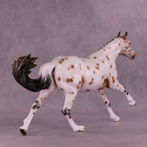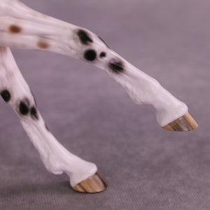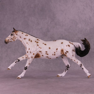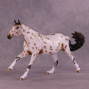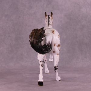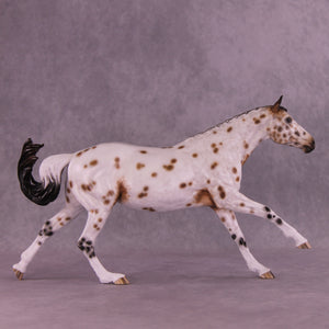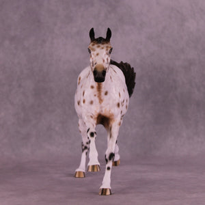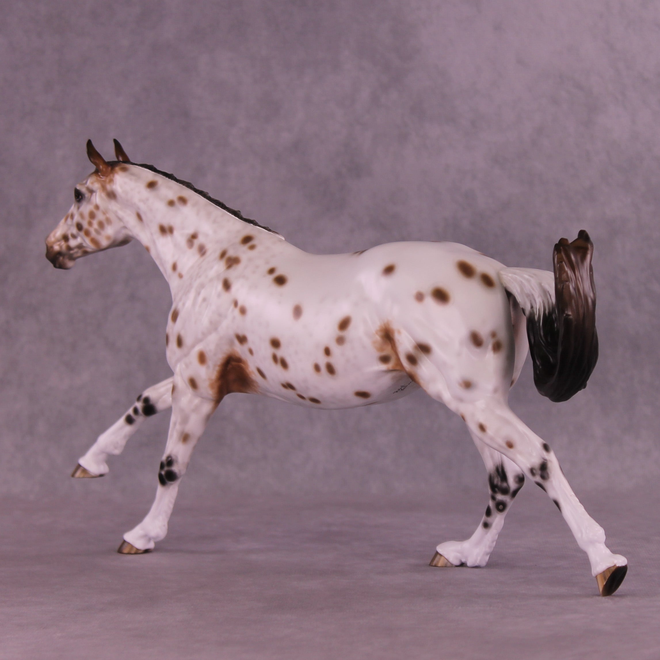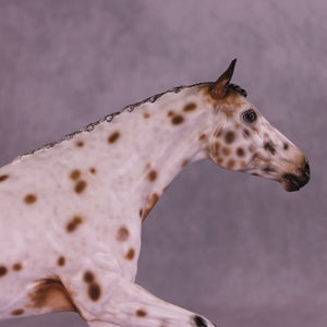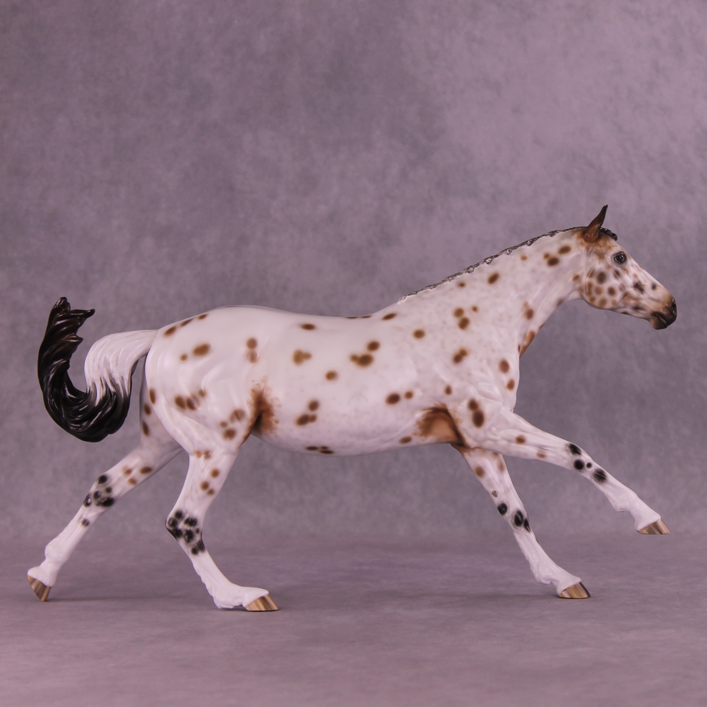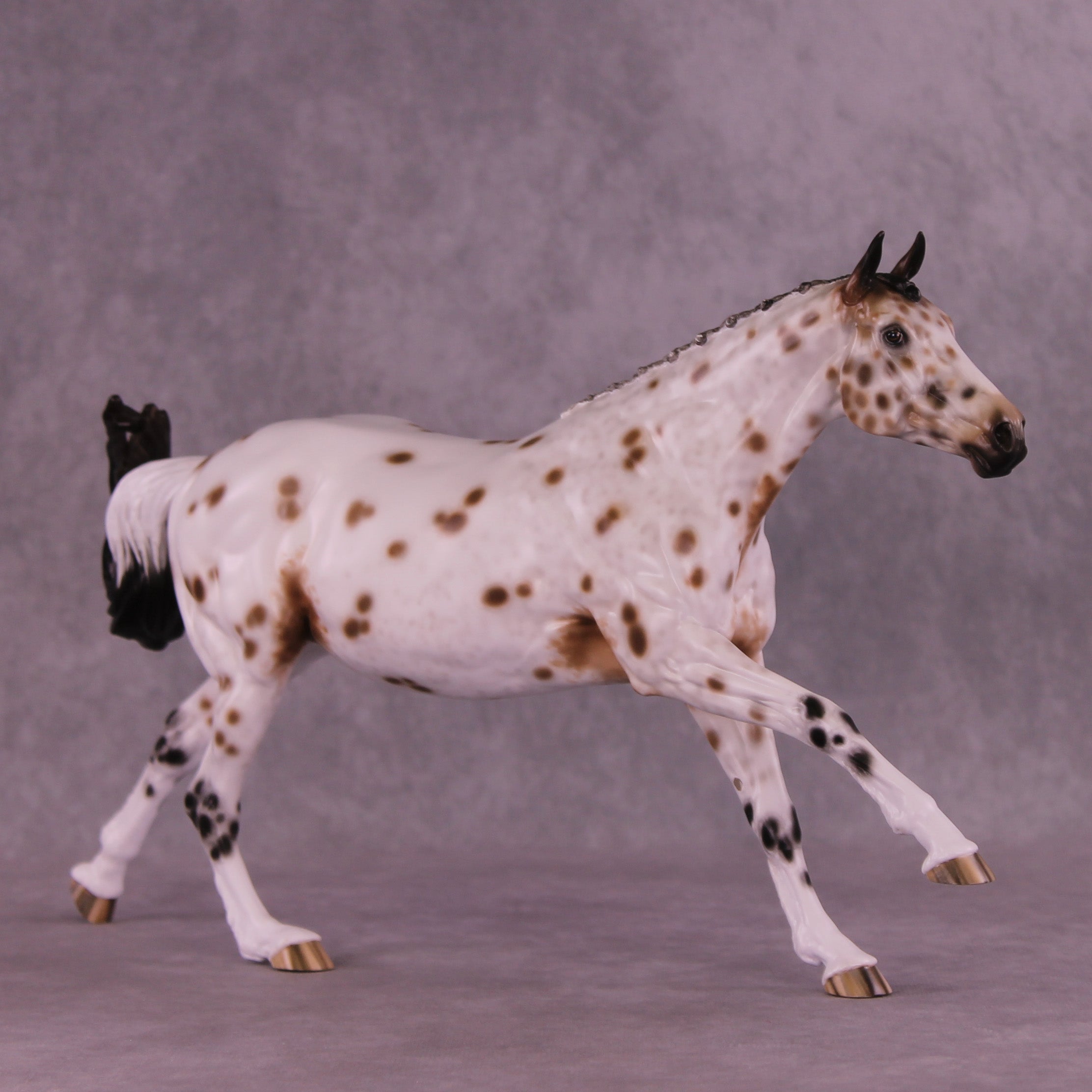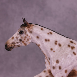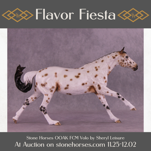 Flavor Fiesta is guaranteed to turn the party! Our Volo sculpture sports her adorable button braided mane and swirly swish tail as well as her clipped ears forward at attention. Her showstopping bay appaloosa coat by Sheryl Leisure featuresan insane level of detail throughout the whole piece, with the perfect balance between hair leveldetailing and scale appropriate softness. Even the tendrils of hair in each braid show the variation in mane color you’d expect on a leopard appaloosa! She is available in all finish options.