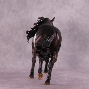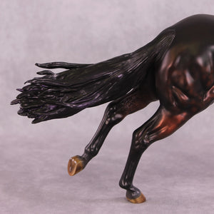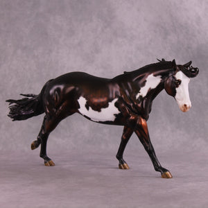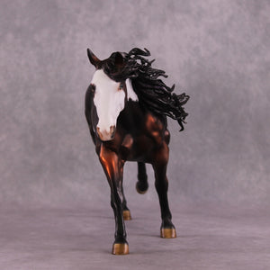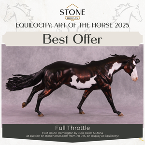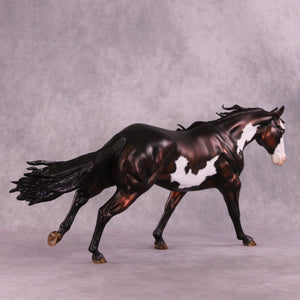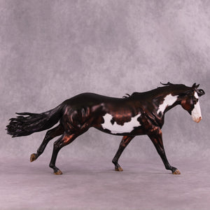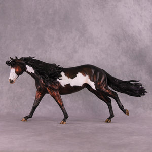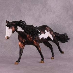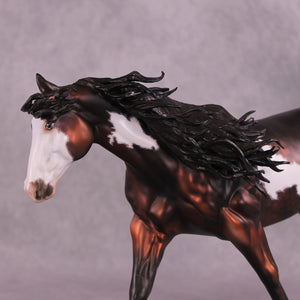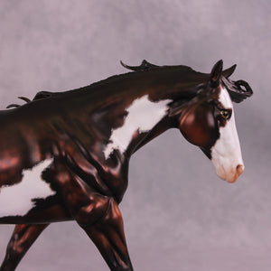 “Full Throttle” begins with our Remington sculpture, and while we do still have some Mona pieces in house, we are getting low. Mona customized this guy with her signature extra-detailed mane, tail, and forelock with extreme tendril detailing showing the dynamic movement of this piece. Julie painted him to a gorgeous metallic dappled deep red bay overo pinto with etched marking edges, and a big bald face with one blue eye and one brown!