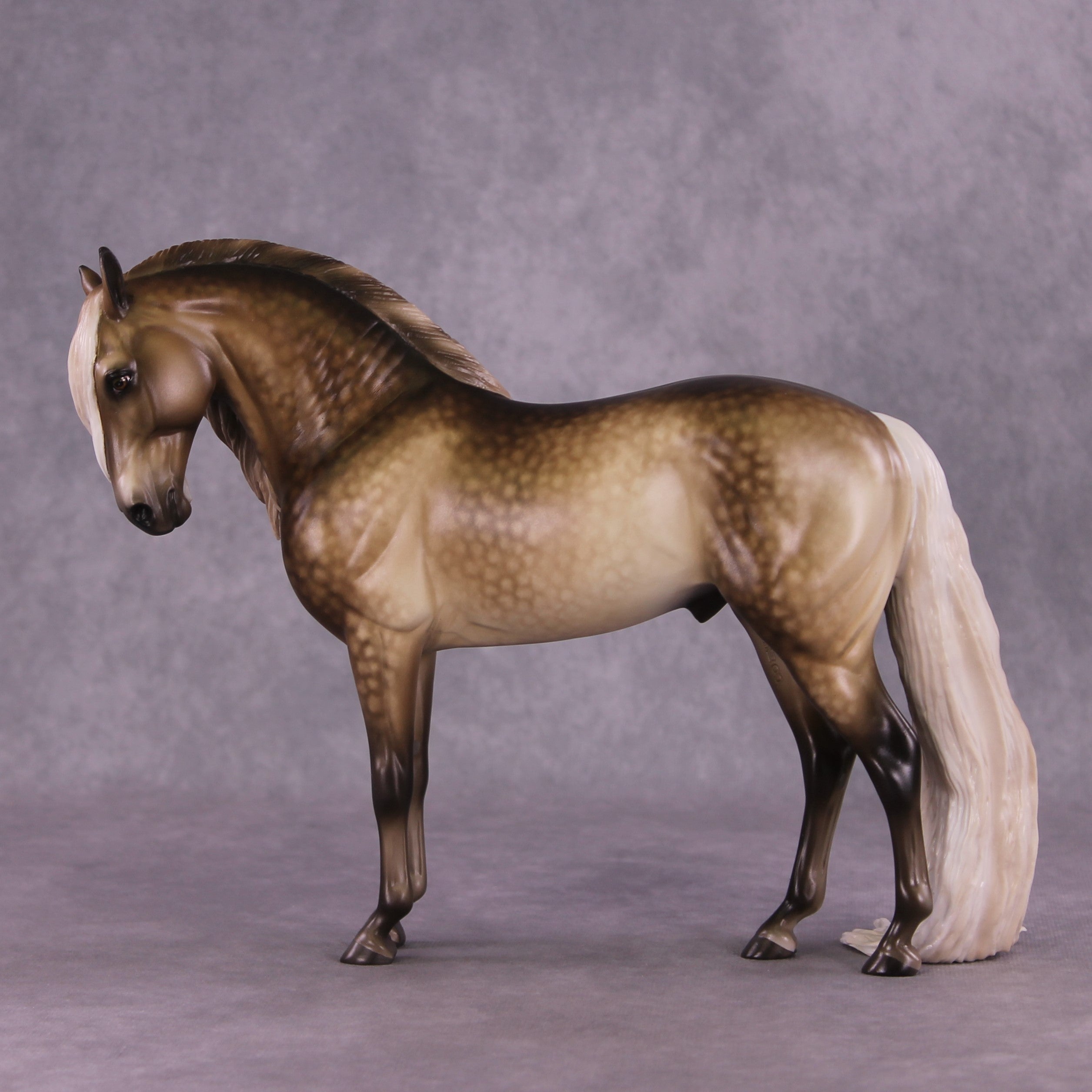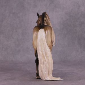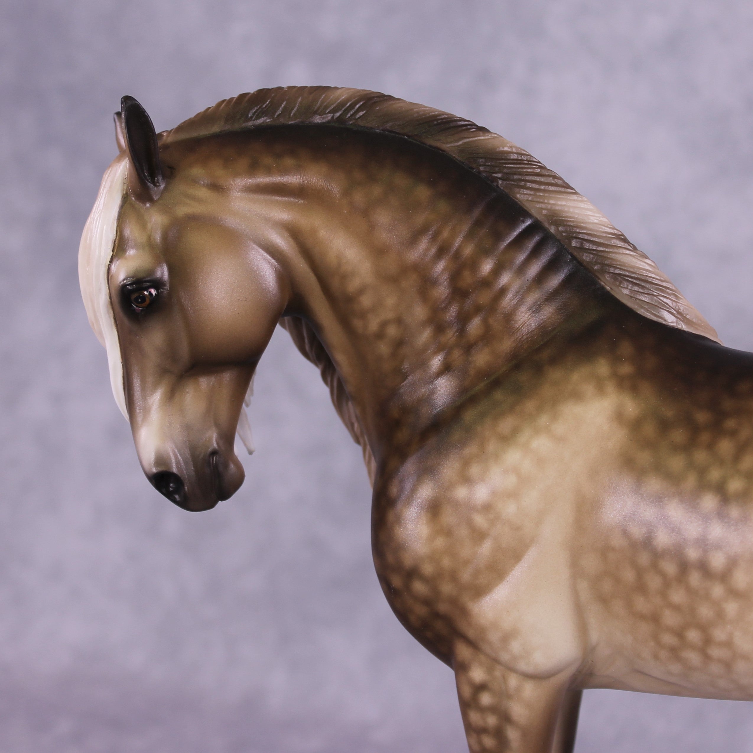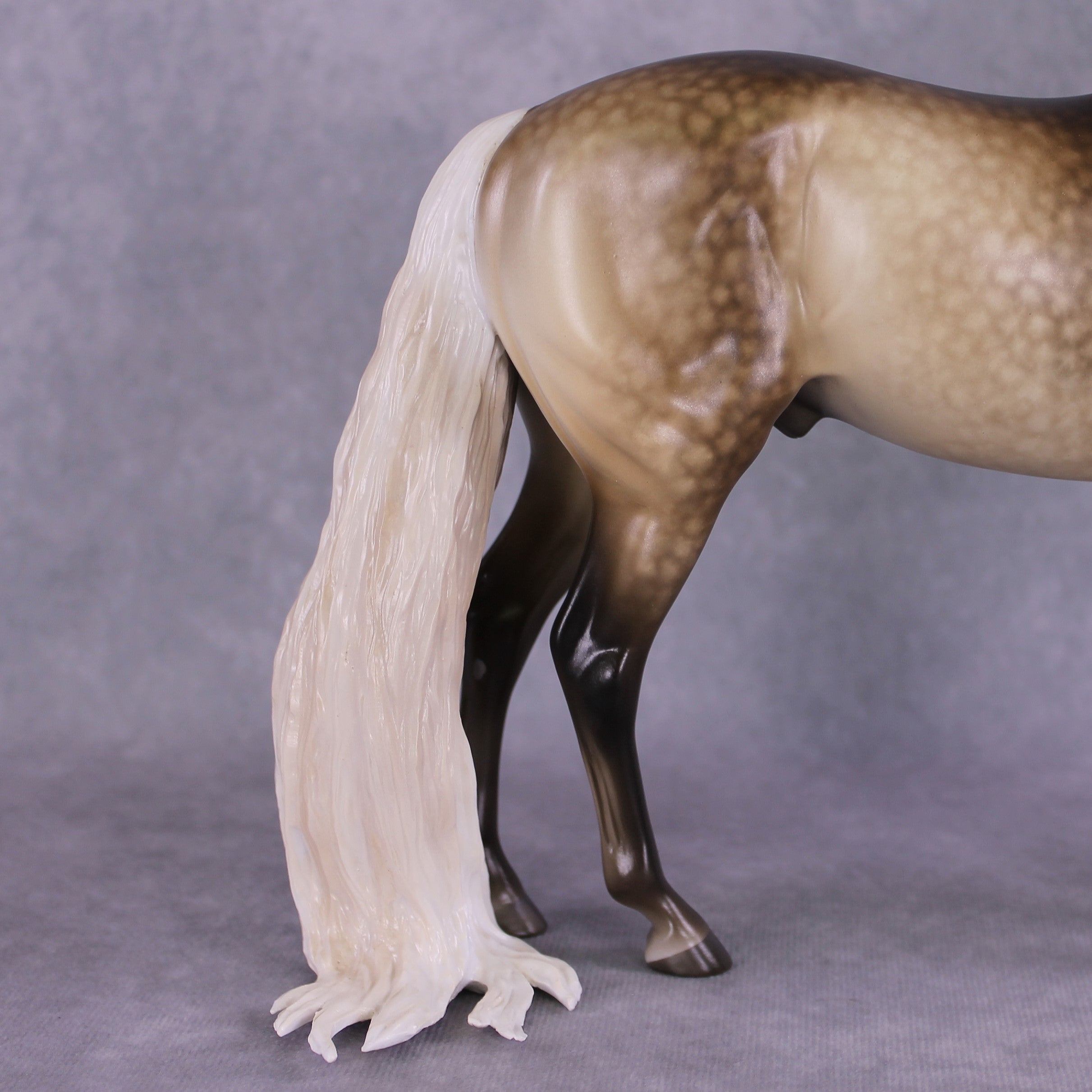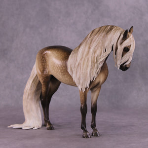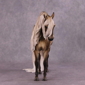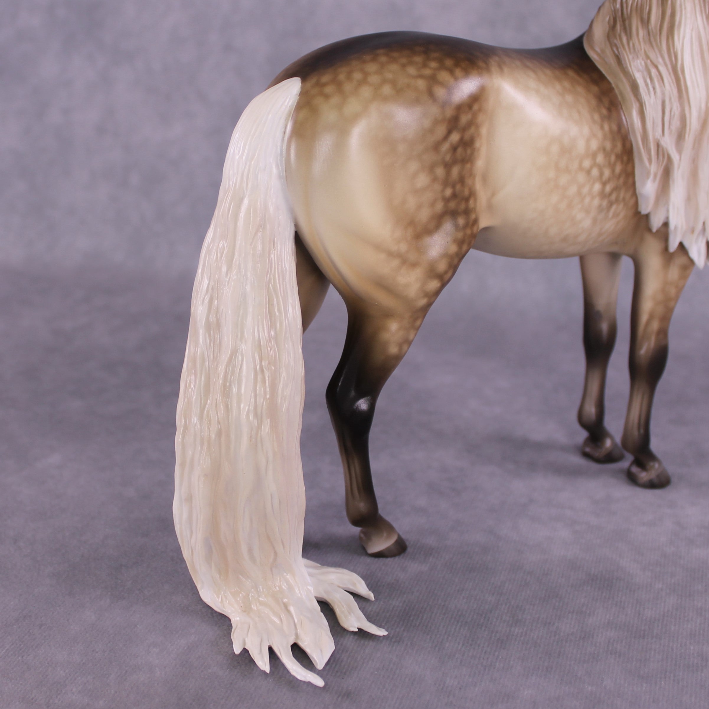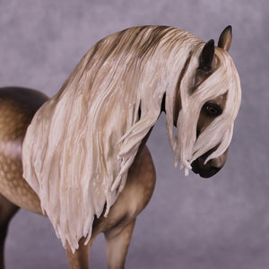 “Fulvous” begins with our popular Andalusian stallion, and Mona only added to his appeal by giving him a subtle head tuck and turn, and then loads of extra detailed mane, tail, and forelock with tendril detailing and soft flowing motion. Sheryl then finished him to a stunning dappled silver buckskin with incredible shading and contrast through the whole piece. He is a stunner!