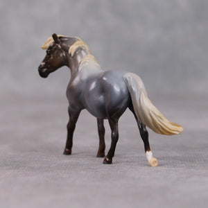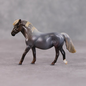 “Funnel Cake” is just as sweet as her namesake. Kristen gave her a little head turn and a gentle tail swish, and then painted her to a lovely silver black roan to set off her fuzzy little mane and tail. She is currently satin matte and extra finish is available on this piece.