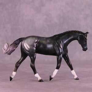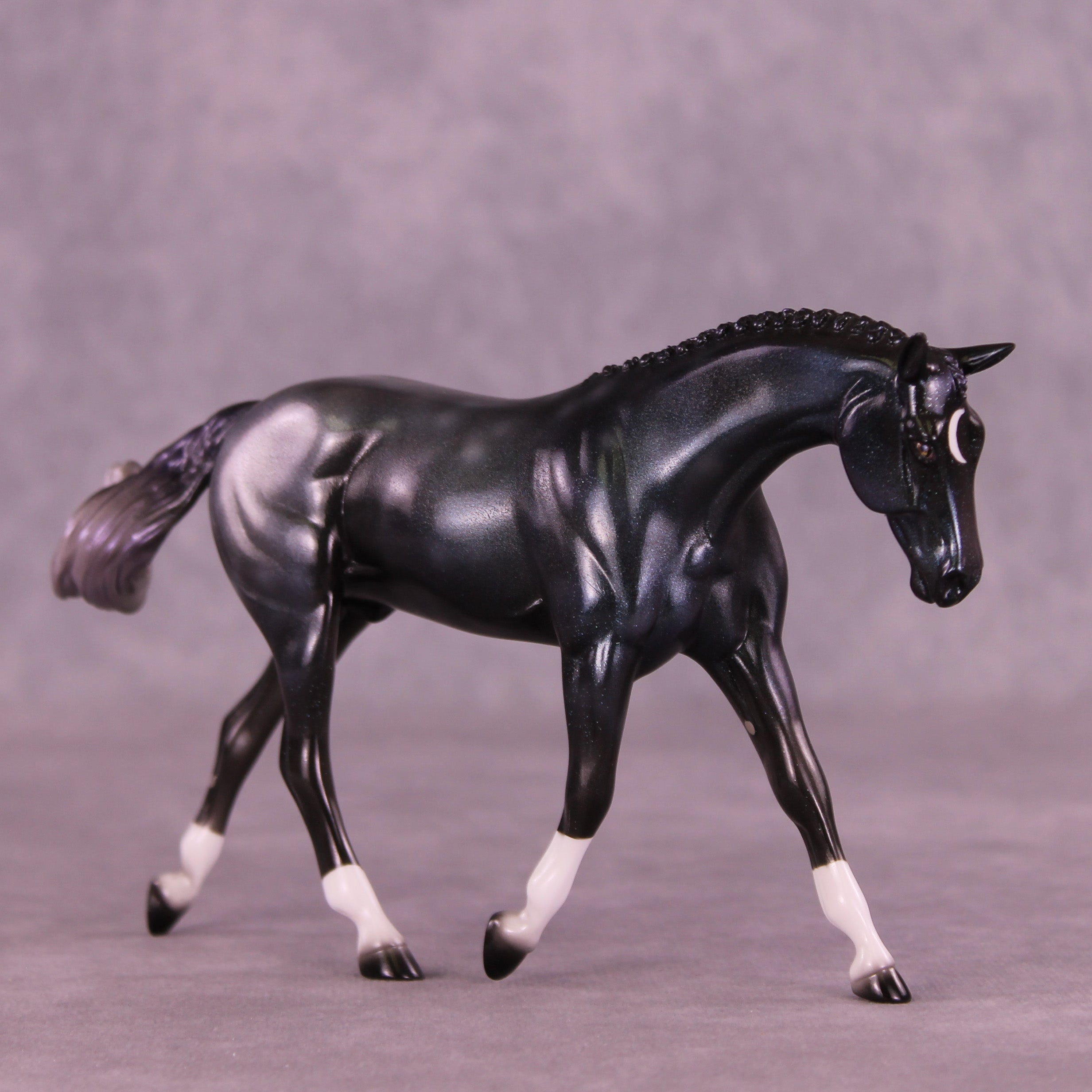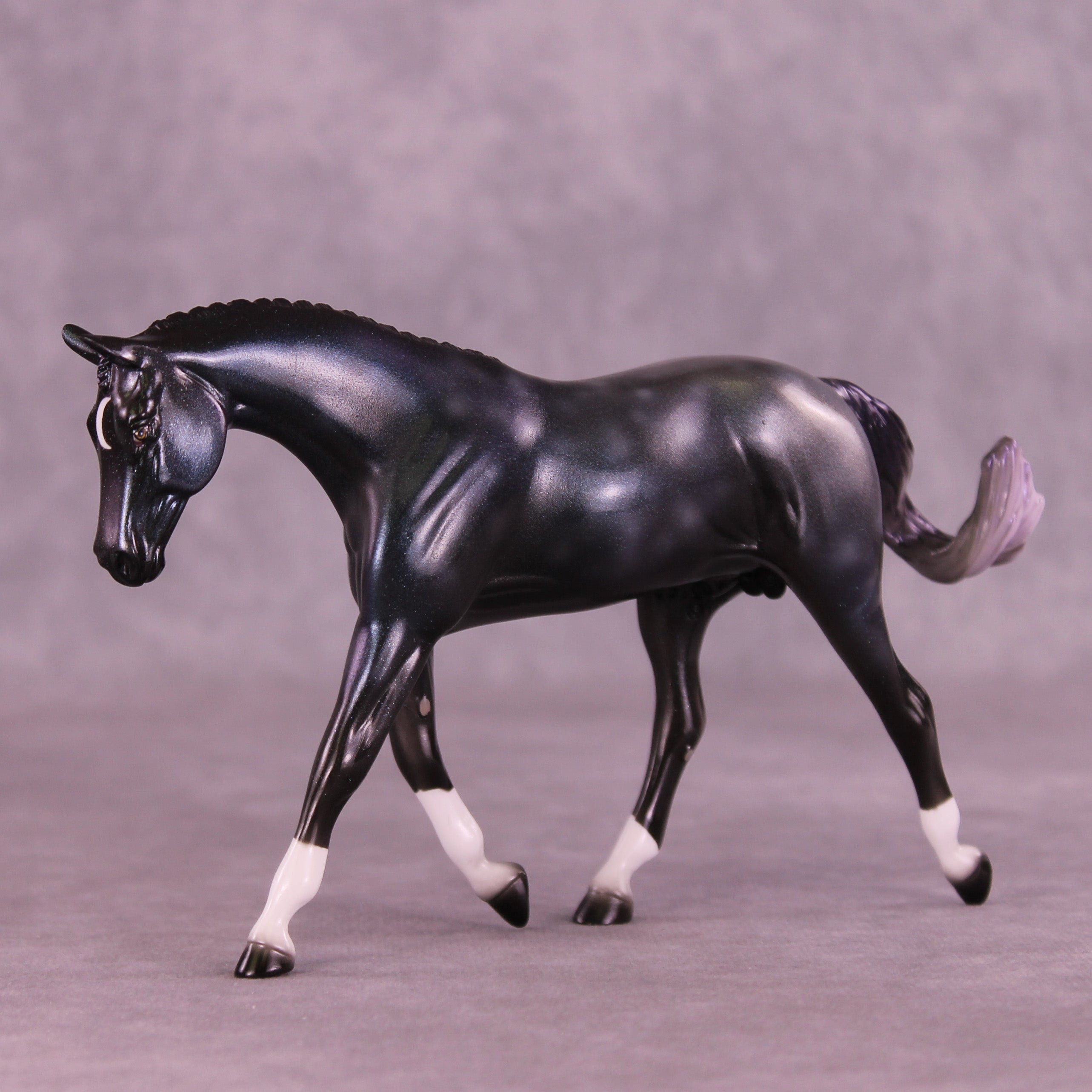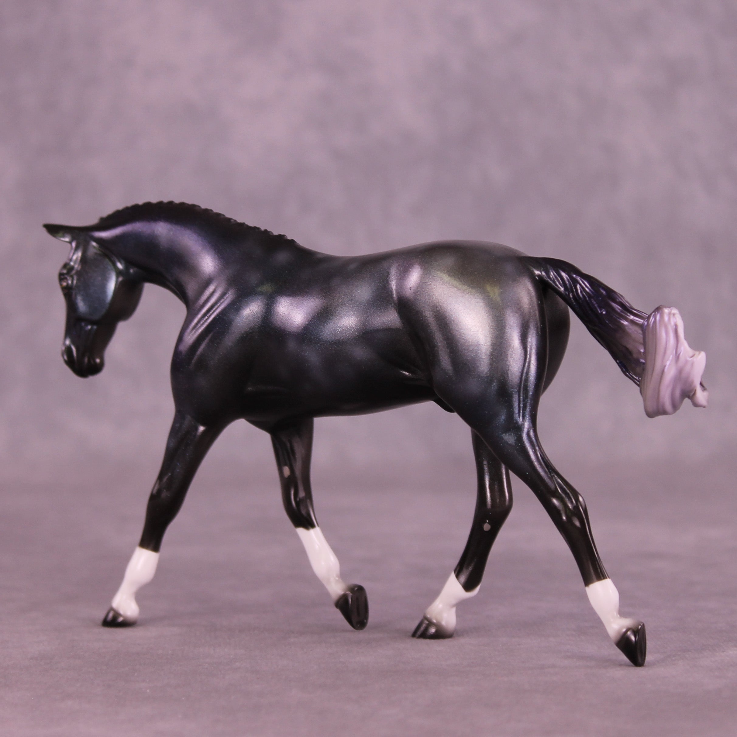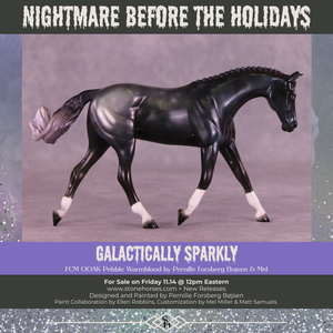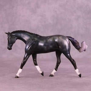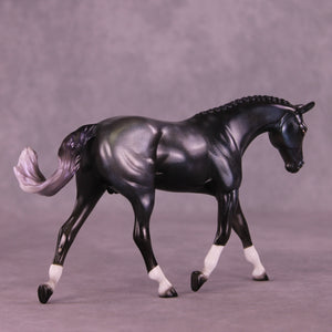 This one is a everything horse. Starting with our Pebble Warmblood with a customized swirling swishing tail by Mel, he got a moon, socks and 3 or 4 types of holographic paint. One could say he was some sort of colorful yet black and grey toned experiment that escaped the factory. He is definitely sparkly in his own way.
