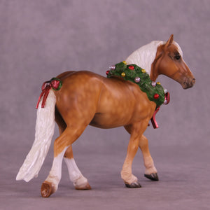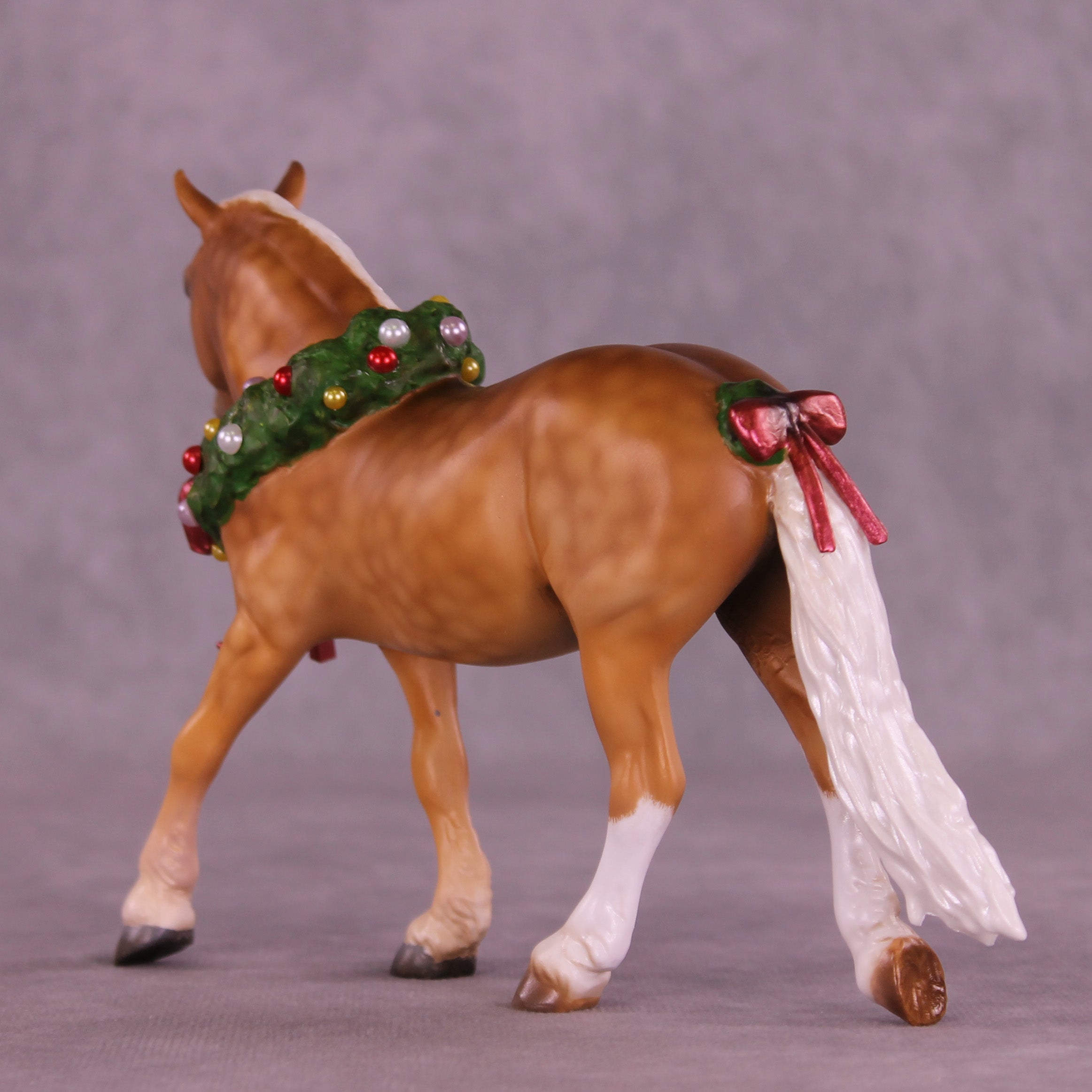 What a festive look for our Pebble Drafter! Kristen gave him a lovely customized turned head, a whole new customized long tail, and – the star of the show – a permanently sculpted-on green wreath with a big red bow both in the top of his tail and on the wreath! Kristen painted him to a stunning dappled palomino with two socks and a blaze – the ideal pony for Christmas. He comes in matte finish and finish changes are not offered on this piece.