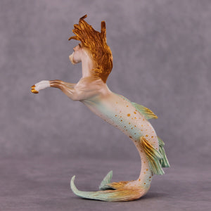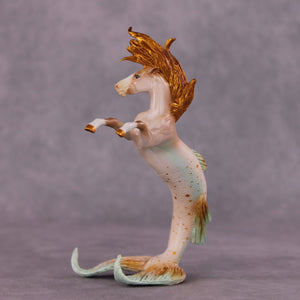 Does it get more drastic of a factory custom than when half the horse is gone? We’re not sure, but this guy is a STUNNING representation of a hippocampus by Kristen. She took our Chip Rearing Horse mold and turned his bottom half into a gorgeously scaled and detailed fish, gave him a whole new mane and forelock that is flying up with the current, and then painted him to a beautifully blended golden pearly cream with teal accenting and shading. Stunning.