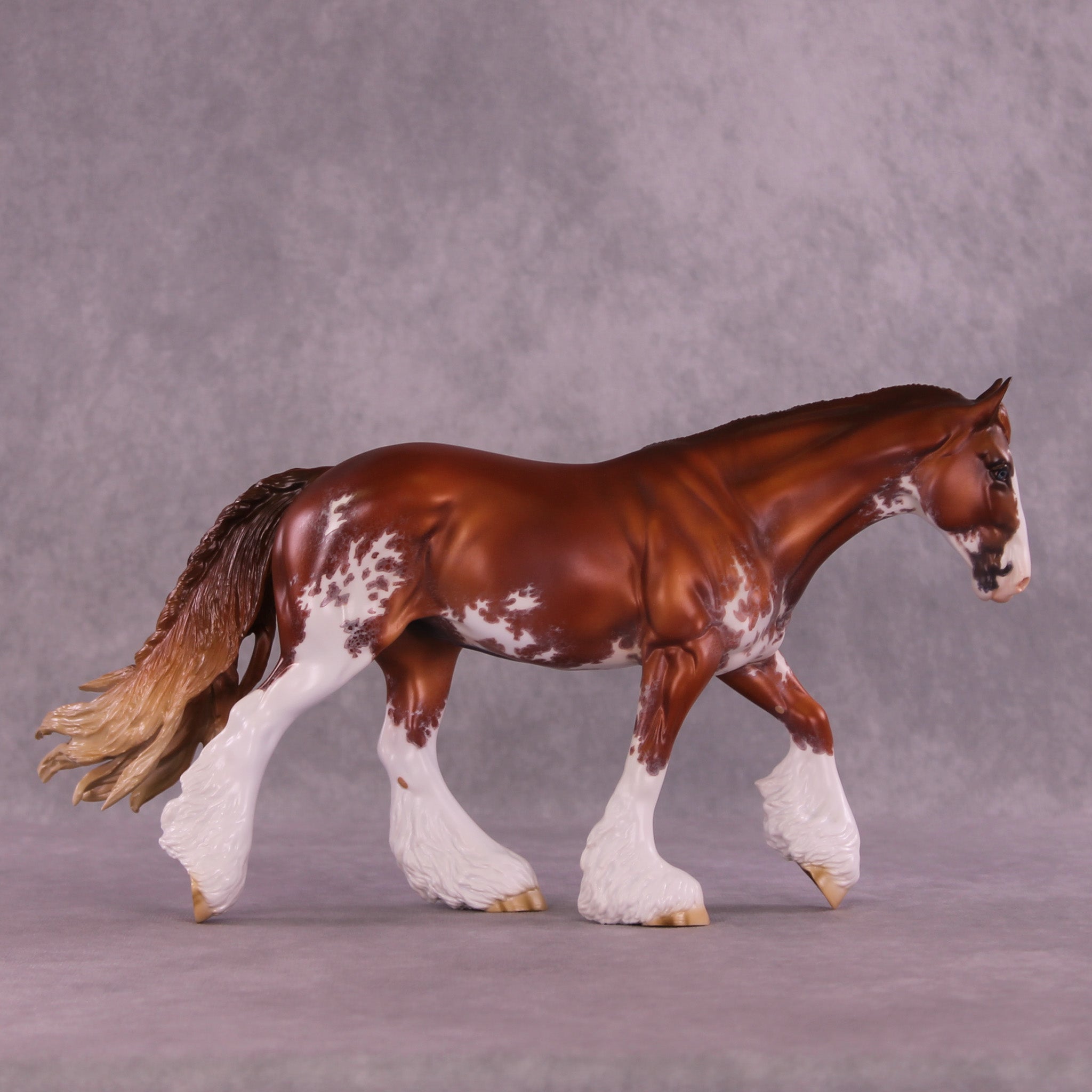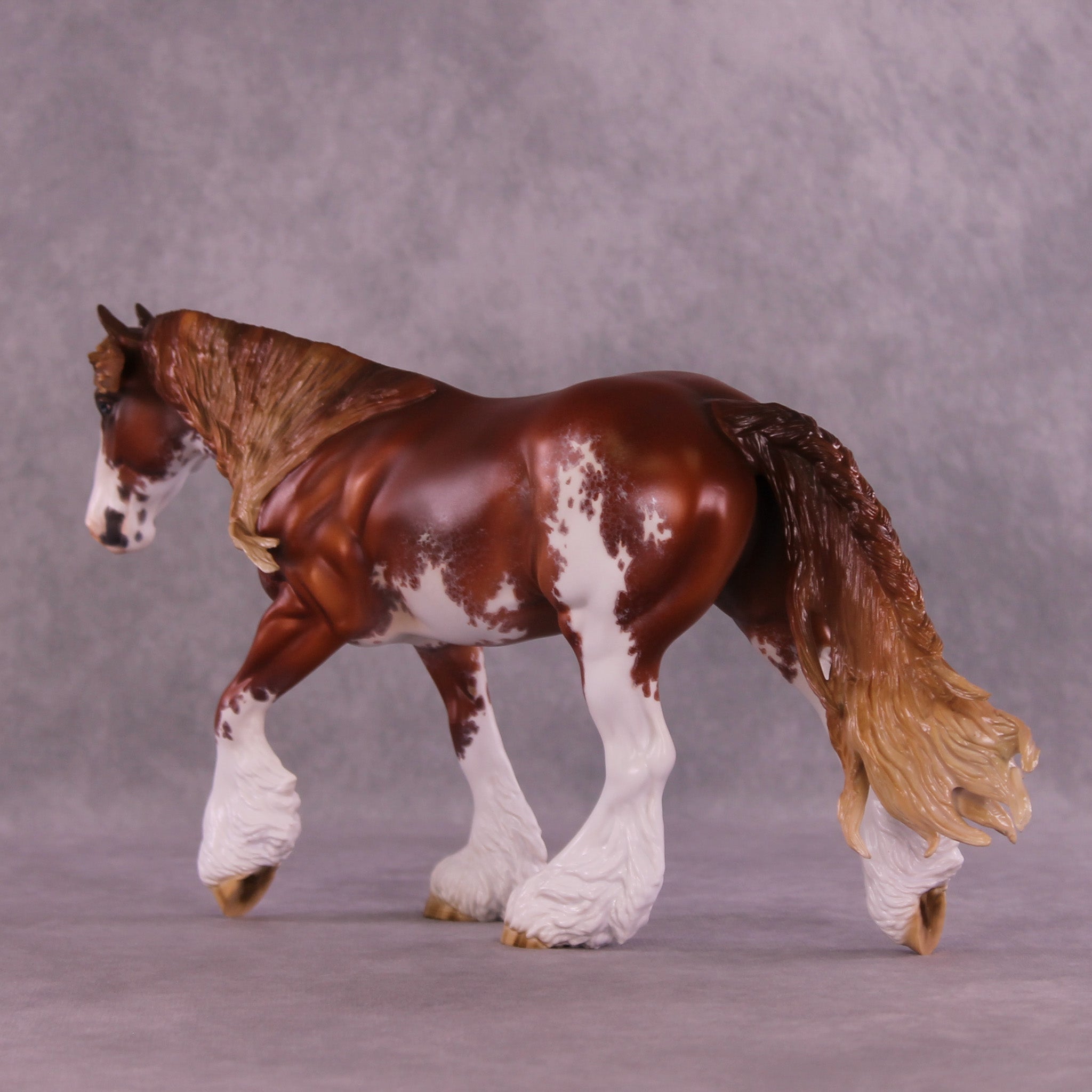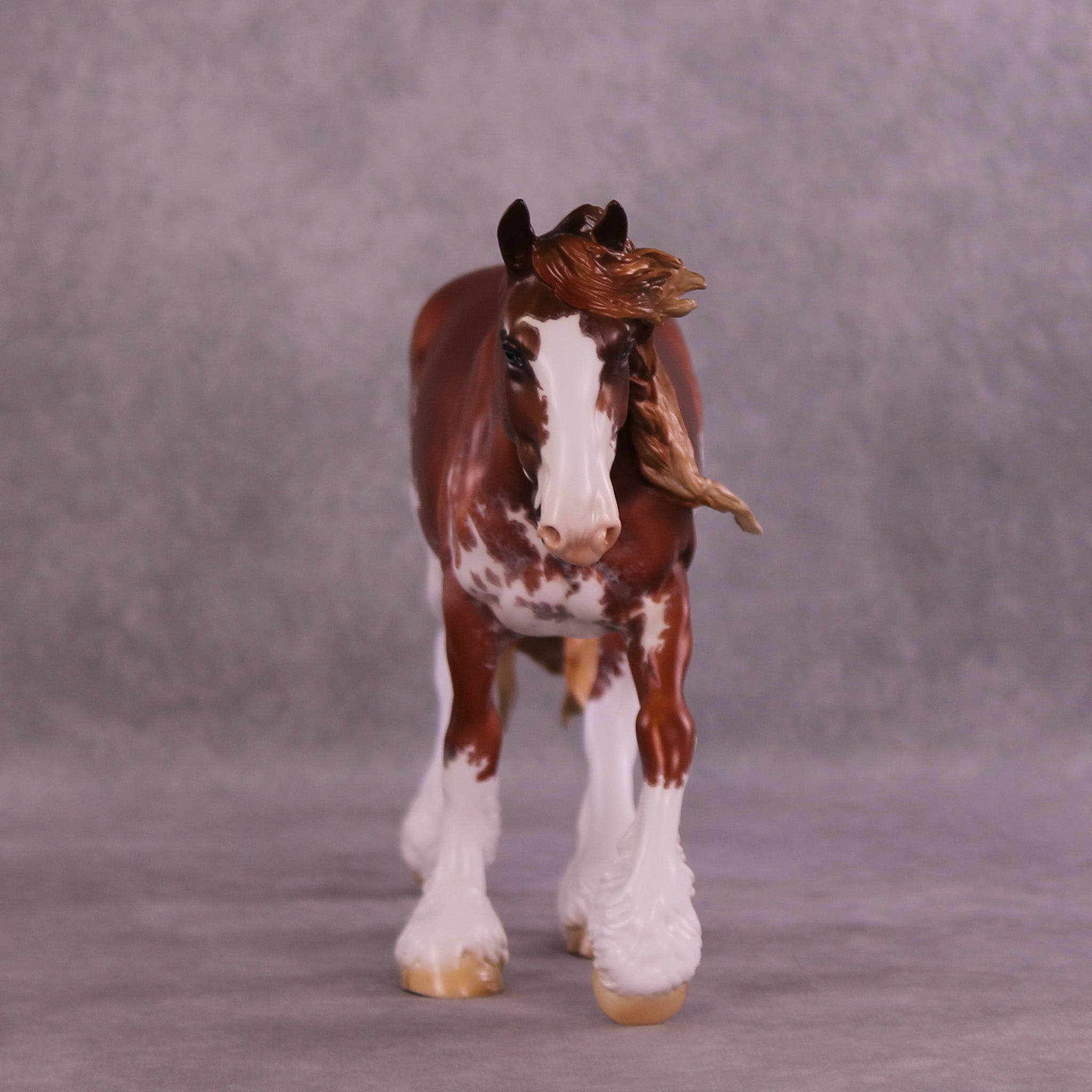 This piece began with our Irish Cob sculpture, and Carissa went to town on his customizing. She gave him a straightened head and neck profile, and then a whole new mane and tail with loosely playful braids woven through the tendril detailing. Imagine this gentle cob spending the afternoon in turnout, getting lovingly braided by his favorite human on a whim – this is that horse in model form. Jess painted him to one of her iconic sabino designs, with intricately detailed patterning and hair by hair markings over a warm chestnut coat with the perfect amount of depth and sheen to bring him to life. This is a standout piece.