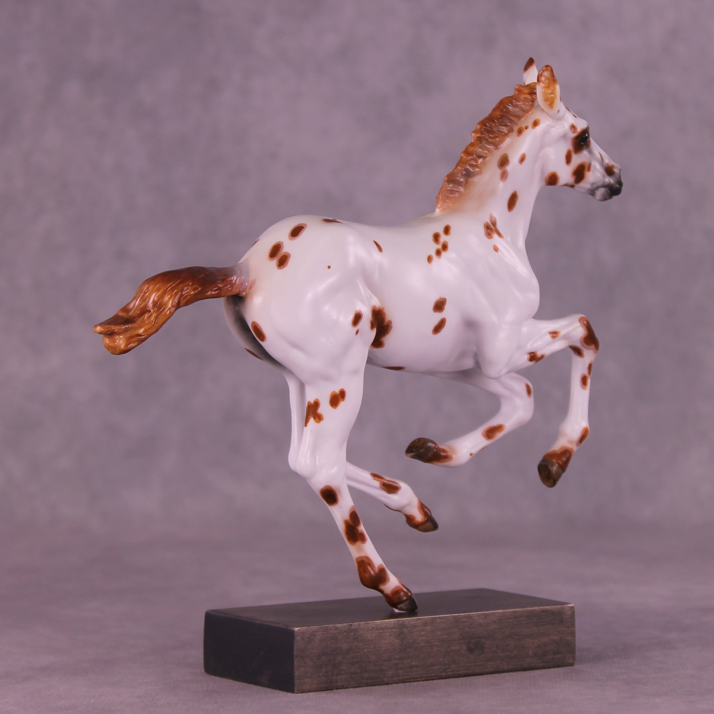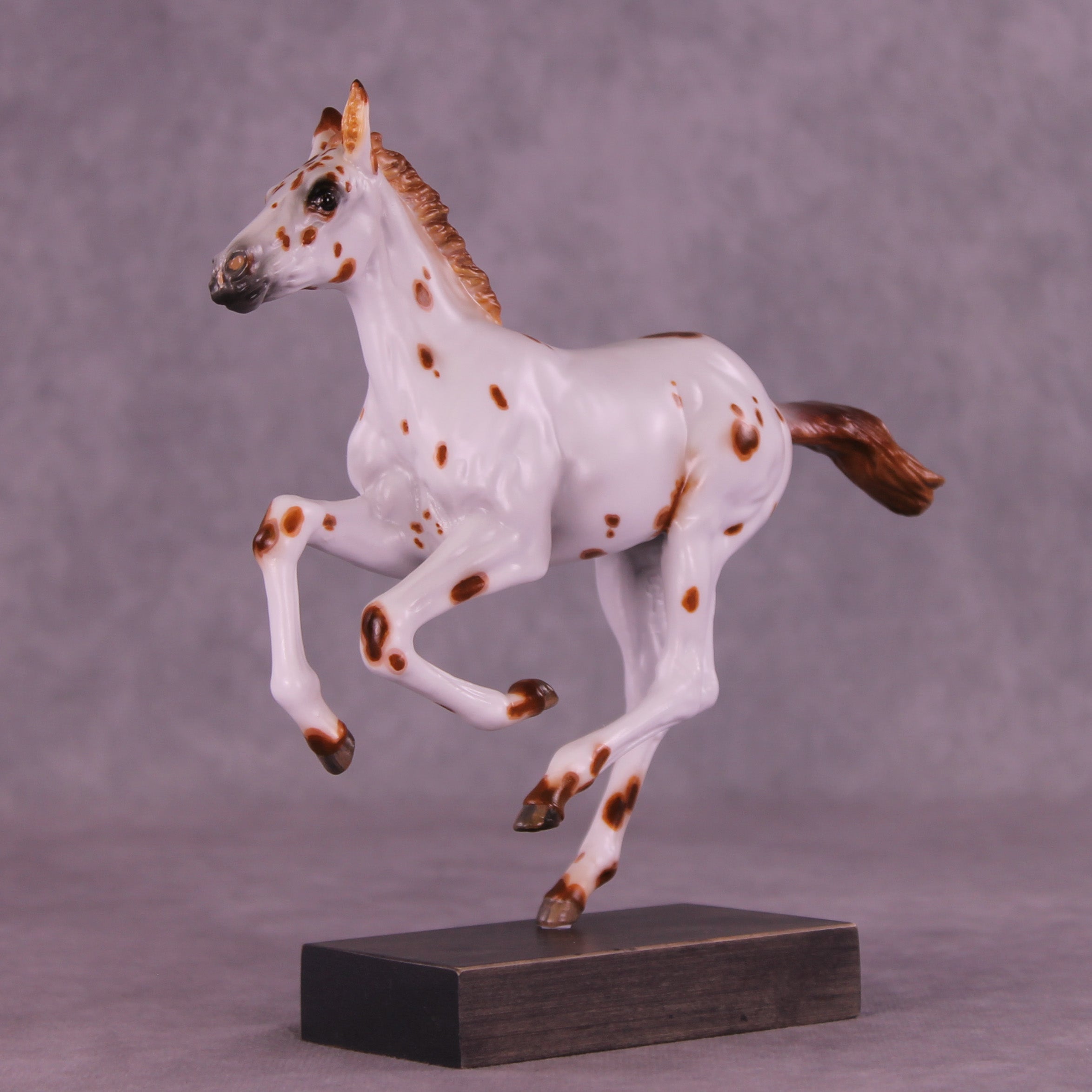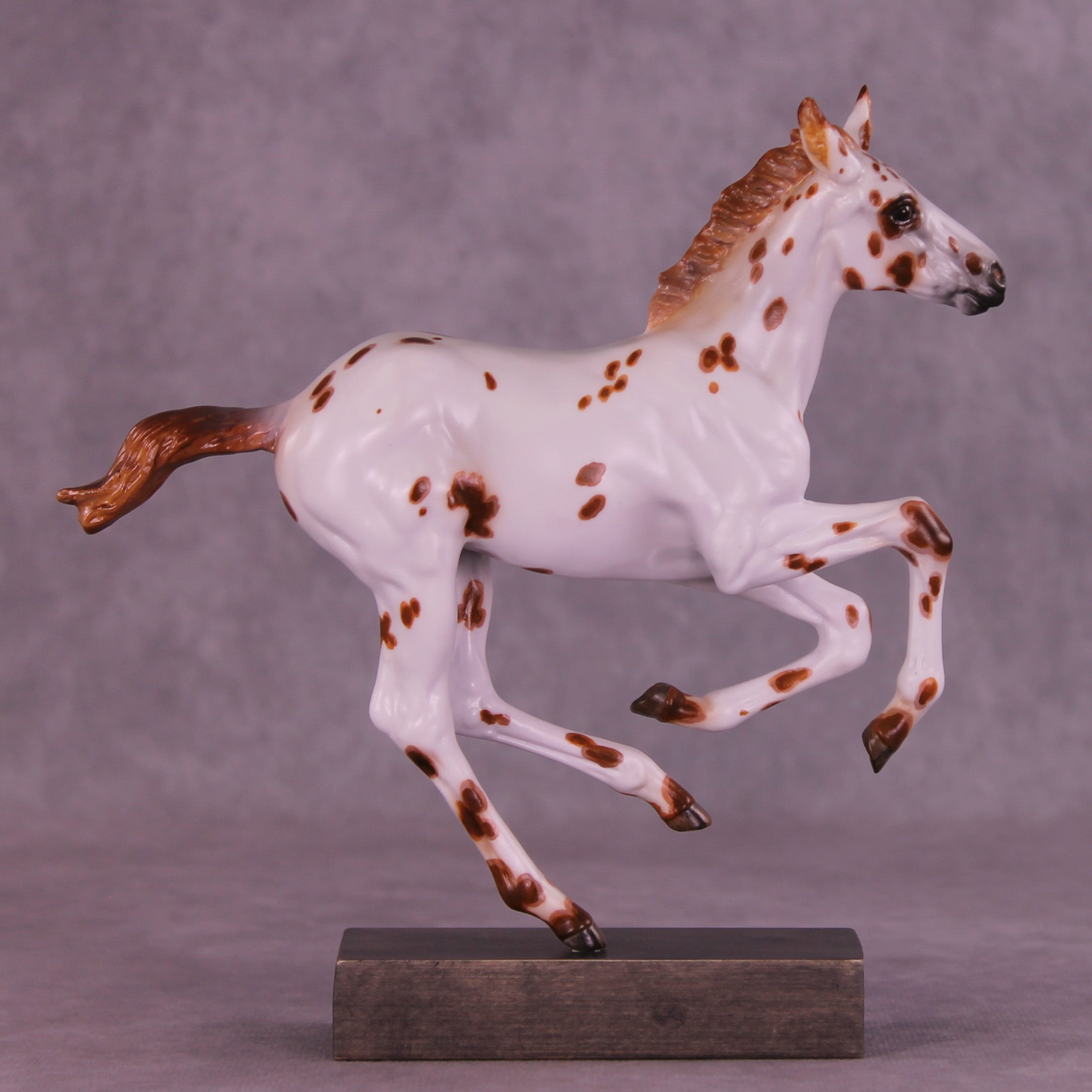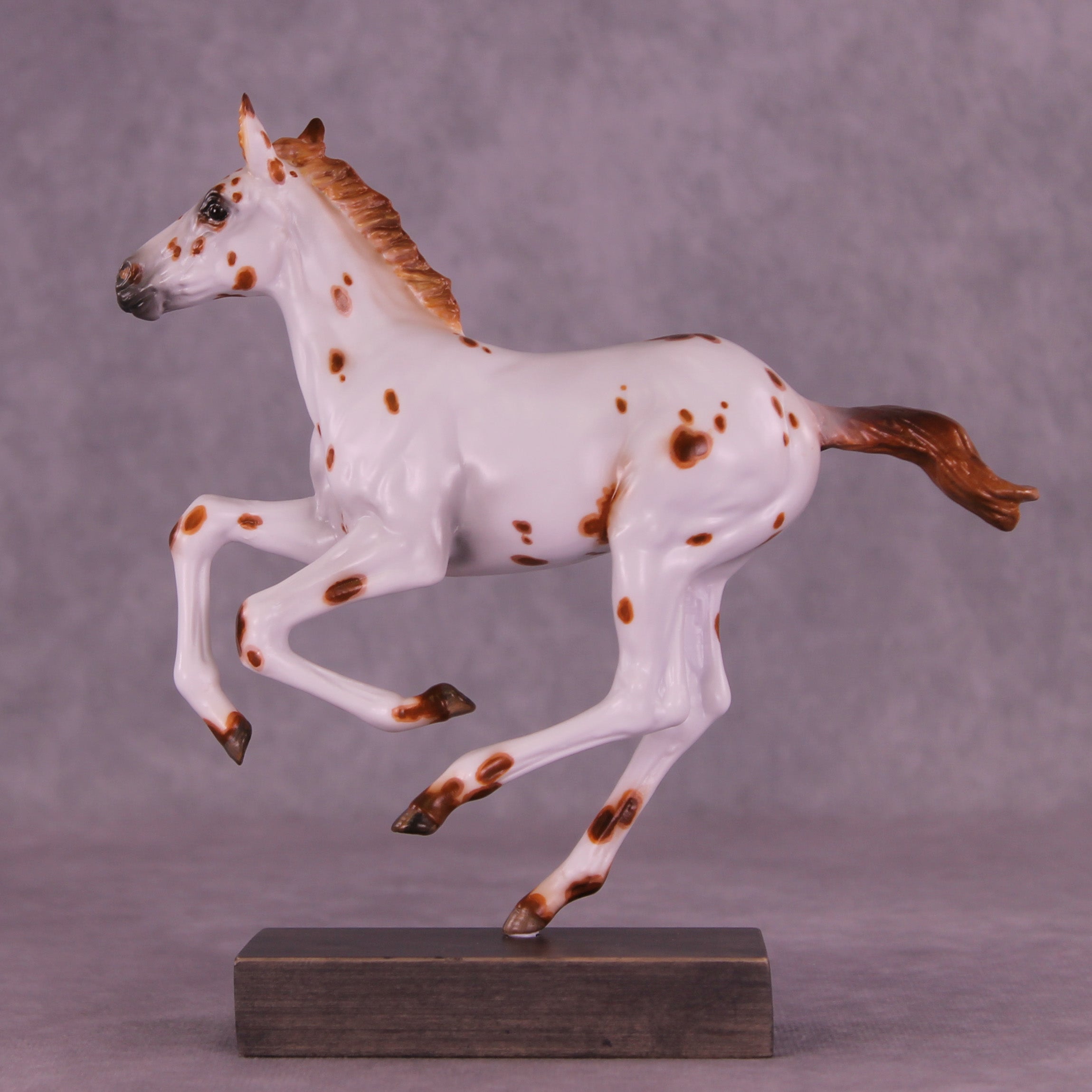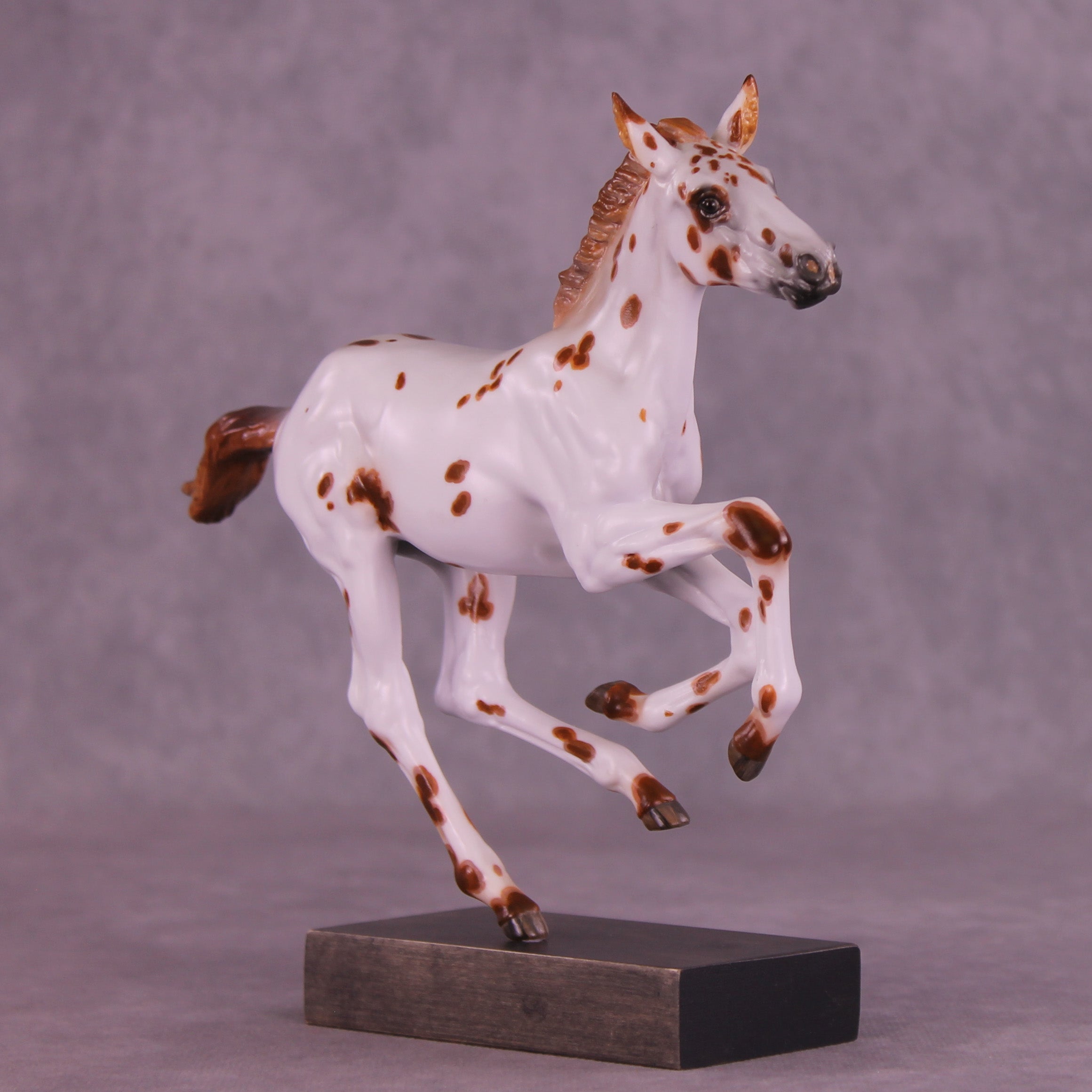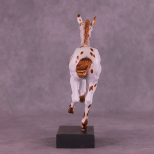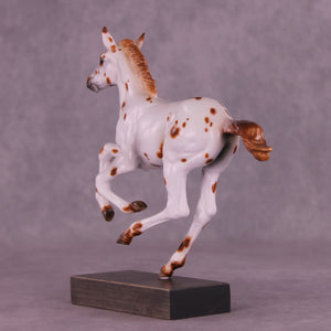Who doesn’t love a spotted baby? Girl in Red is a quintessential leopard appaloosa foal on our Pimento sculpture, complete with a twitched ear. Kristen Cermele painted her in a chestnut leopard appaloosa pattern with hand painted spot mapping, dark brown eyes, and lovely striped hooves. She is a gorgeous model ready to enter your collection. She comes in slightly satin matte finish and no finish changes are offered on this piece.