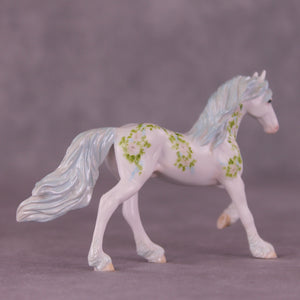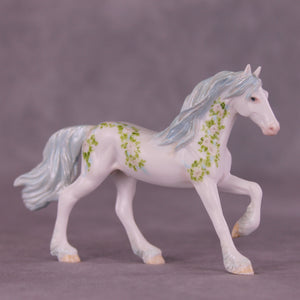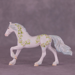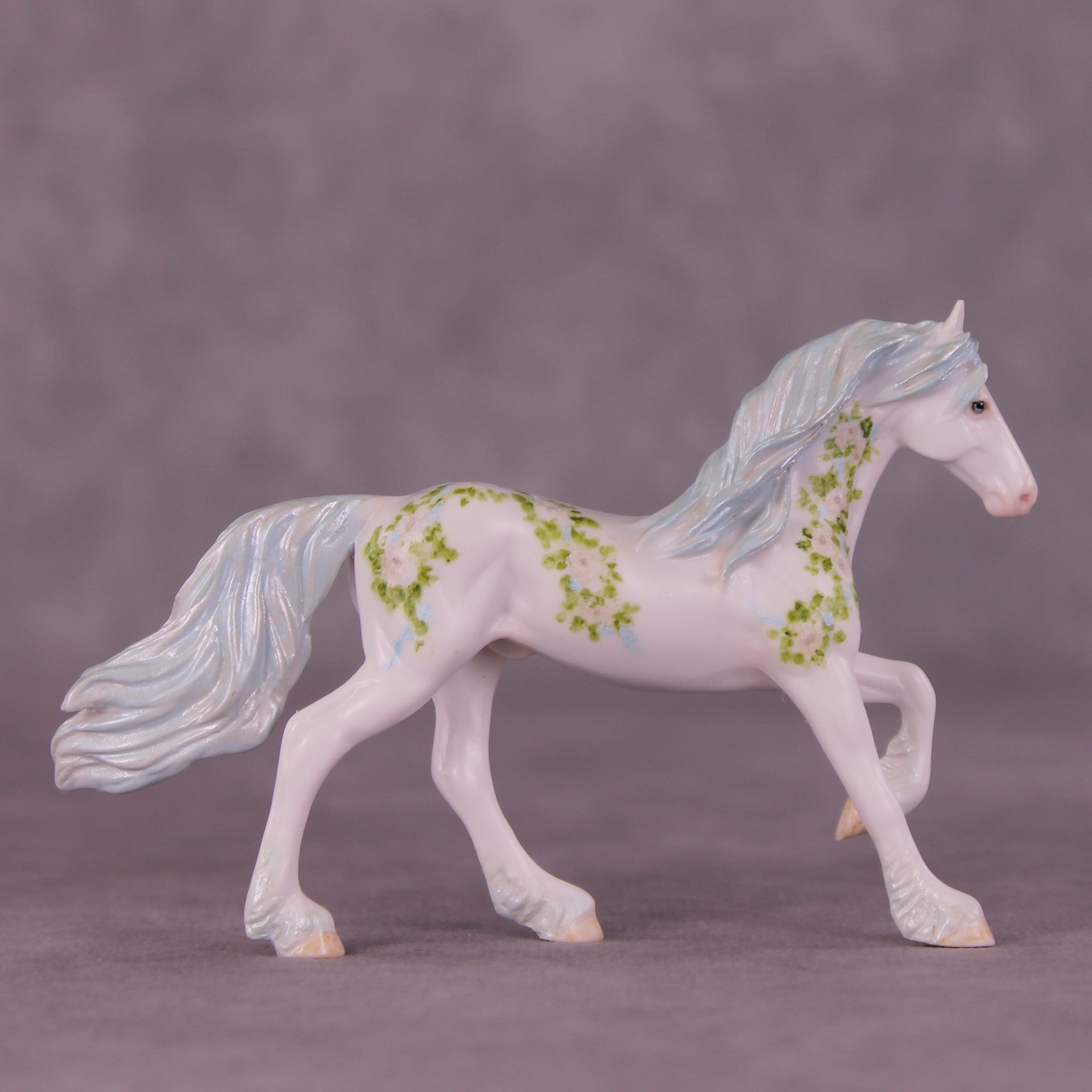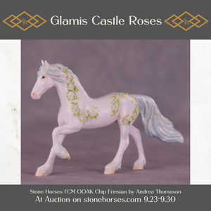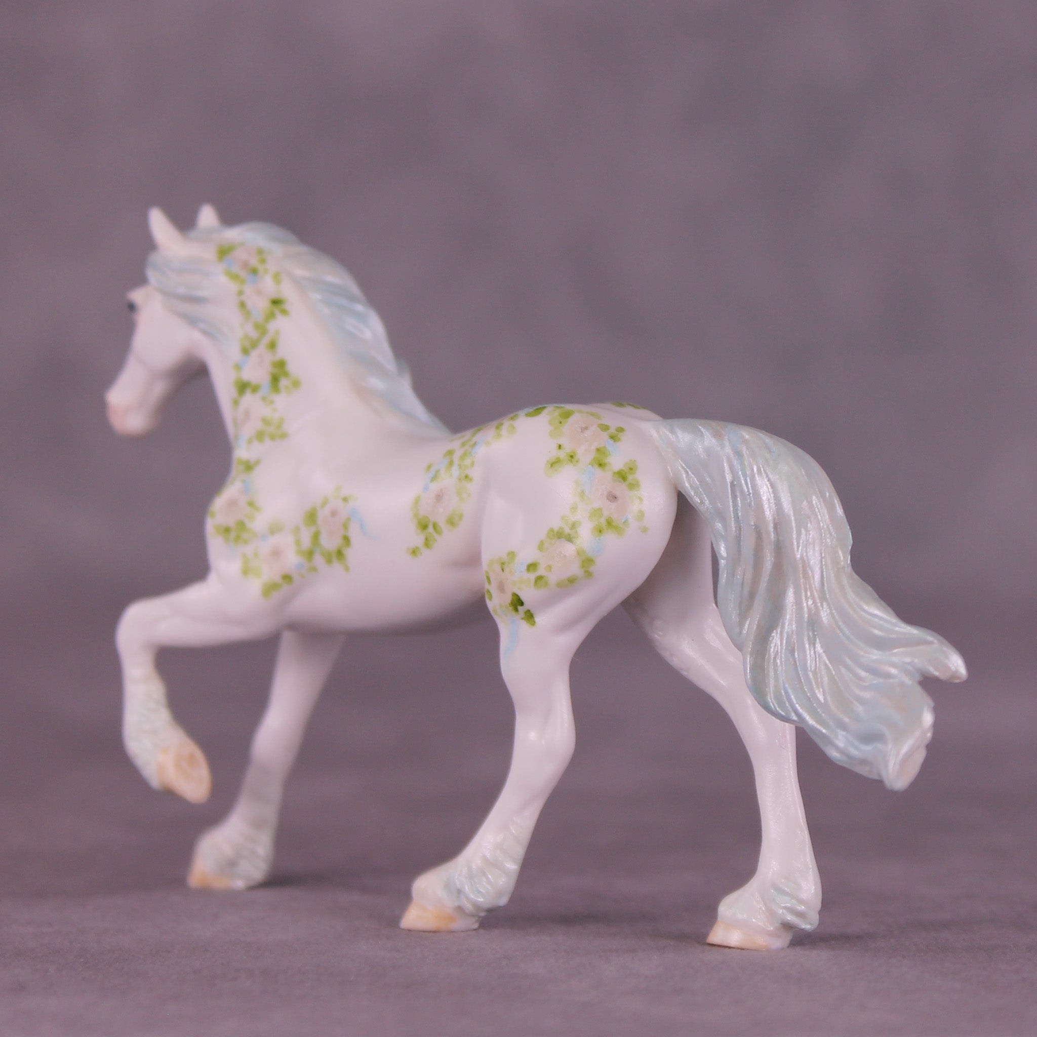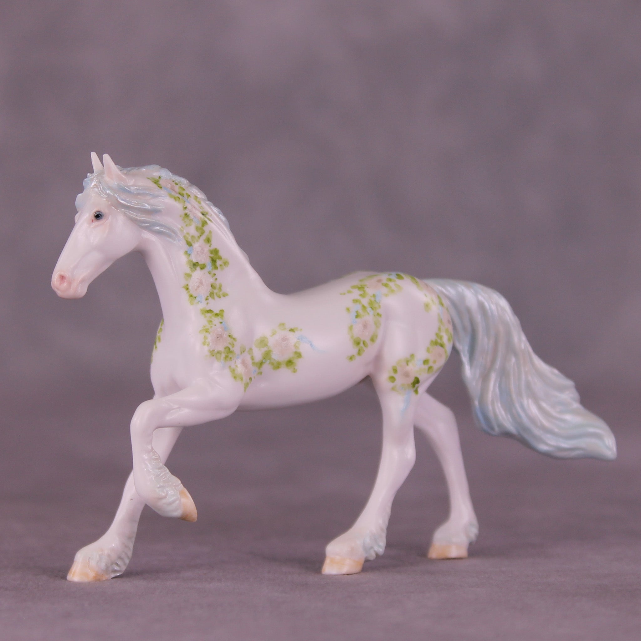 We just love this piece! Another installment of Andrea Thomason’s stunning monthly roses series, this model features delicately hand painted roses and leaves, flowing in a vine pattern to complement the sculptural features of our Chip Friesian. He also has delicate touches of customization in his mane and tail, complete with pearl blue tones in his mane, tail, and feathering.