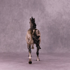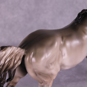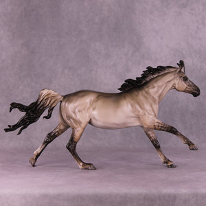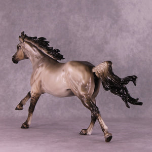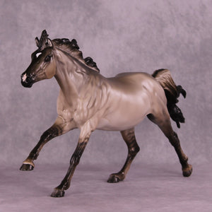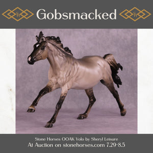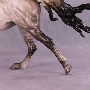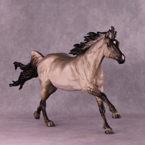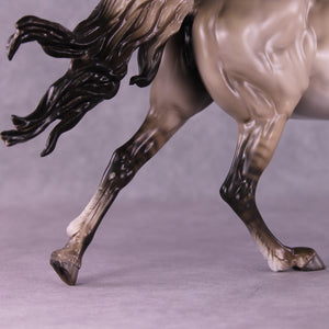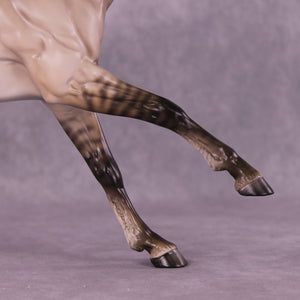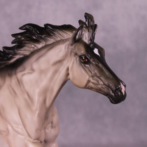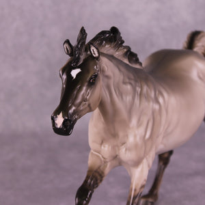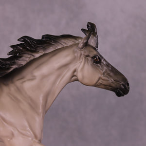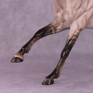 Gobsmacked is our Volo sculpture with both fuzzy ears forward, her loose mane with flying forelock, and long loose tail. Sheryl painted her to a stunning grulla with all the extensive dun factors that make this color so lovely, including shading at the roots of her mane and tail, a dorsal stripe, and extensive leg barring along with a beautiful star and snip. Sheryl did extra refining on the sculpture’s facial features, along with details like subtle hoof striping and etching along marking edges.