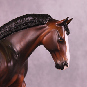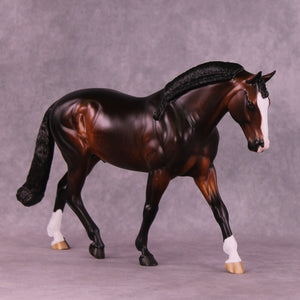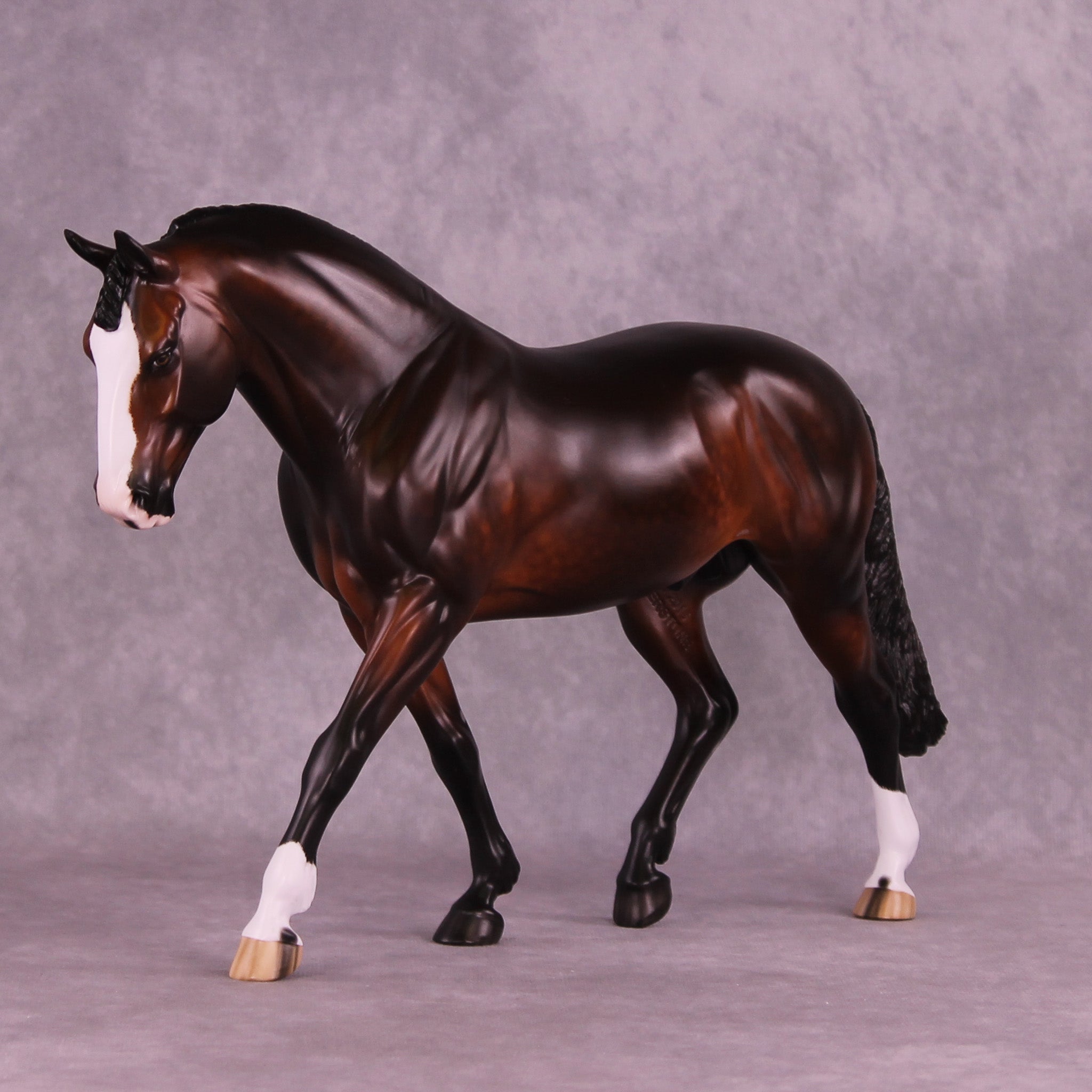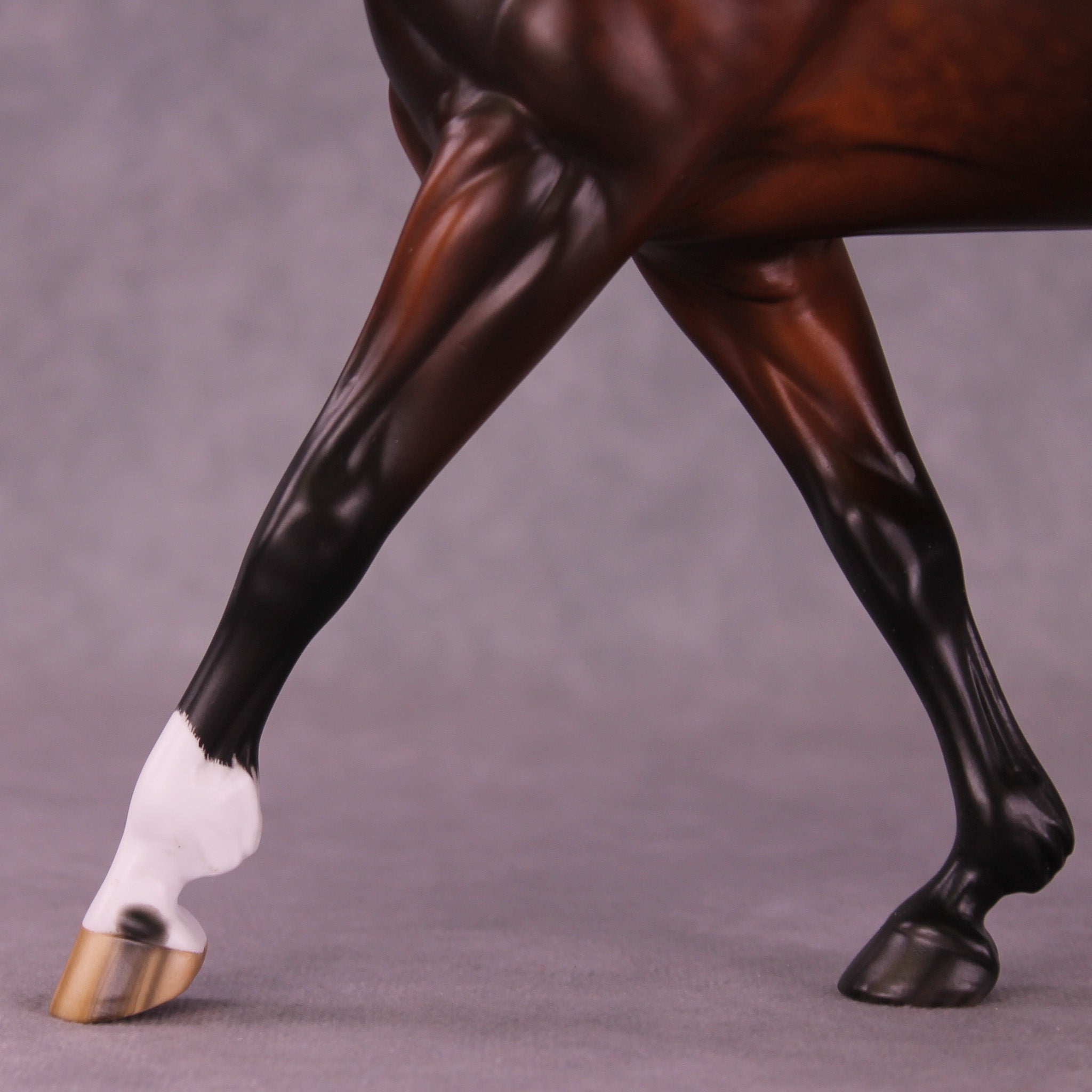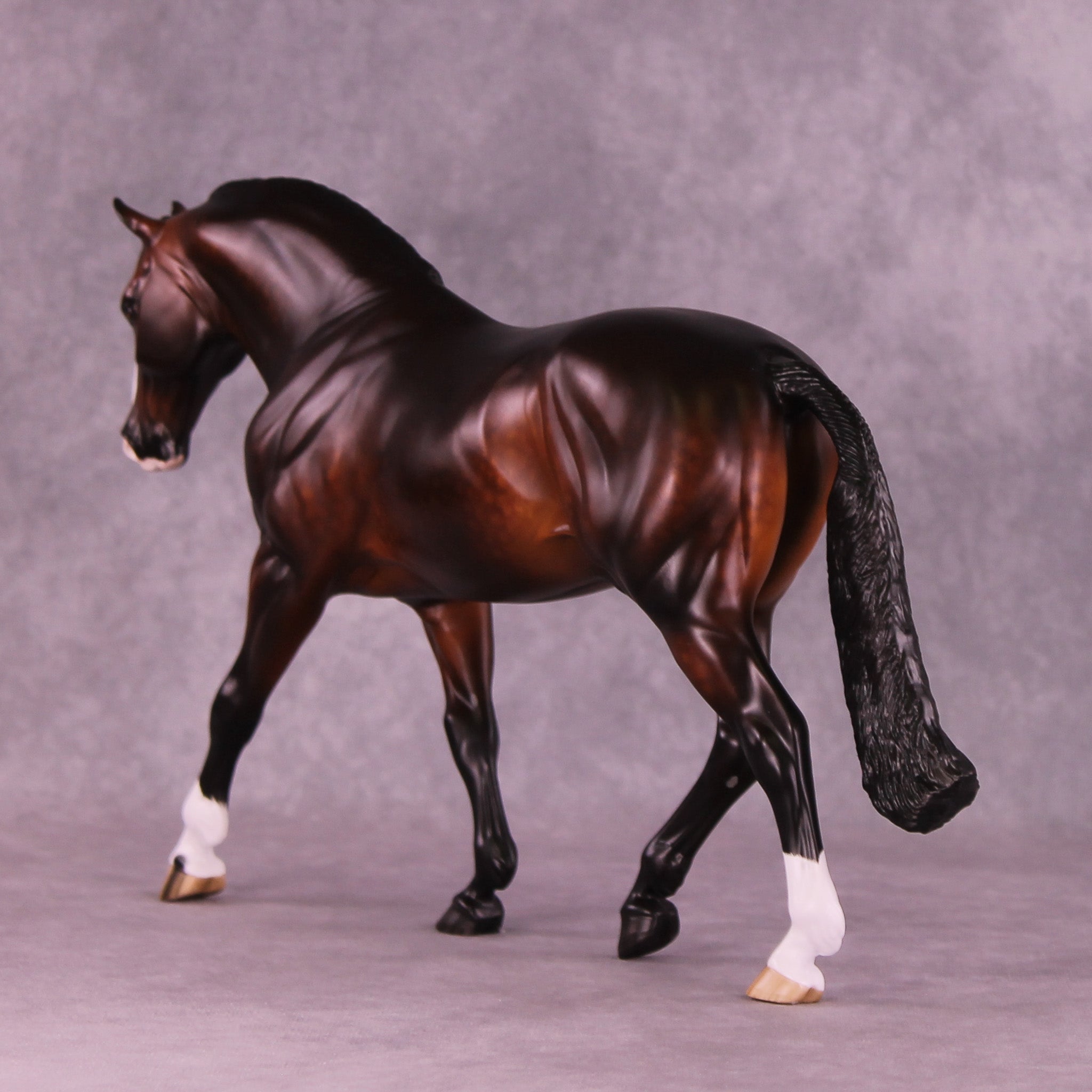 What’s better than a prim and proper dappled bay hunter? Not much, we say! Our Irish Draught mold is sporting a customized running braided mane here, with matching braided forelock and braided tail. Sheryl painted him to a stunning deep dappled bay with a wide shaded blaze and two socks with striped hooves – this piece really glows in person! All finish options are available on this piece.