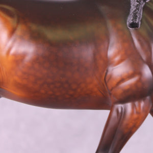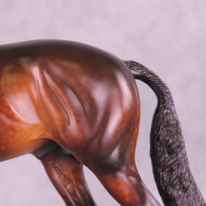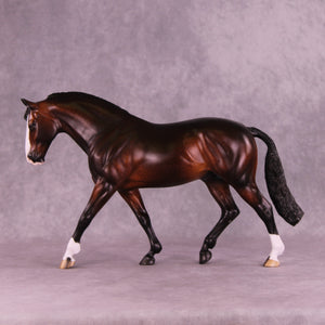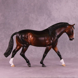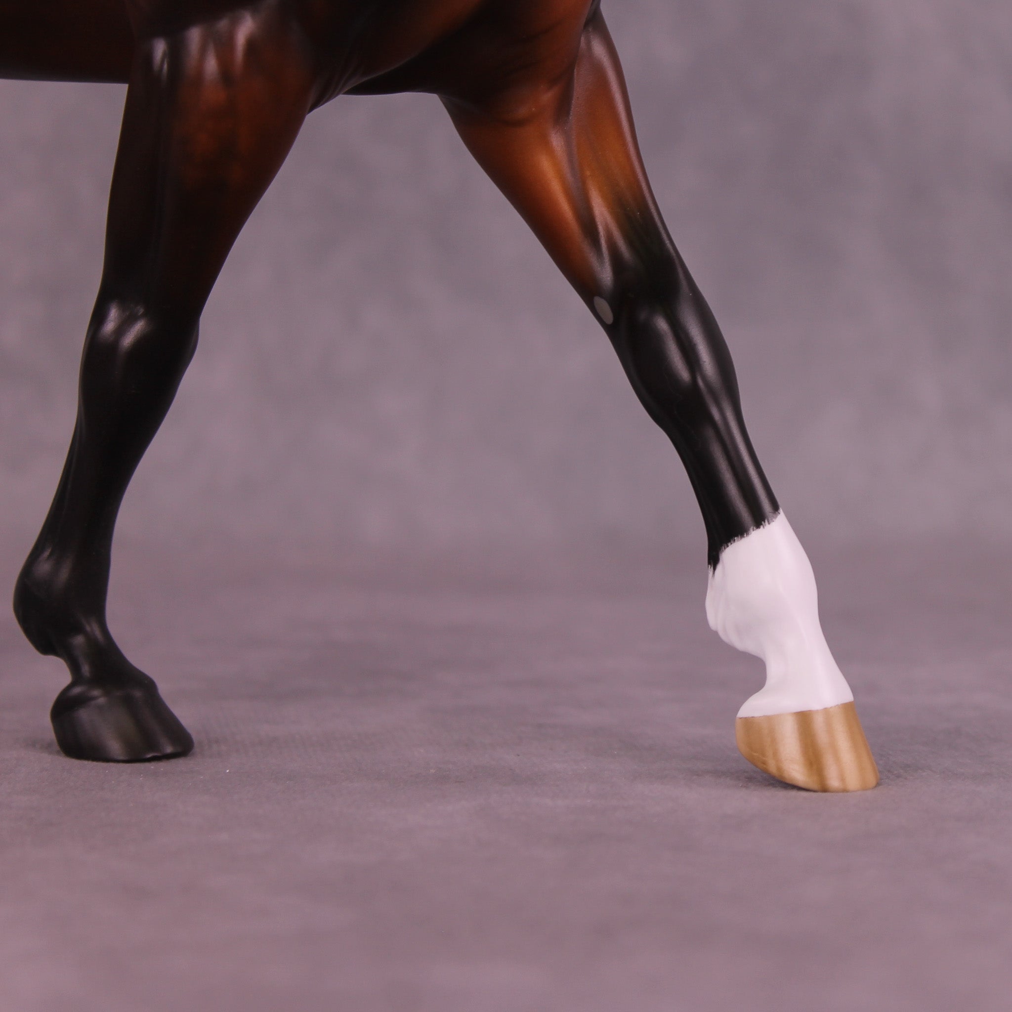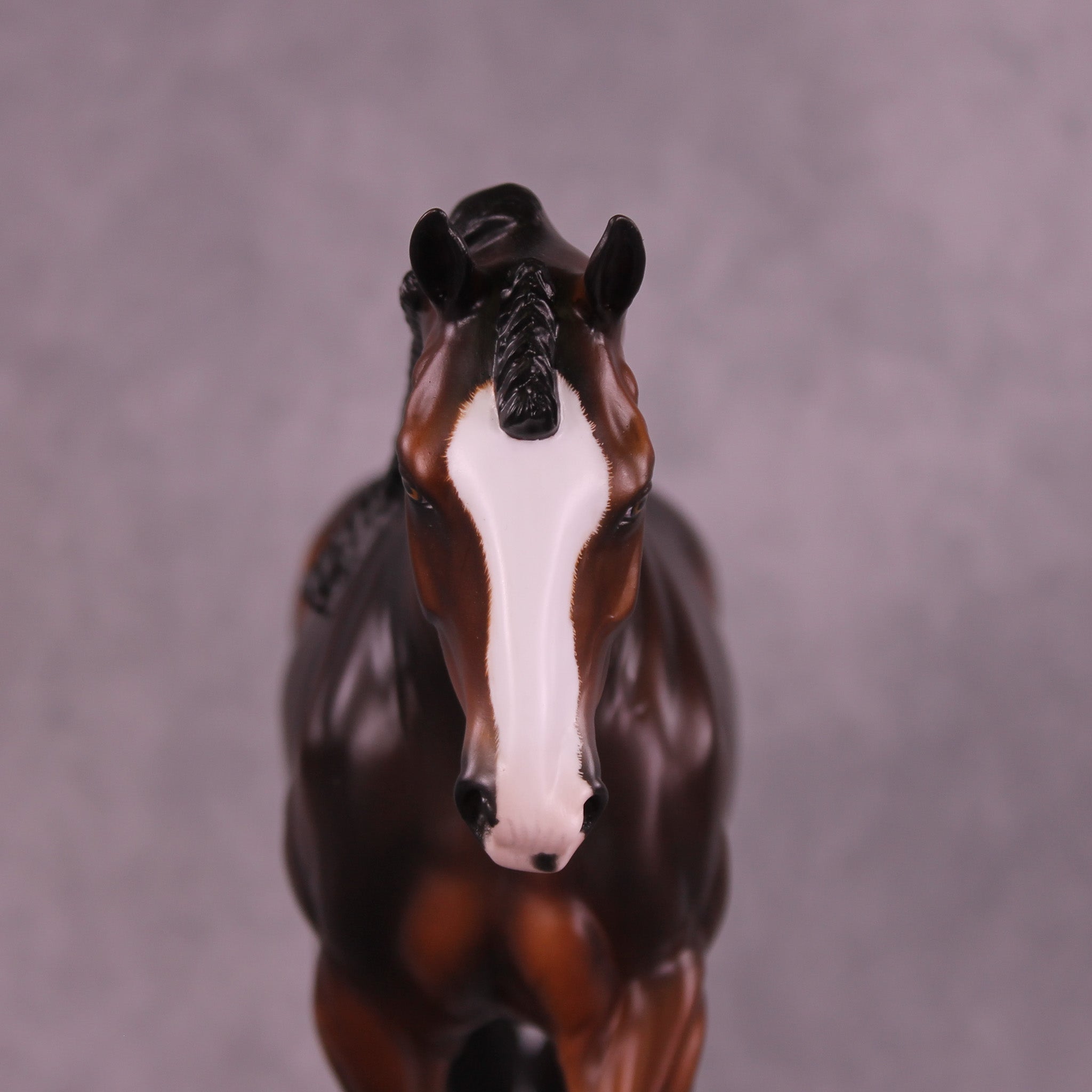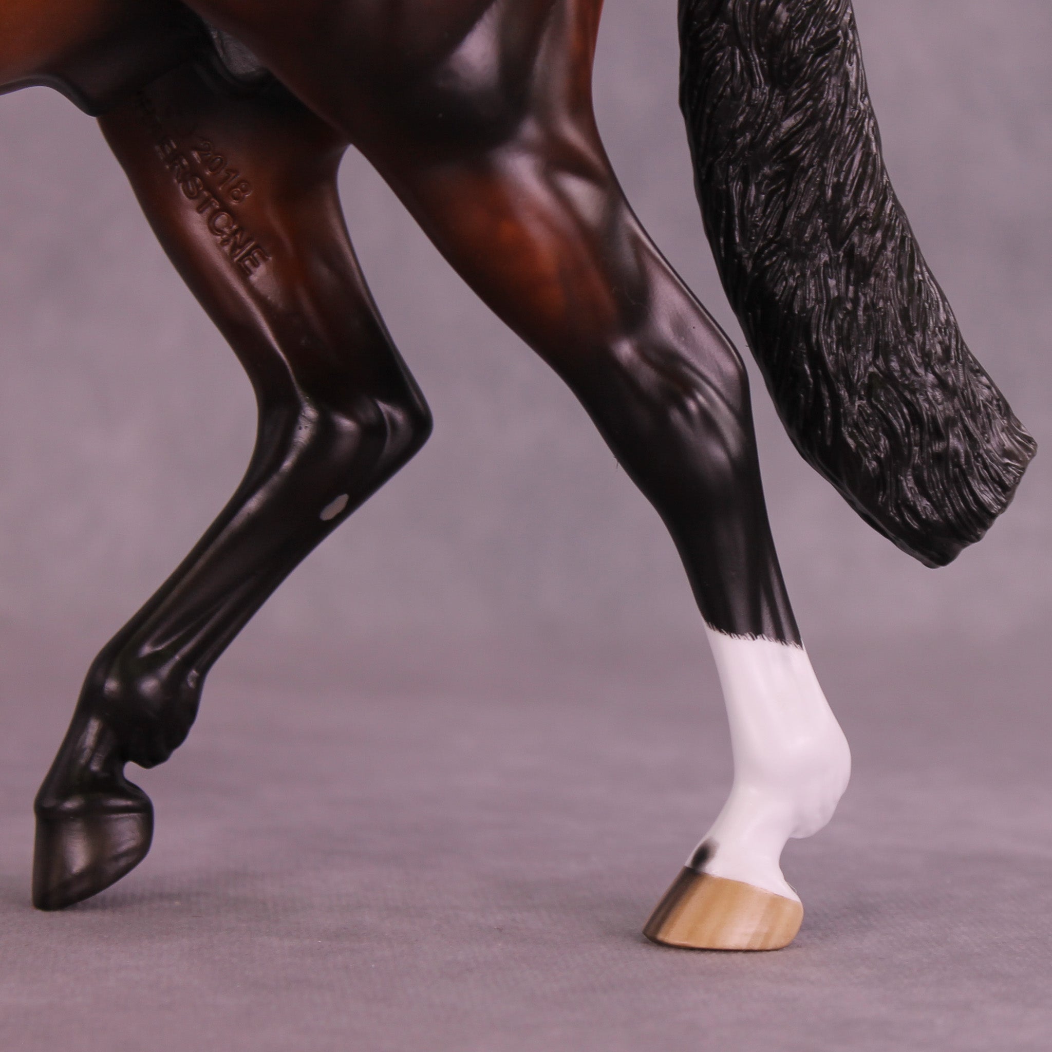 What’s better than a prim and proper dappled bay hunter? Not much, we say! Our Irish Draught mold is sporting a customized running braided mane here, with matching braided forelock and braided tail. Sheryl painted him to a stunning deep dappled bay with a wide shaded blaze and two socks with striped hooves – this piece really glows in person! All finish options are available on this piece.