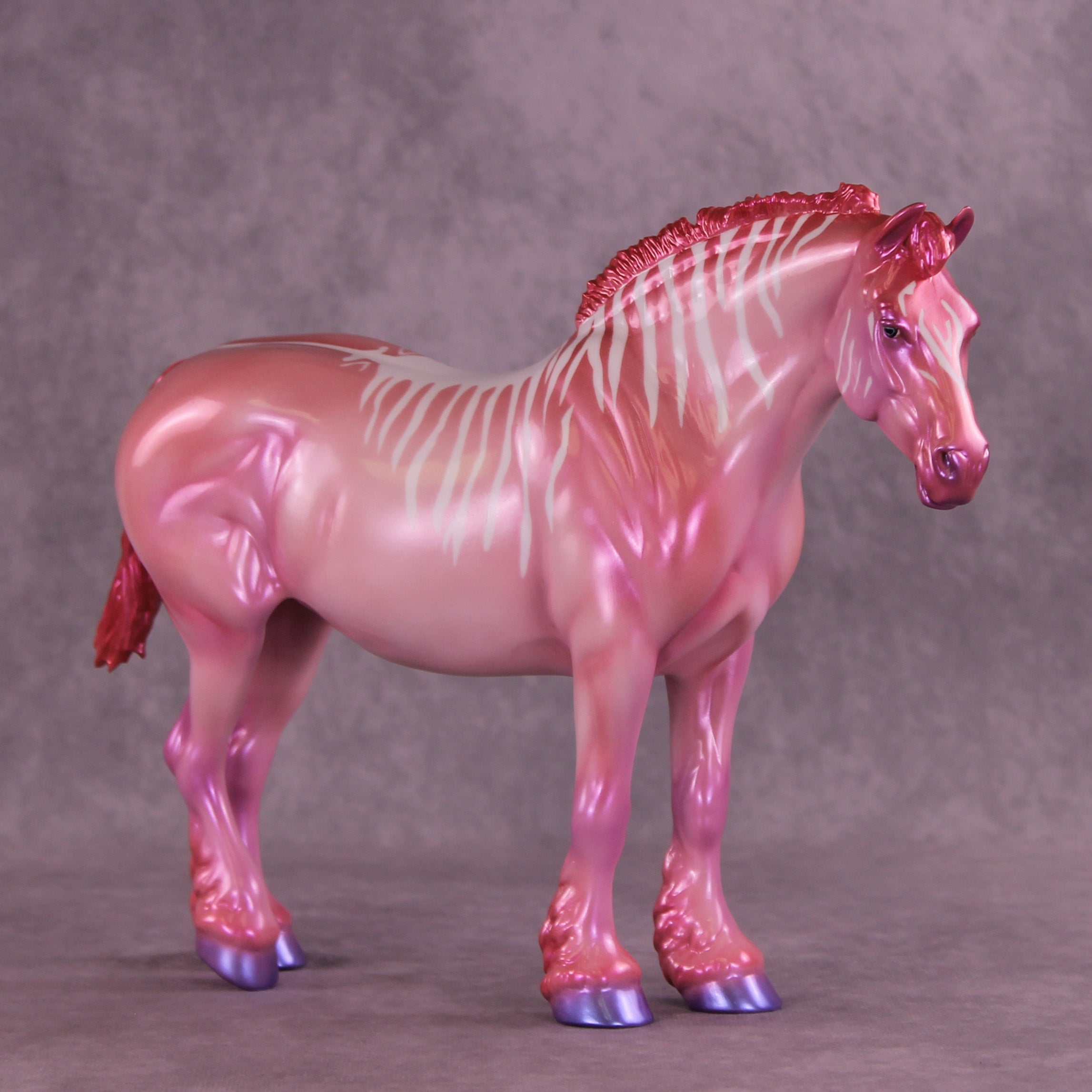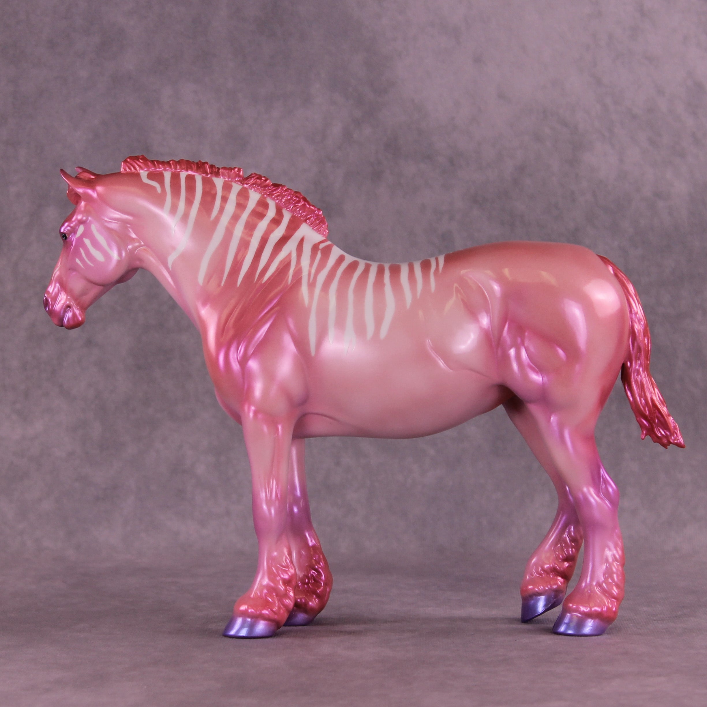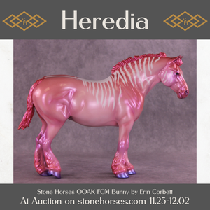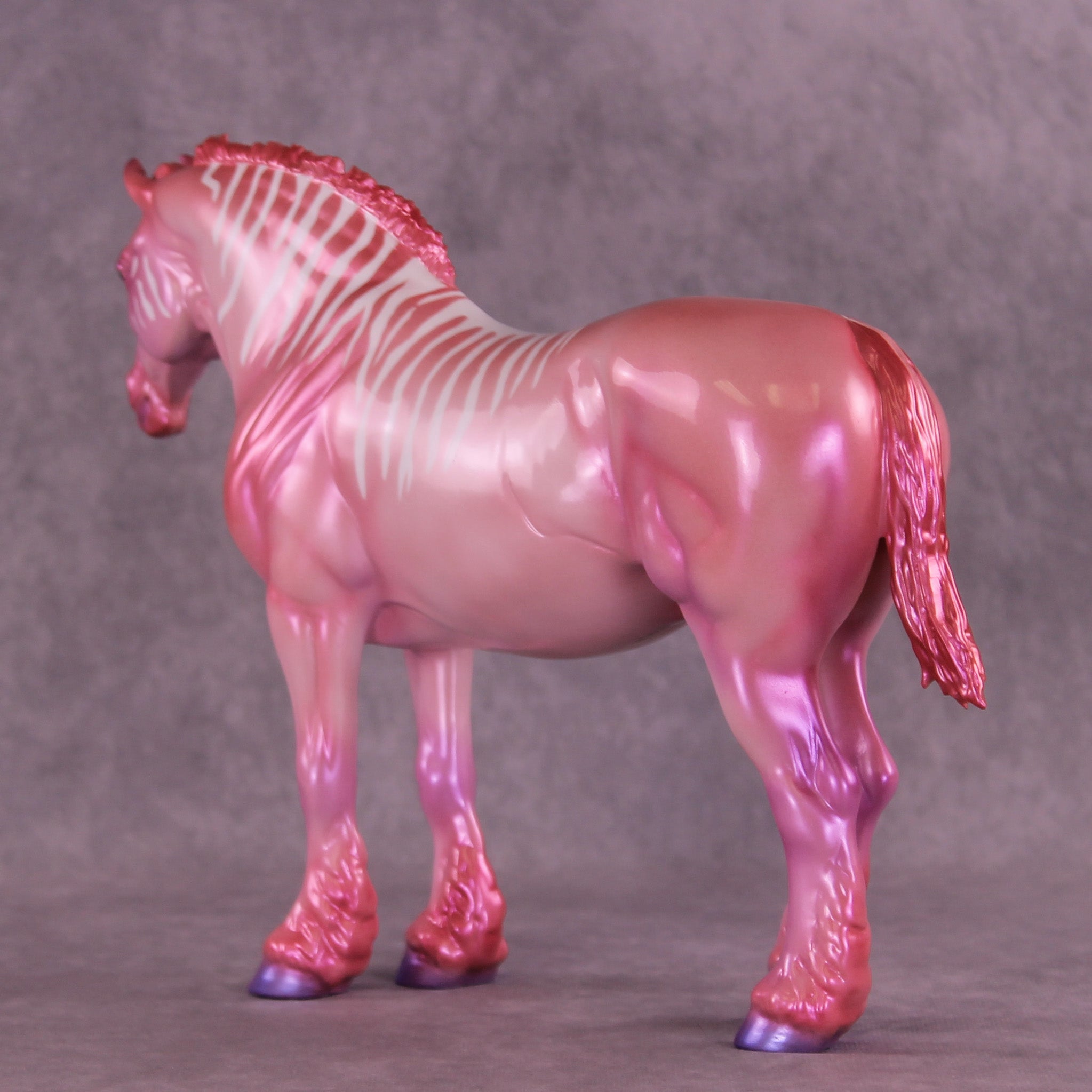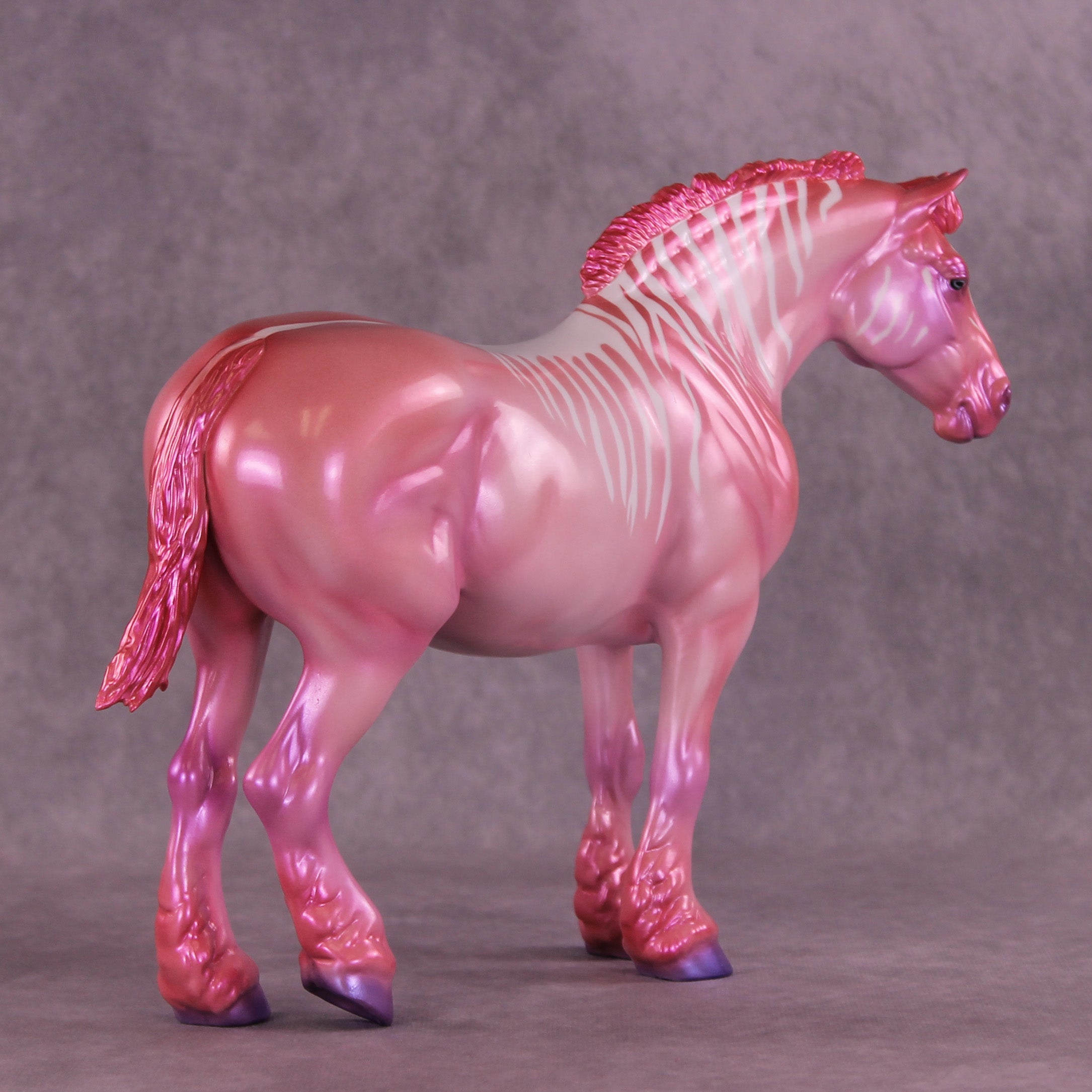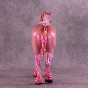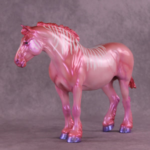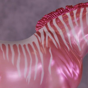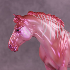 Heredia is pretty in pink! This bubblegum-colored Bunny by Erin Corbett features a cutesy short tail and a standing mane customization. Erin gave her a dimensional shaded pink and purple colorshifting paint job complete with sassy stripes across the neck and barrel. This lovely lady is the perfect addition to the girlie girl's show lineup of our dreams! She comes glossed with no finish changes offered.