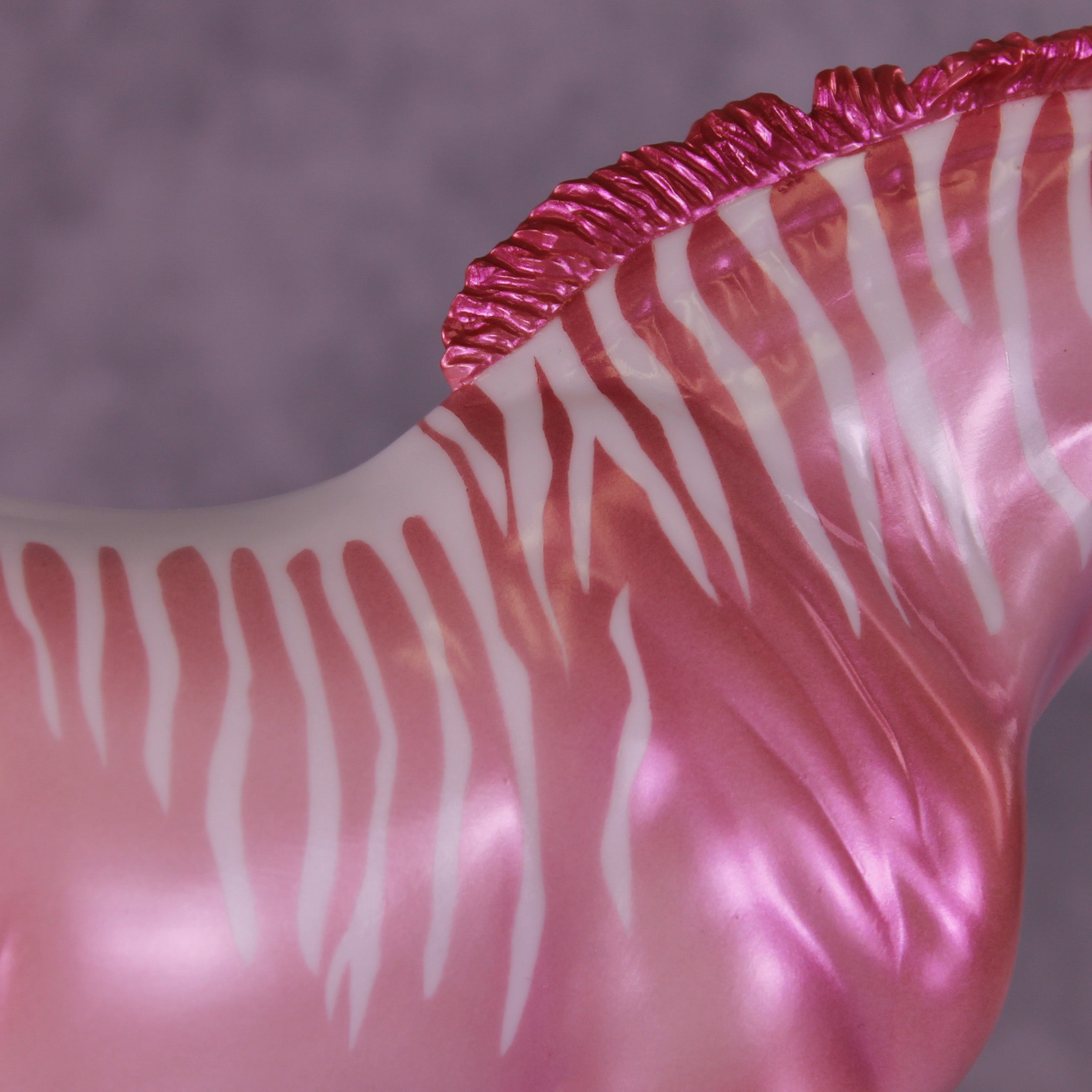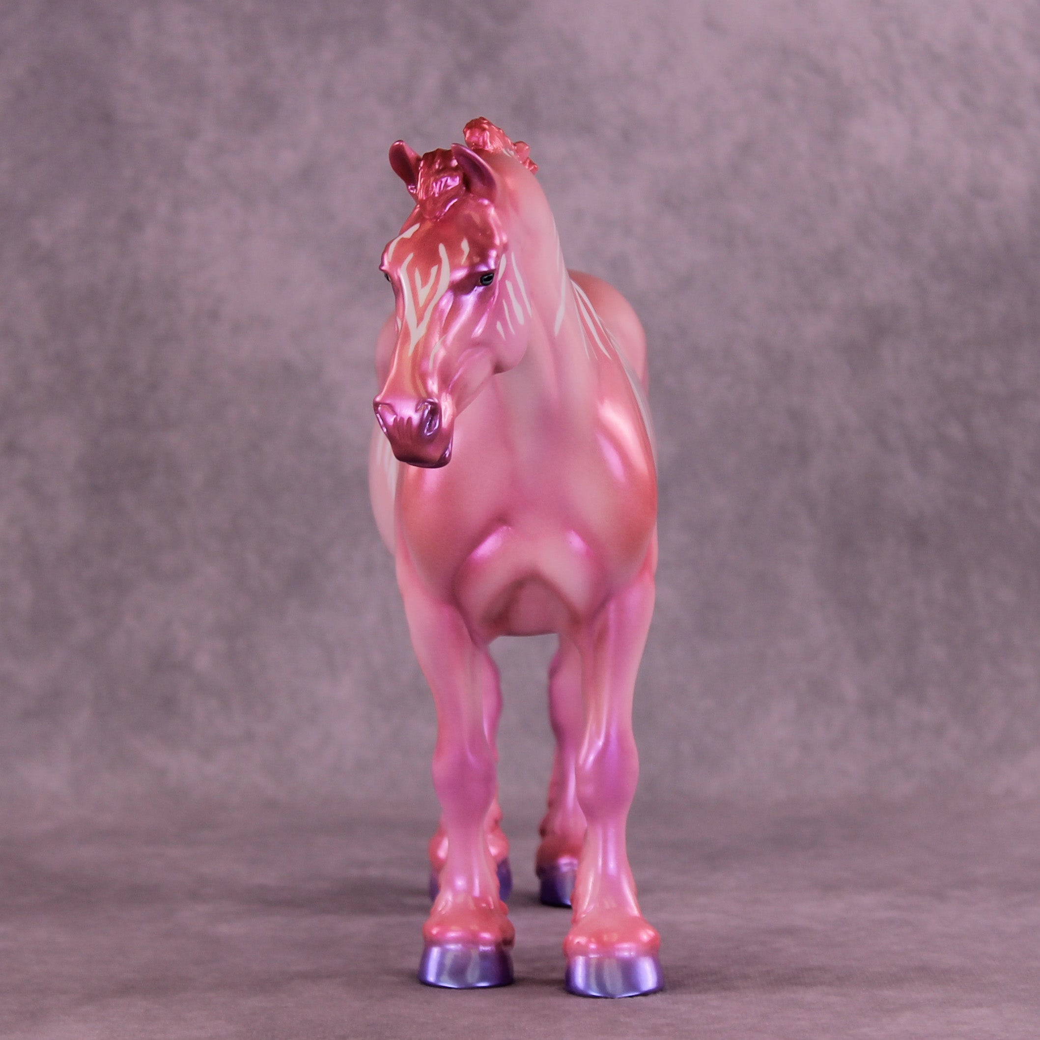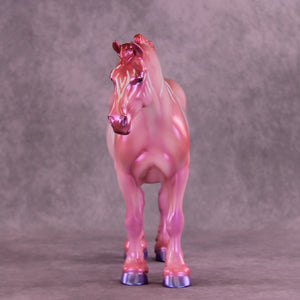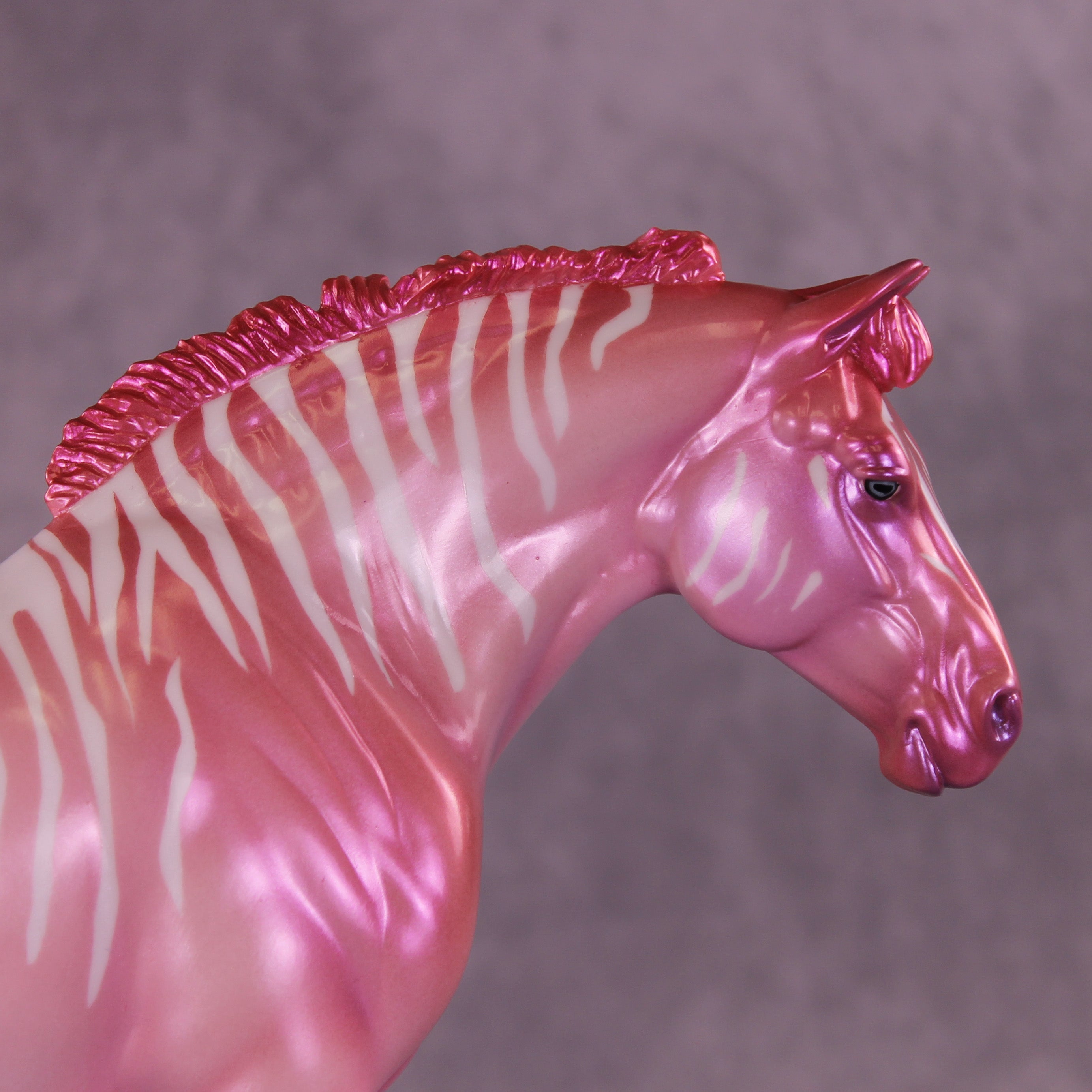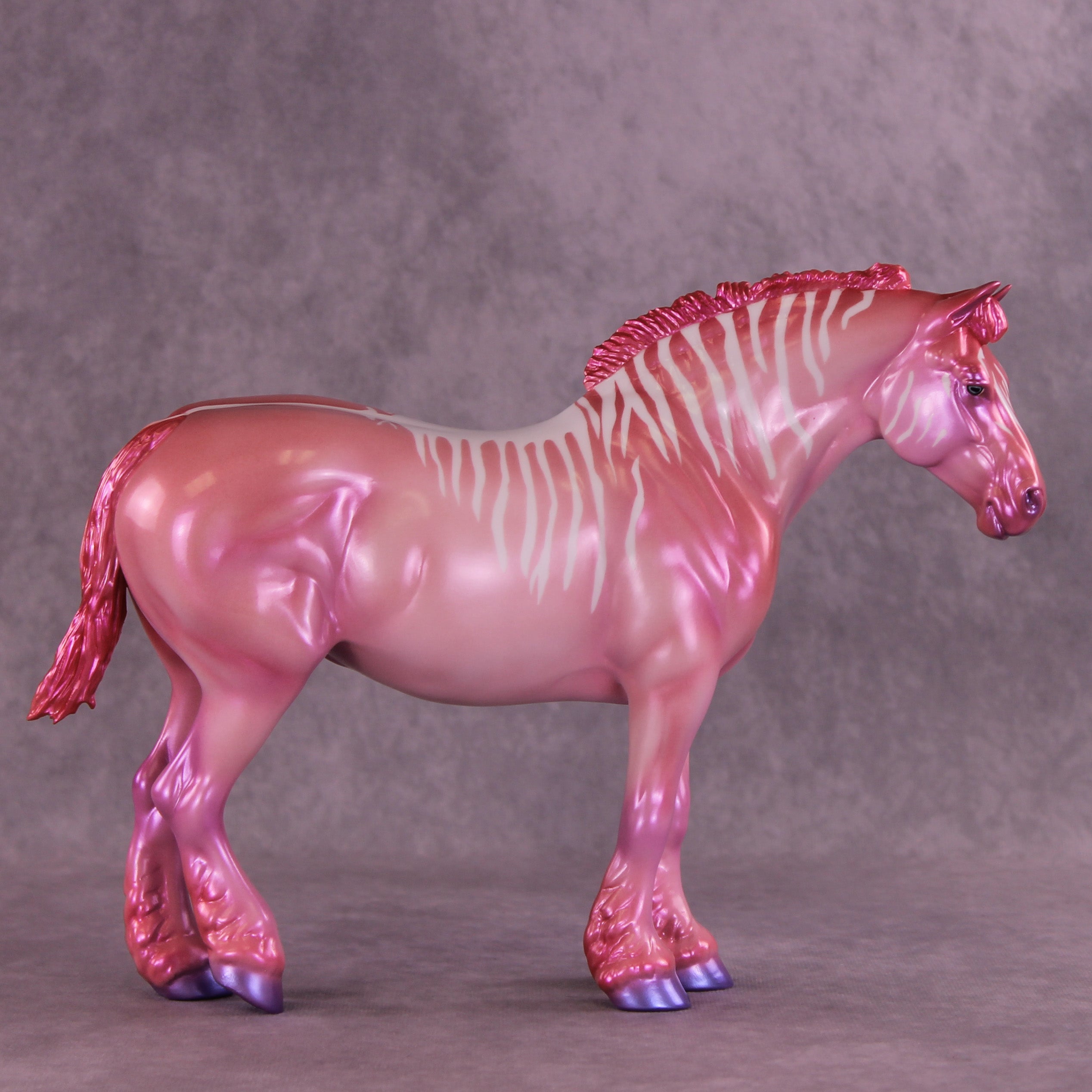 Heredia is pretty in pink! This bubblegum-colored Bunny by Erin Corbett features a cutesy short tail and a standing mane customization. Erin gave her a dimensional shaded pink and purple colorshifting paint job complete with sassy stripes across the neck and barrel. This lovely lady is the perfect addition to the girlie girl's show lineup of our dreams! She comes glossed with no finish changes offered.