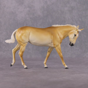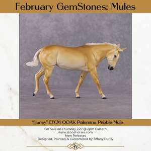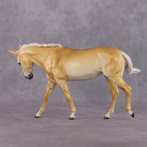 Tiffany took our pebble mule and gave her a dramatically turned and tucked head, swishing tail, and twitched ears. She is then finished in one of Tiffany's gorgeous shaded palominos with a sweet star to set her off nicely. OOAK