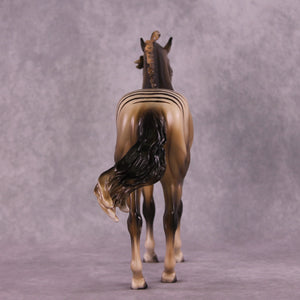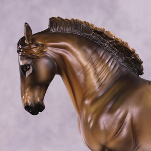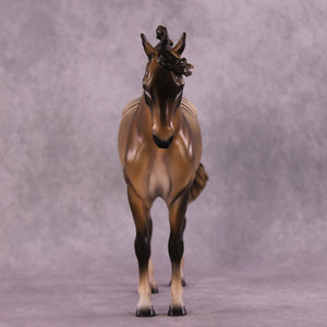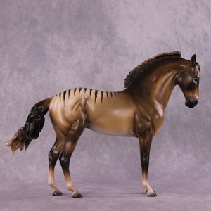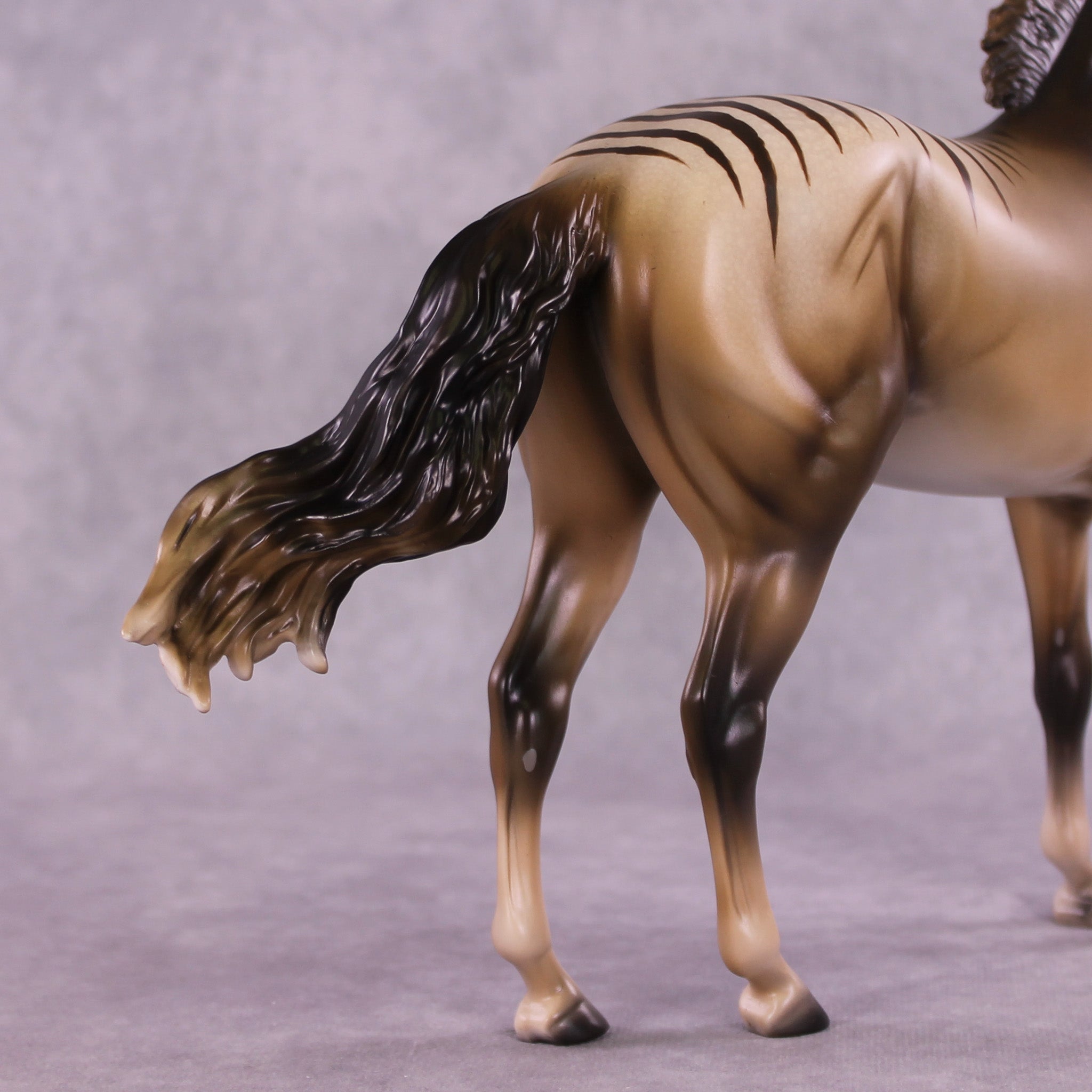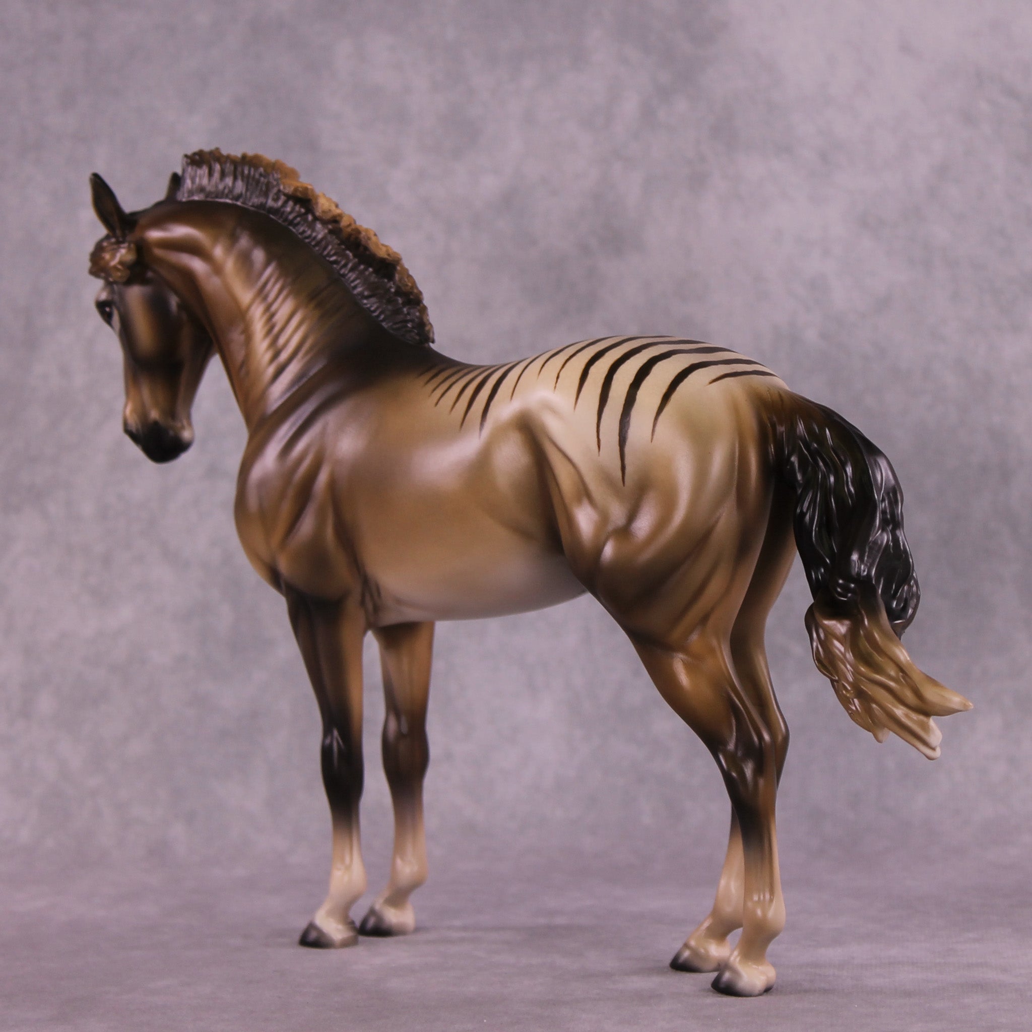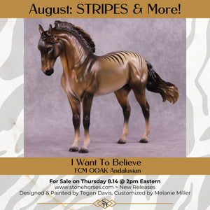 I Want To Believe begins with our Andalusian mold, customized with a stiff standing-up mane and long flowing tail by Mel Miller. Mel also customized her to a mare at Tegan’s request to celebrate and honor her transition as a transgender woman! Tegan painted this beauty in a stunning shade brown striped design based on the Tasmanian Tiger, aka the Thylacine. If you are a Menagerie fan, this distinguished lady will fit right in! Finish changes are not available on this piece.