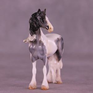 Kristen leveled up our Chip Drafter in this piece! She gave him a big turned head, and a BIG customized mane and tail with serious windblown detailing and movement – down to his added feathering on all four legs that is also blowing forward in the wind! His face has been resculpted to add in more detailing as well. Kristen painted him to a beautiful dapple grey tobiano pinto with expertly shaded whites, finished in gloss of course! No finish changes are offered on this piece.