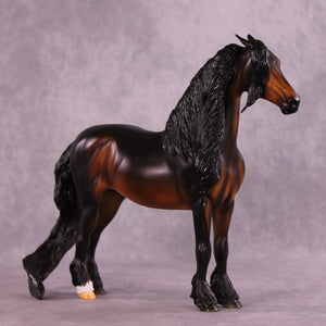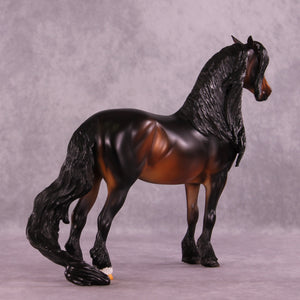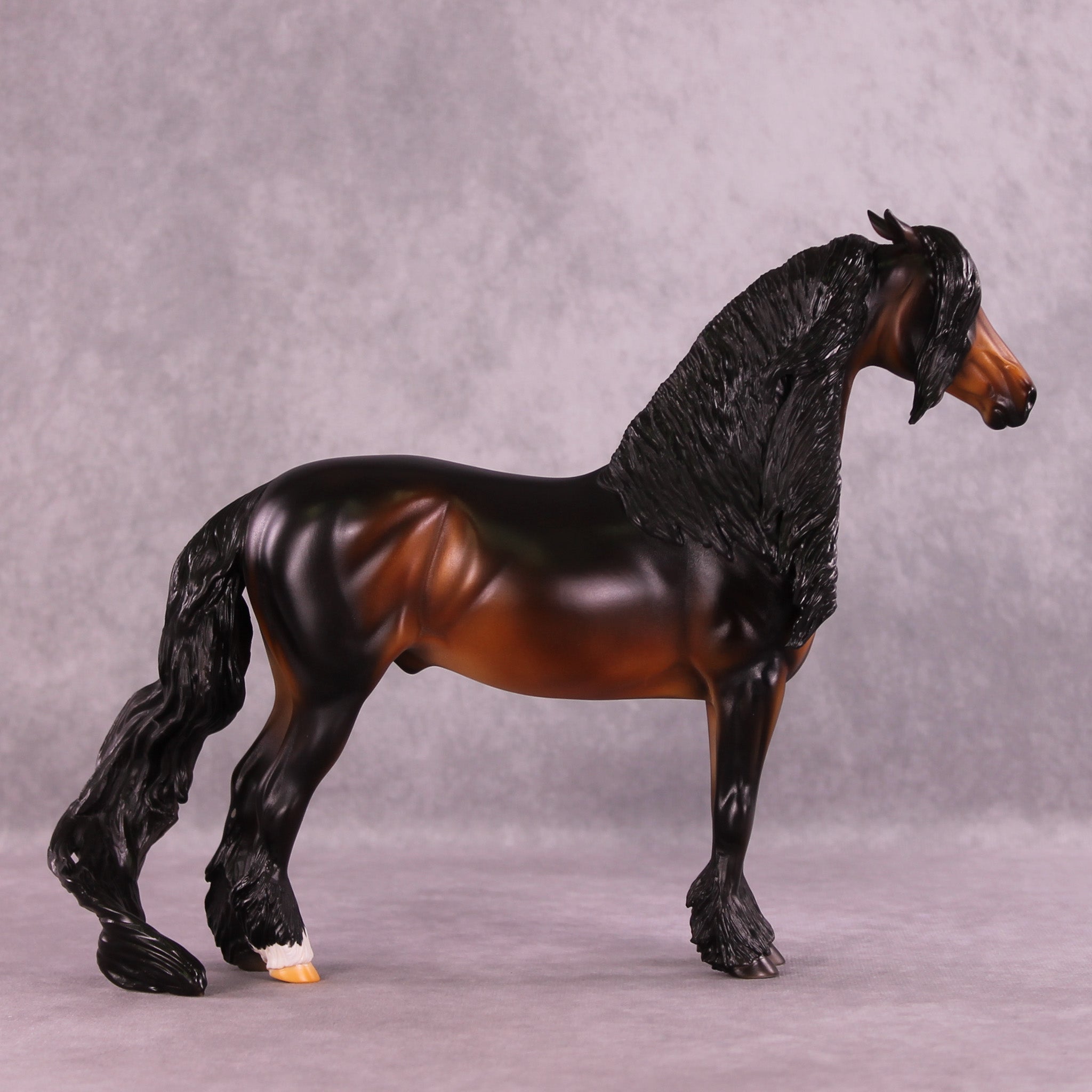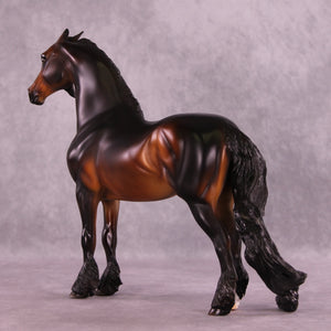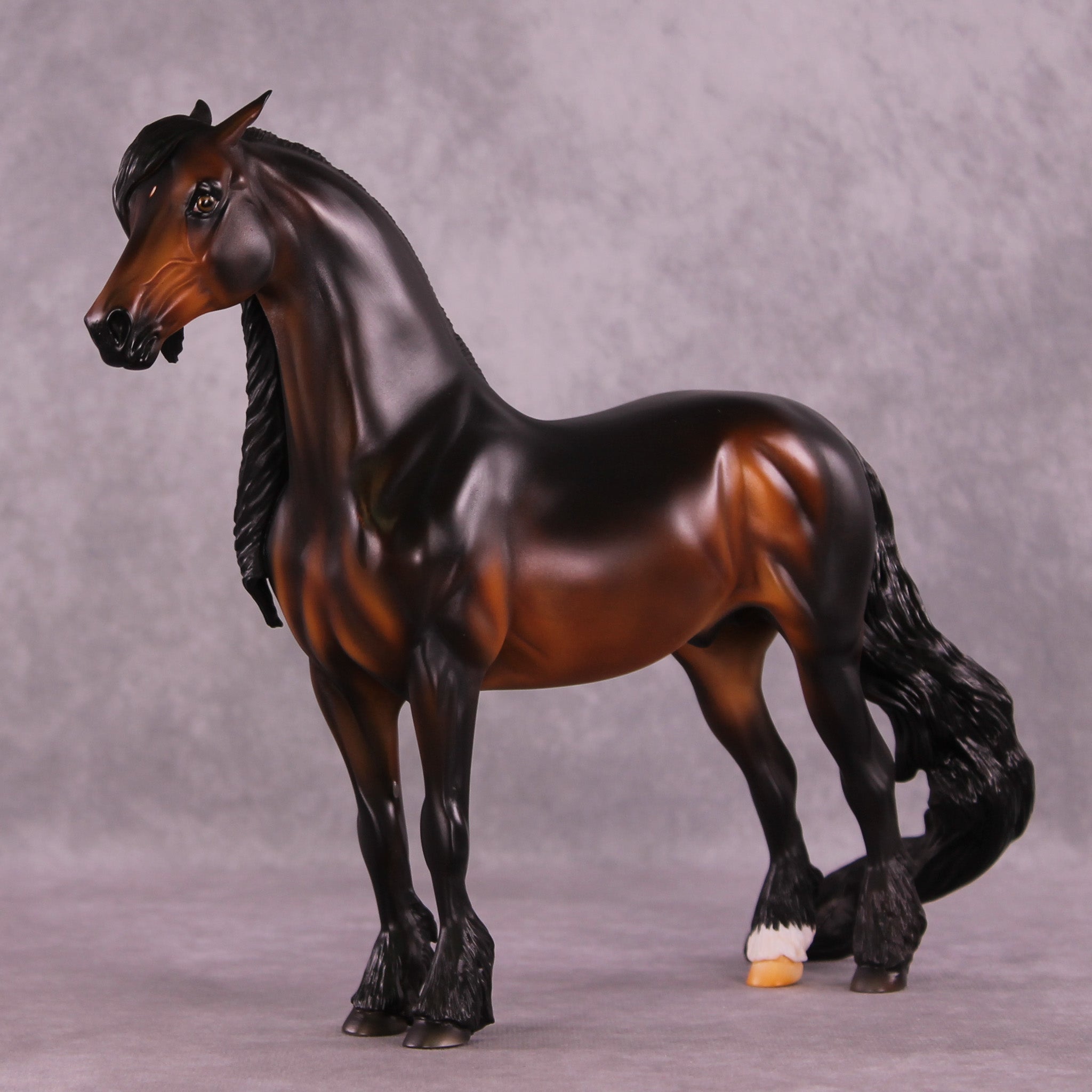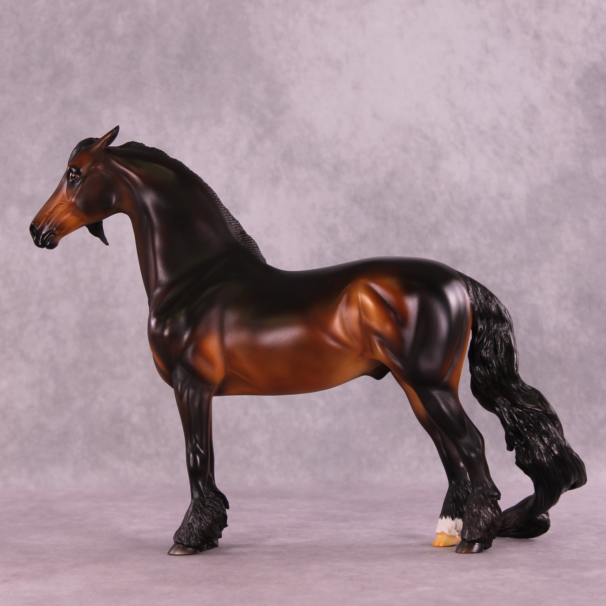 No, you can’t see his browser history. Why are you even asking? It’s none of your business! Carissa customized our Morgan sculpture to have a straightened head and neck, angrily pinned ears, an annoyed swishing tail, feather on all four legs, and of course a long flowing mane and forelock. Carissa is also the painting artist on this run, designing a stunning shaded bay with one low sock. He is available in all finish options.