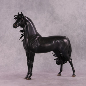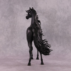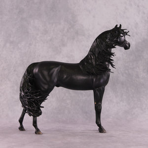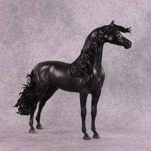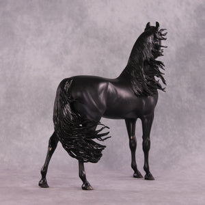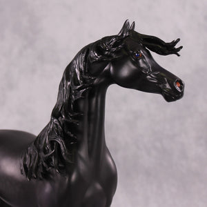 “Incognito” brings back a favorite dappled black design with dramatic windblown customization that calls out all the movement you’d expect from a black Arabian stallion standing atop a sand dune. He is Caroline’s signature deep dappled blue-black with no white markings, of course. Mona spared no detail, and neither did Caroline. This piece is simply iconic.