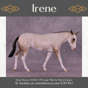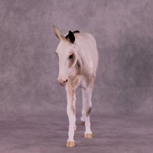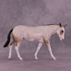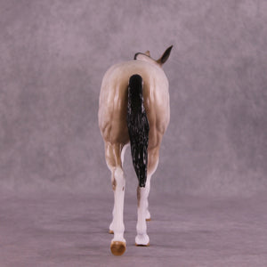 Irene has been there, done that, and she’s fine doing it again. Melanie gave this Large Mule a sweetly turned head with tweaked listening ear and some extra movement through her tail, and roached mane detailing. Sheryl finished her to a gorgeously detailed bay roan pinto with tons of soft hair detailing through her whole coat, plus of course shaded striped hooves and all of the other details Sheryl’s work is so well known for! She is a stunner!