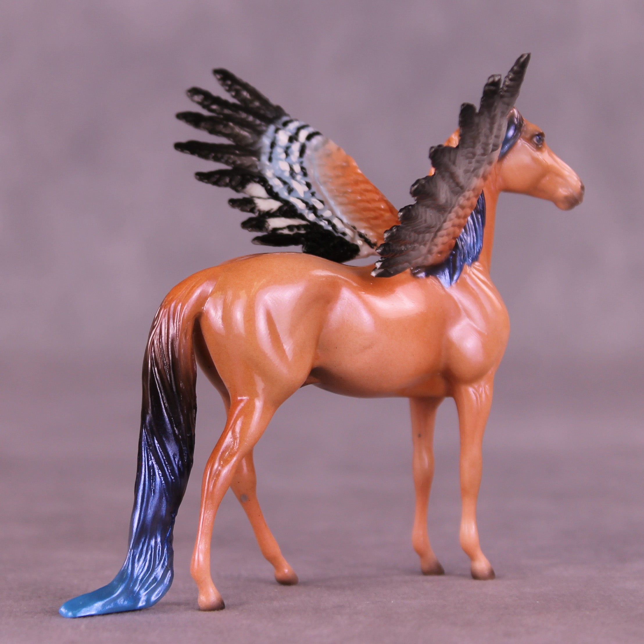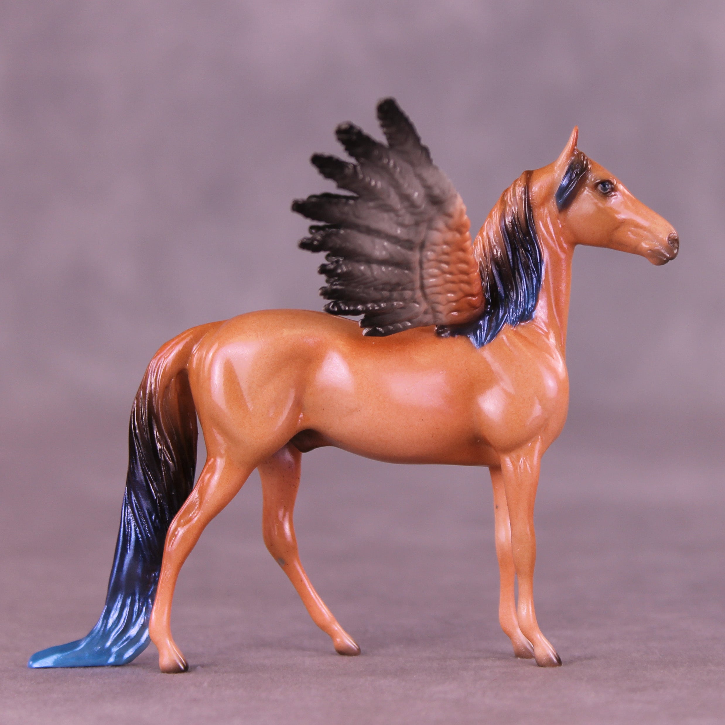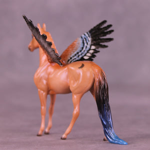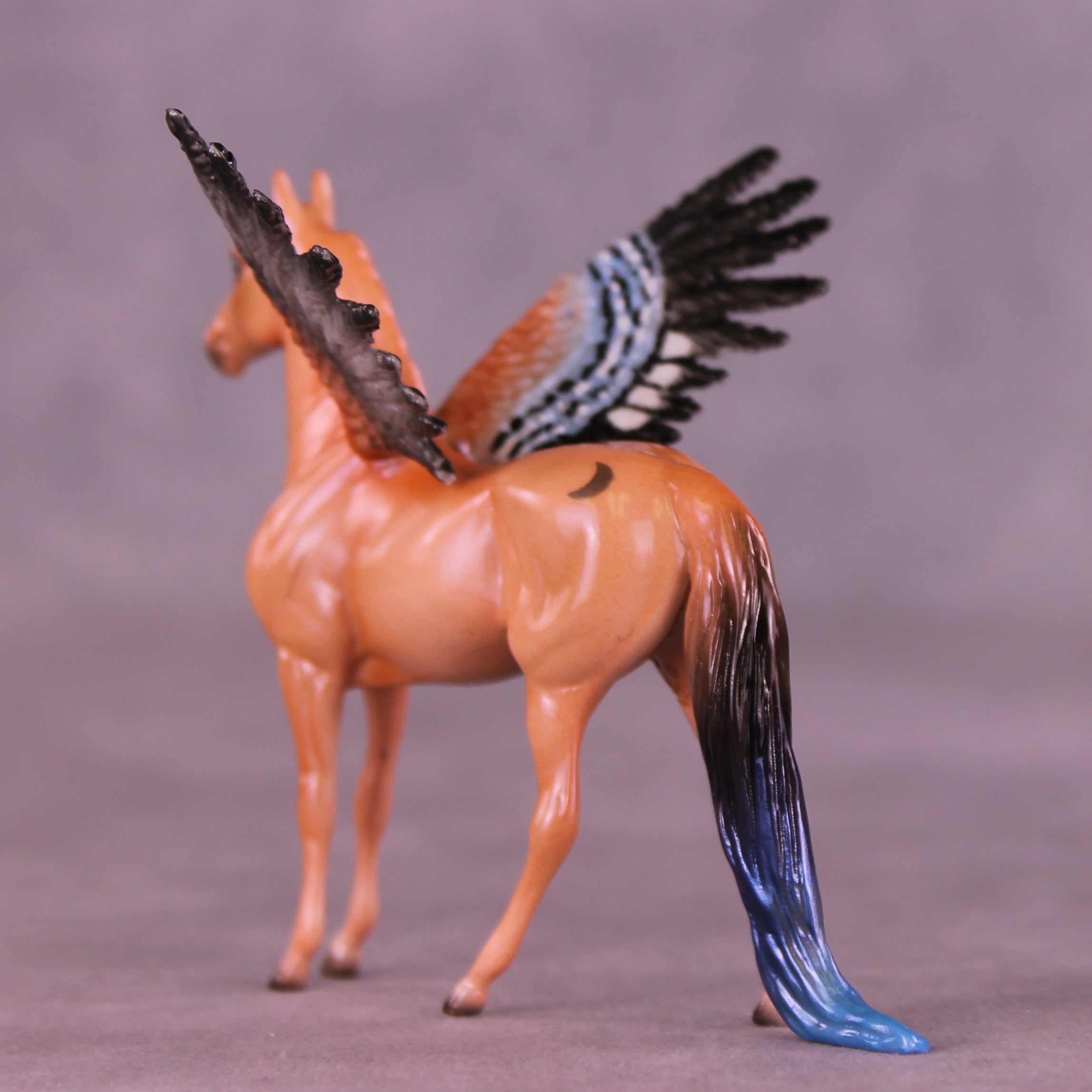 Islet de Muerta is a Morgan Chip with an extra long customized dragging tail and added feather wings. He is inspired by the Eurasian Jay, in tan with black, blue, and of course colorshifting detailing finished in gloss.