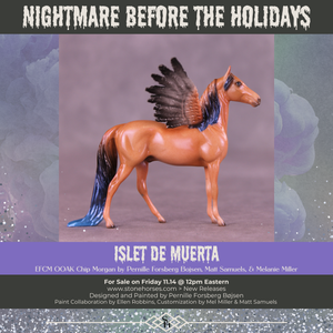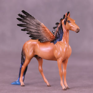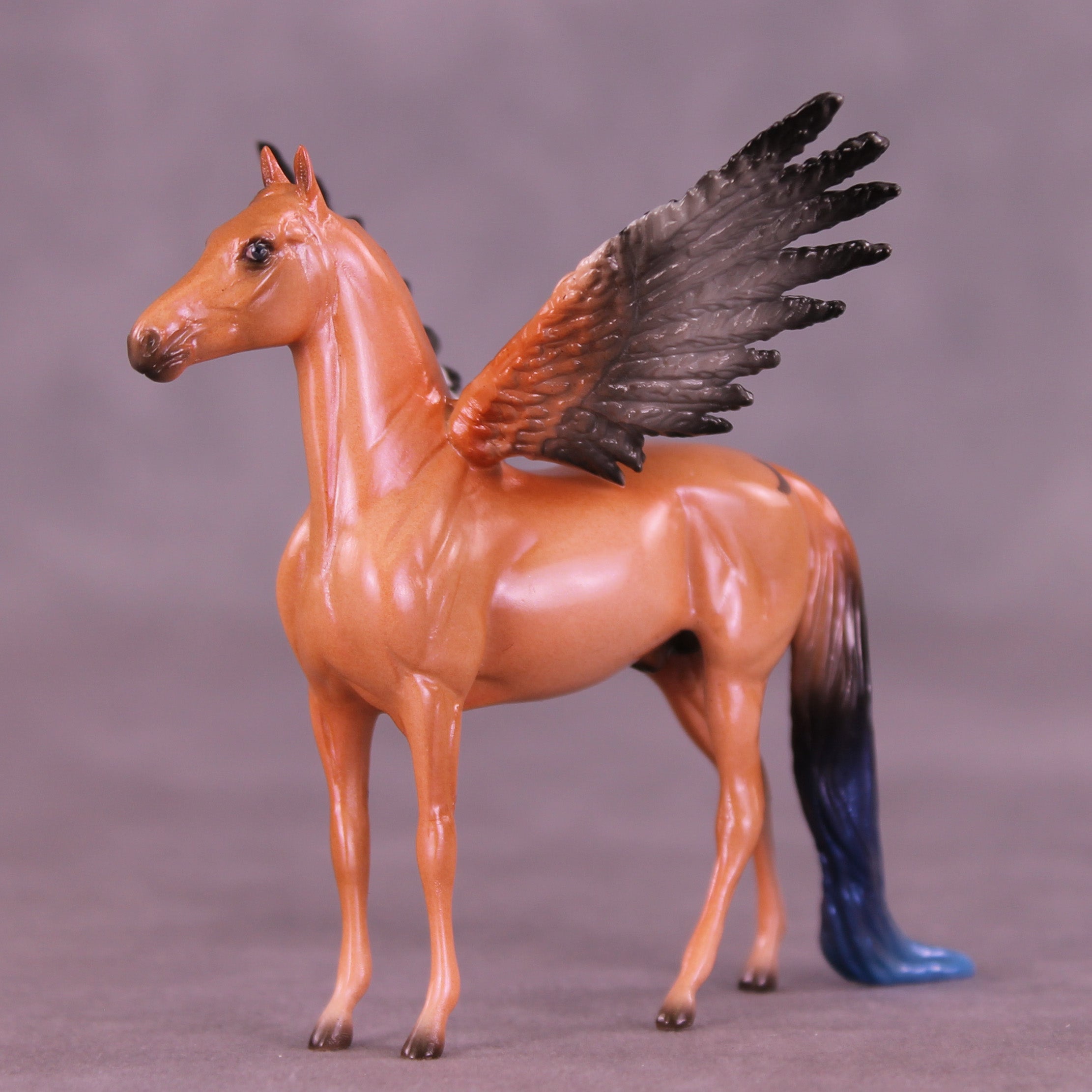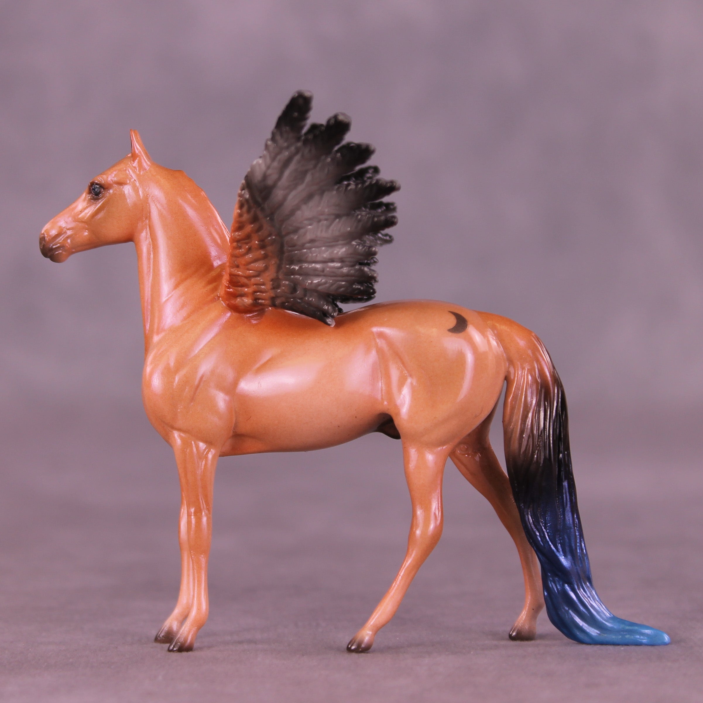 Islet de Muerta is a Morgan Chip with an extra long customized dragging tail and added feather wings. He is inspired by the Eurasian Jay, in tan with black, blue, and of course colorshifting detailing finished in gloss.