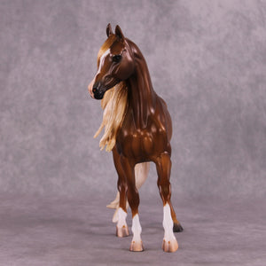 “Isn’t She Lovely”? We think so! Mona began with our arabian mare sculpture and added a heavy flowing mane, tail, and forelock all with forward movement reflecting the model’s natural movement. Caroline finished her in a stunning deep dappled flaxen chestnut with gorgeous shading through the whole piece. She has three white socks and a narrow blaze, setting off her coloring perfectly.