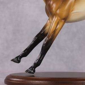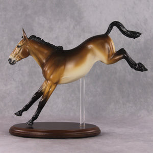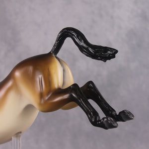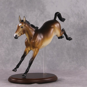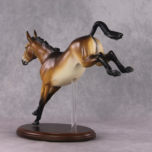 Tiffany took our beloved old Jumper mold and put our new Mule head on her, moved her legs, added an updated mane and tail, and finished her to this gorgeous shaded bay pangare with a vaguely heart shaped large star and snip. This piece will be killer in performance if that's your style, or simply enjoy her in your home as the work of art she is!