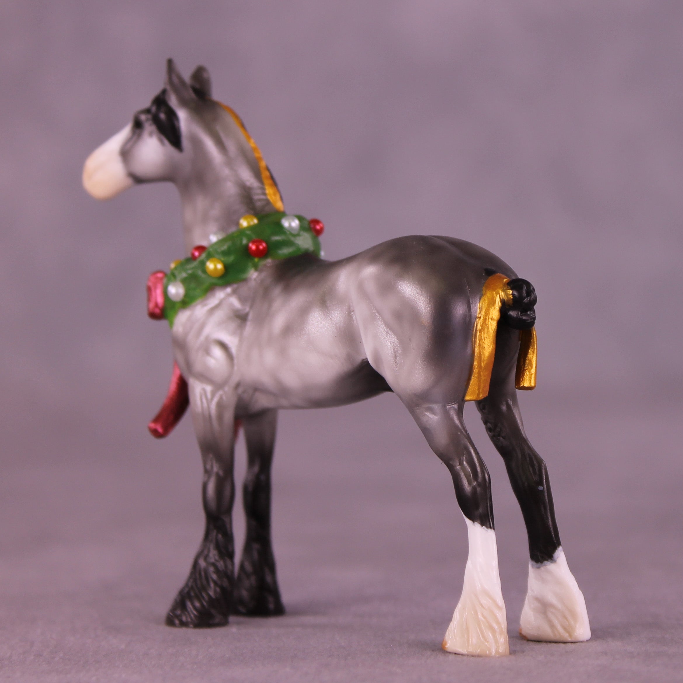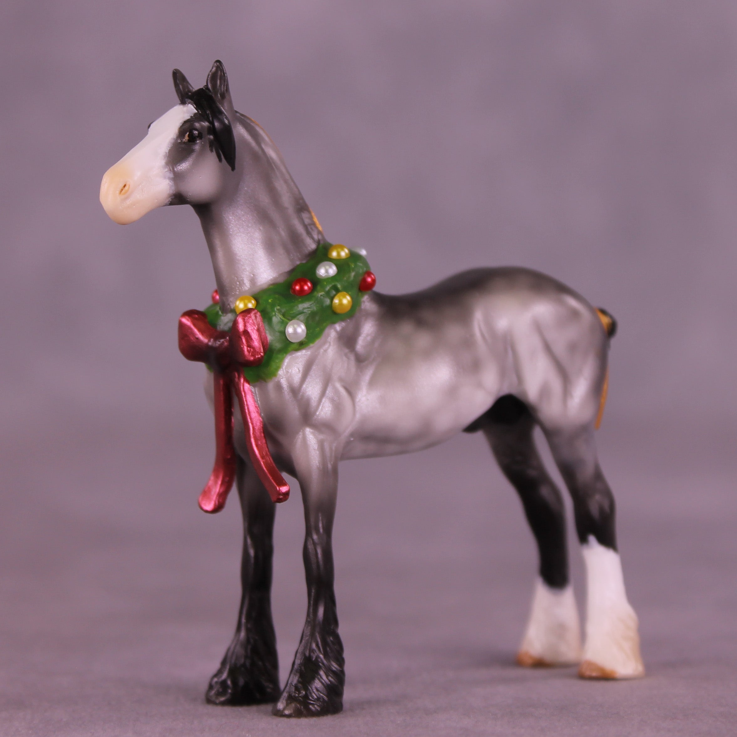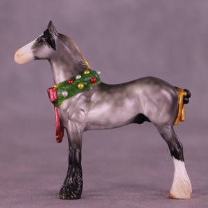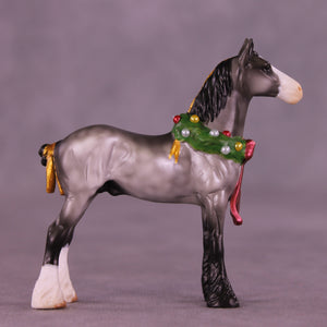This Festive Fellow rounds out this collection in style! Kristen worked with our Chip Drafter and gave him a customized lifted and straightened head and neck position, a new golden bow in his tail, and of course his festive permanently sculpted-on Christmas wreath with a big red bow! He is painted to a lovely dapple grey with two white socks with shaded feathering and a shaded wide blaze. He comes in lightly satin matte and no finish changes are offered.