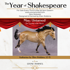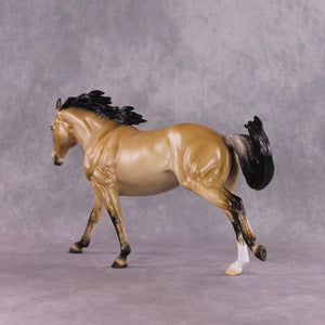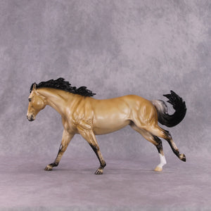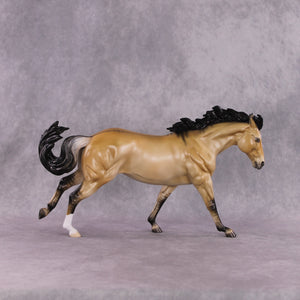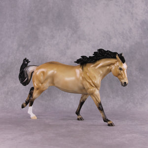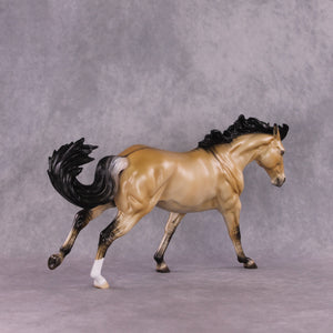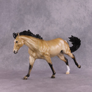“Katharina”is a stunningly customized Remington model. First he was changed to a she, given pinned ears, a new loose flying mane, and curling up swishing tail. Ellen finished her to a jaw droppingly detailed buckskin with leg barring, a barred dorsal, frosting at the top of her tail, and a TON of dimension. She is a run of 15 pieces and is priced at $439.99 and all finish options are available.