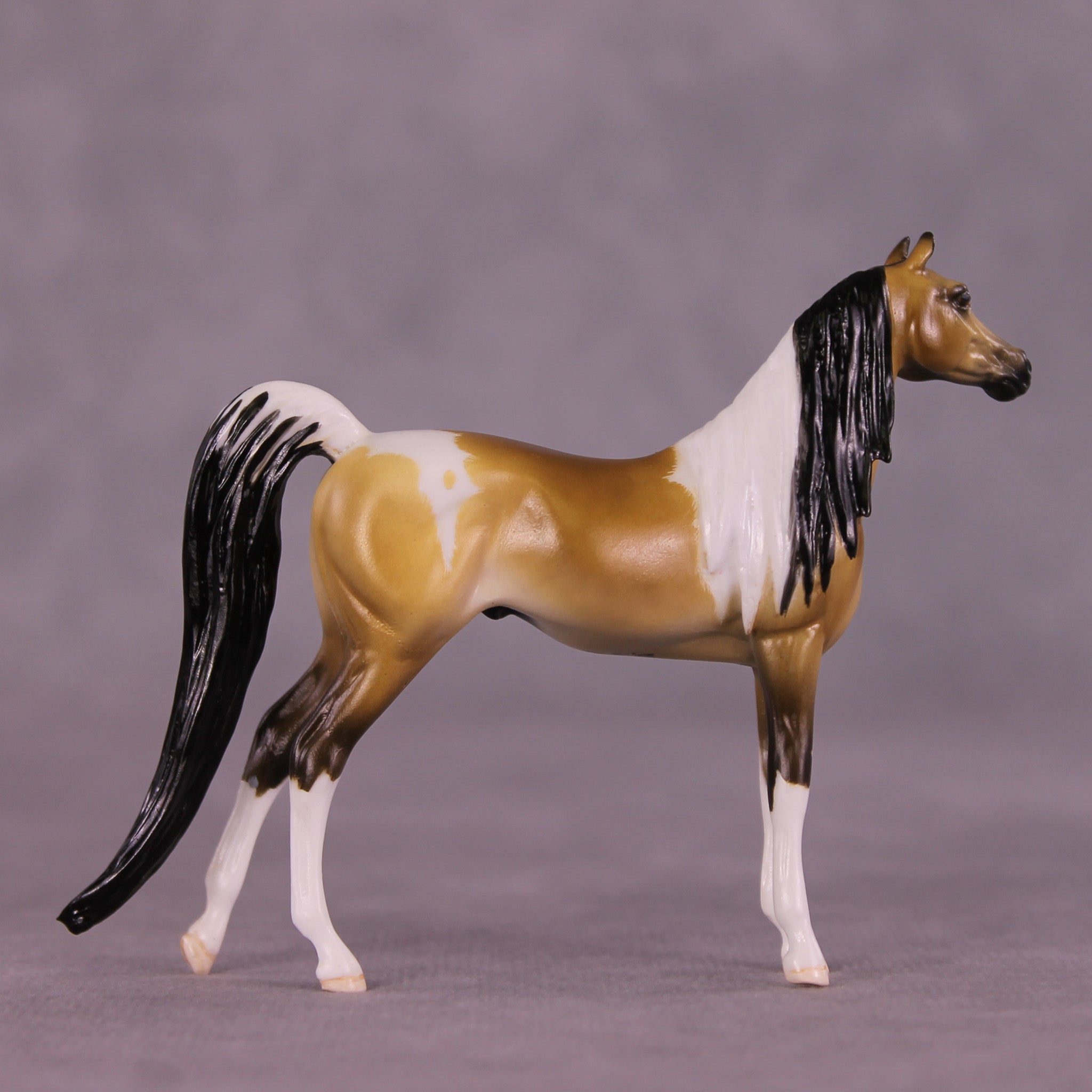 Khemorific begins with our Arabian Stallion Chip, and he has a whole new head and neck position plus an extra long show mane and tail to turn him into the ideal National Show Horse Stallion. To bring his new look home, Tiffany finished him in a stunning shaded buckskin tobiano pinto. He is ready to win!