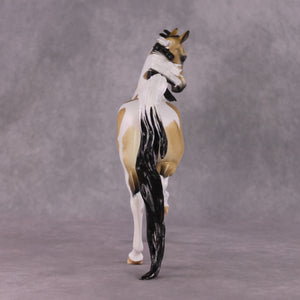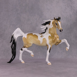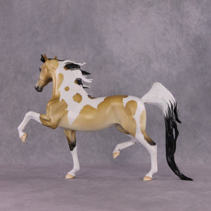 This is what you find when you look up elegant in the dictionary! This piece was made for the NSH classes! Perfect for showing off, Tiffany has not held back in adding class and style to this Saddlebred model. It features the Arab Mare head and neck, expertly crafted seamlessly to the Saddlebred. She is also anatomically correct. Tiffany then painted her to a breathtaking dappled Buckskin Tobiano with mapping on all the markings. An expertly crafted creation that catches the eye!