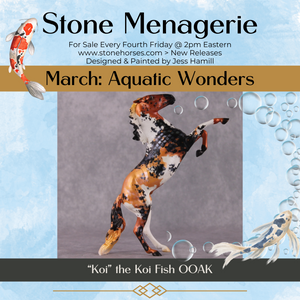 In this month's Menagerie, explore the beauty of aquatic themes with our Koi-inspired pebble model horses. Each piece, crafted with Jess Hamill's artistic touch, features intricate fish scale details and a variety of Koi color options, capturing the elegance of these magnificent creatures. Dive into this enchanting collection with us!