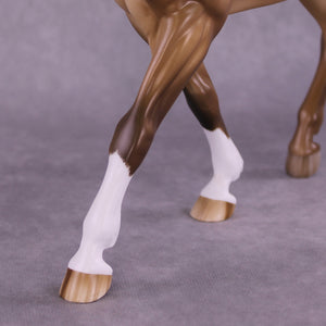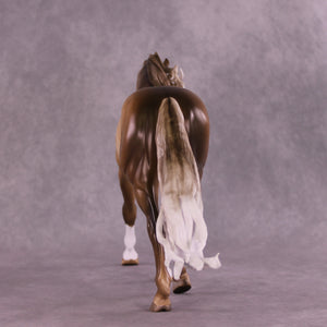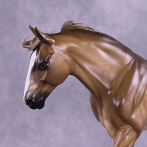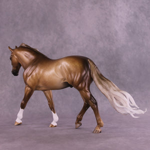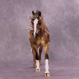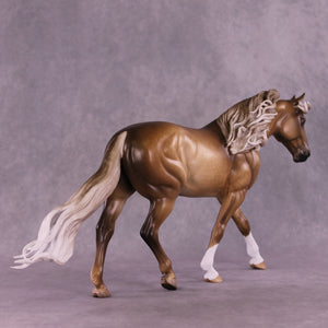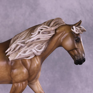 Lancelot begins on our Irish Draught mold, and before she retired Mona gave him a curious light head and neck turn, and then an extreme tendril detailed extra long mane, tail, and forelock. Sheryl then finished him to a stunning dunalino with gorgeous dappling, shading, and detailing. She gave him two front socks wit hoof striping, and a balanced blaze. He is a knockout!