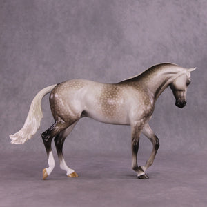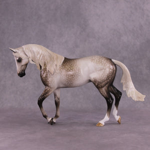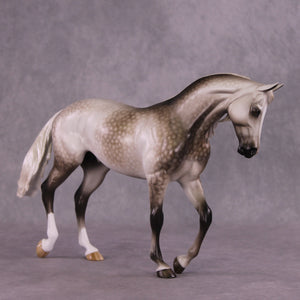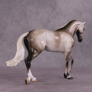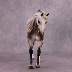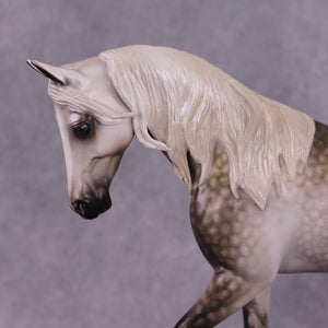 “LaSalle Explorer” was first completed in late 2024, but needed a few tweaks before being re-offered for sale. He is freshened and we are pleased to offer him in this group of Best Offers! Mona gave him a head turn and light tuck, and then a lovely customized flowing mane and forelock, and swishing tail. Sheryl finished him to one of her stunning heavily dappled greys with loads of contrasty shading and detail work!