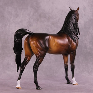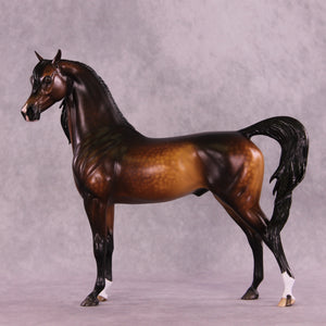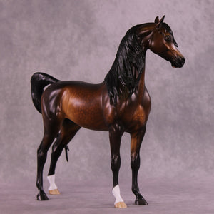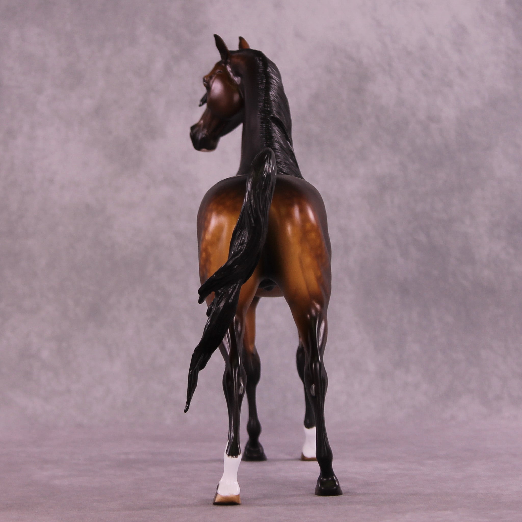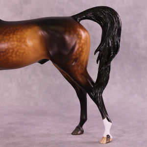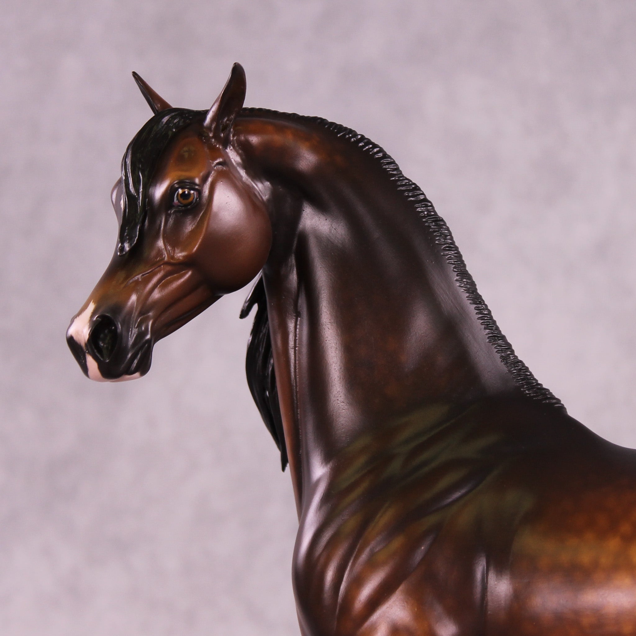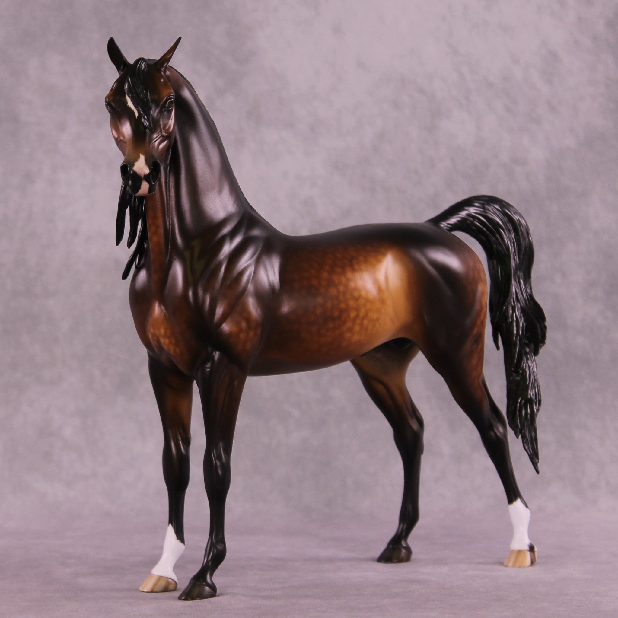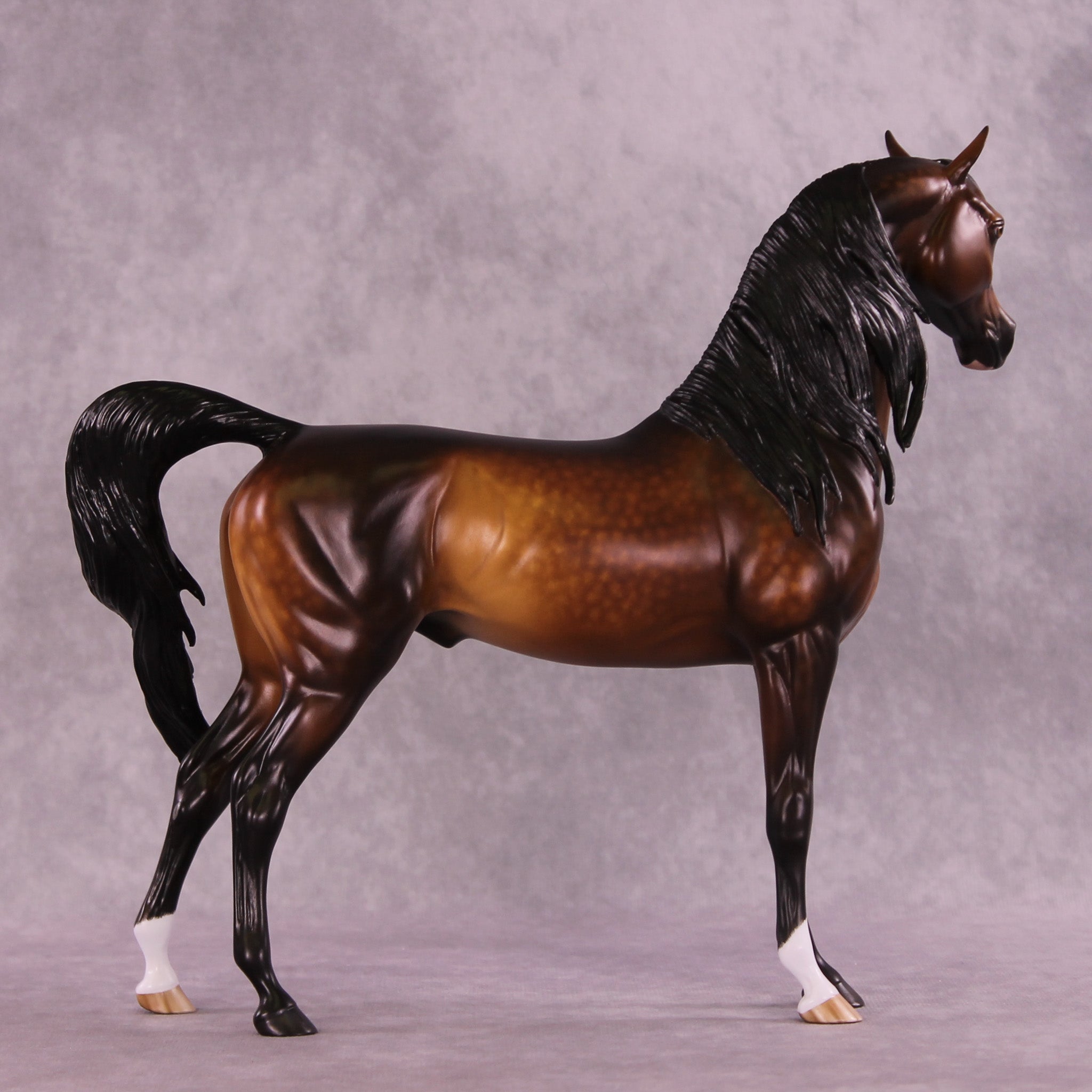 Melanie started out with our Arabian Stallion sculpture, and gave him a dapper turned and tucked head and neck with a twitched listening ear, plus of course a whole new mane, tail, and forelock with extra tendril detailing. Sheryl painted this distinguished gentleman a gorgeously shaded and dappled bright bay with two socks, a star, a snip, hoof stripes, and loads of the detailing you can always expect from a Sheryl Leisure piece! He glows!