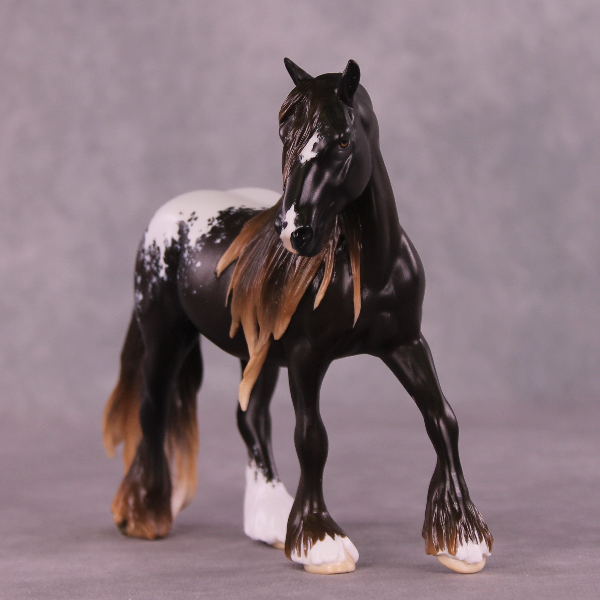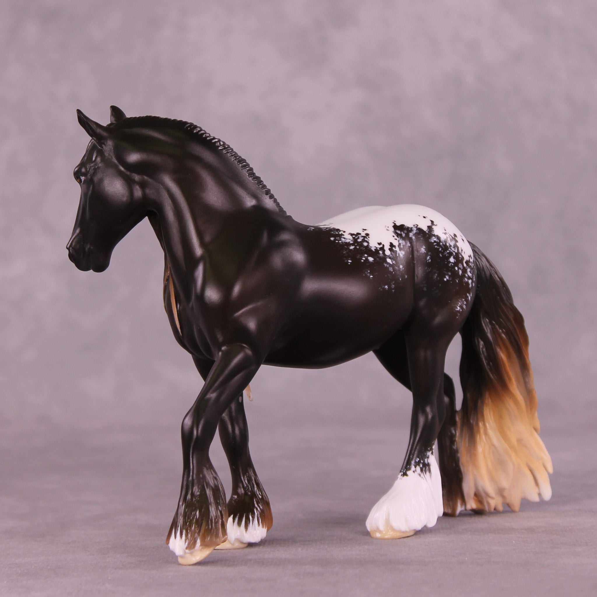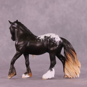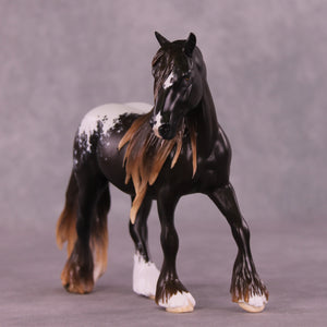 Here is Laurentum! We teased this piece when he was in progress, and boy did he finish up nicely. Melanie Miller took our Pebble Draft sculpture and gave him an attractively moved head and neck position, and then totally resculpted and added volume to his big long mane and tail with loads of tendril detailing, plus heavy feather on all four legs. Jess Hamill leveled him up even more in paint, with a gorgeous liver chestnut blanket appaloosa design with Jess’s trademark fine hair detailing in his blanket and white markings, plus that stunningly shaded mane and tail and feather! We can’t say enough about this piece, you just have to see him in person. All finish options are available.