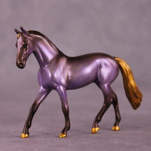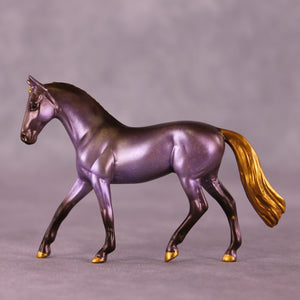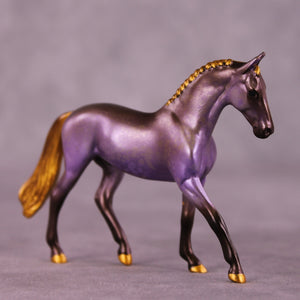 Lavender Mocha is our Chip Warmblood mold painted by Kristen to a gorgeous dusty lavender filigree with chocolatey points and shading, with shaded gold mane, tail, and hooves. A nice balance and partner piece to Lavender Latte!
