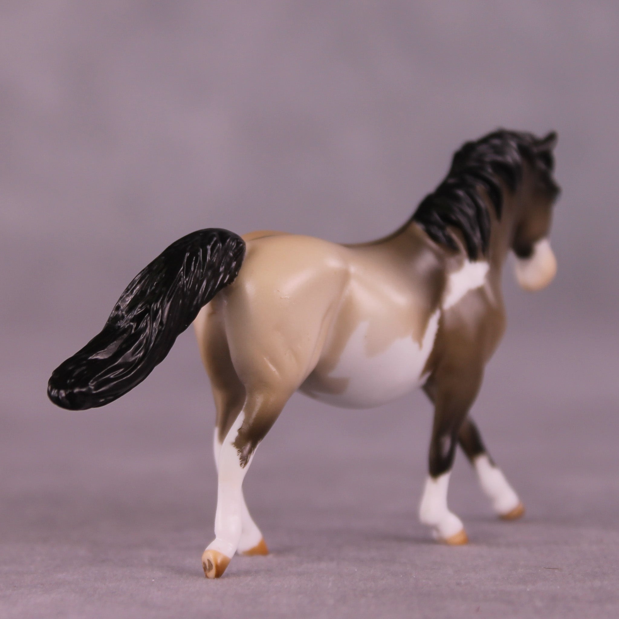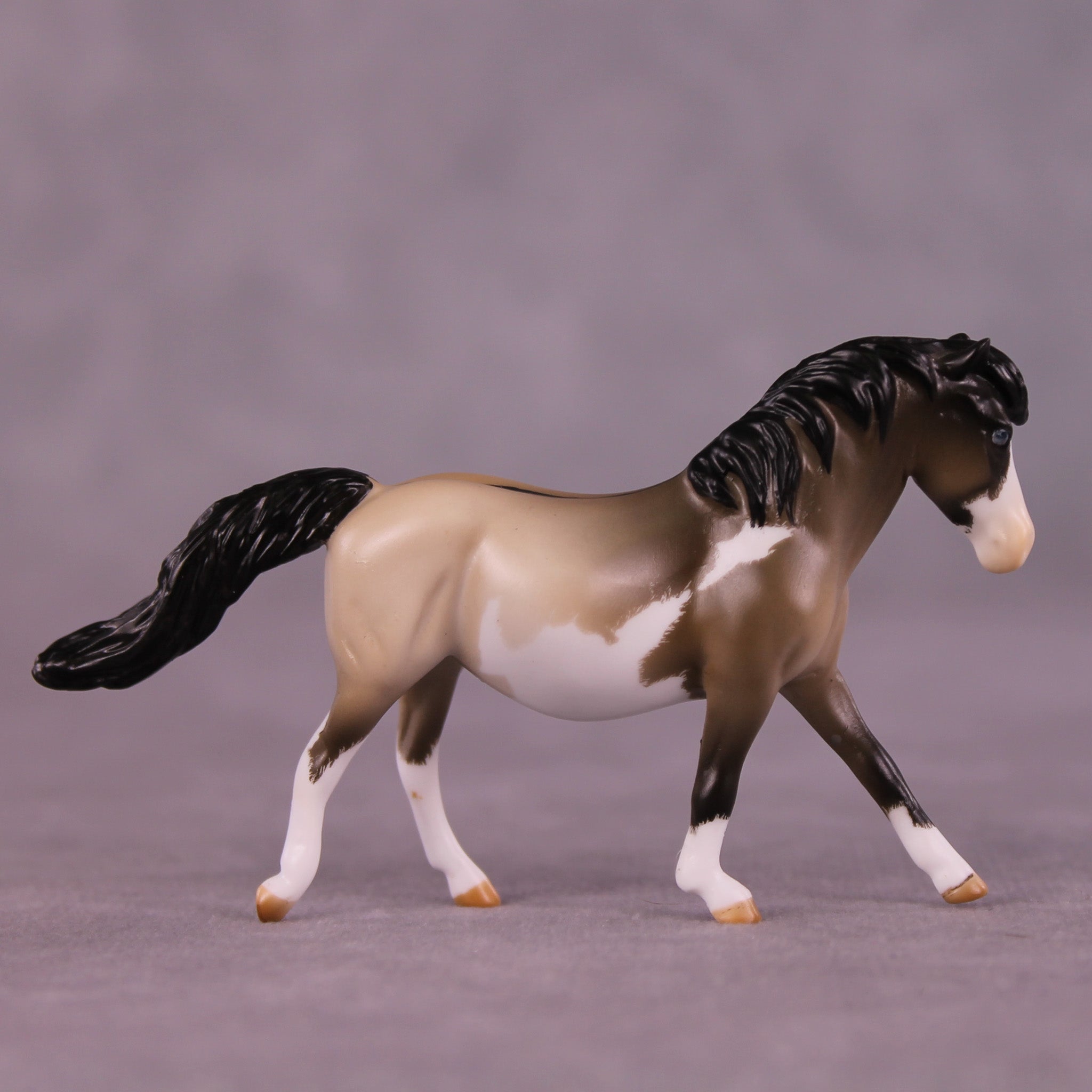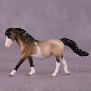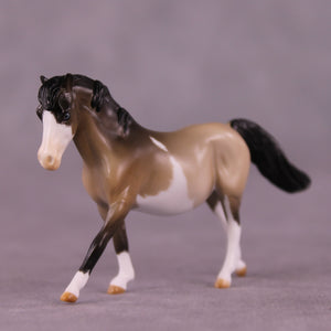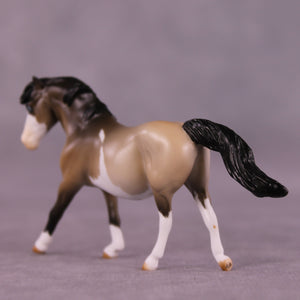 Tummy Hurts 2 is an adorably grumpy callback to Tegan’s first group of models she created for us earlier this year! Designed on our Chip Pony mold, Mel customized her into a businesslike forward head-tucked canter with a long flying tail and extra detailing. Tegan painted her to a beautiful grulla splash pinto pattern with expertly done contrasty shading and etched marking edges, finished with blue eyes! Finish changes are not available on this piece.
