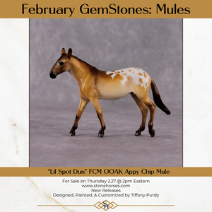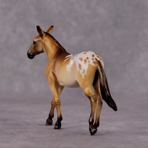 This piece features a customized turned head and twitched ear, underneath a shaded dun appaloosa paint job with etched pattern edges, teensy tiny hoof stripes, and loads of detail.