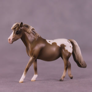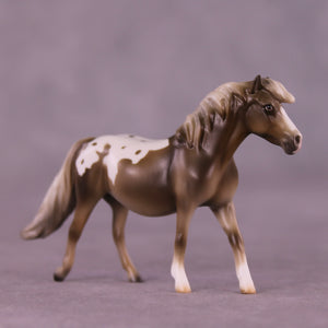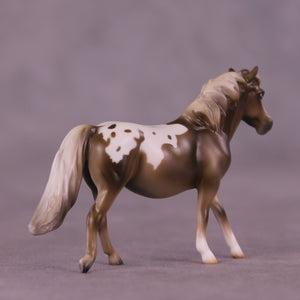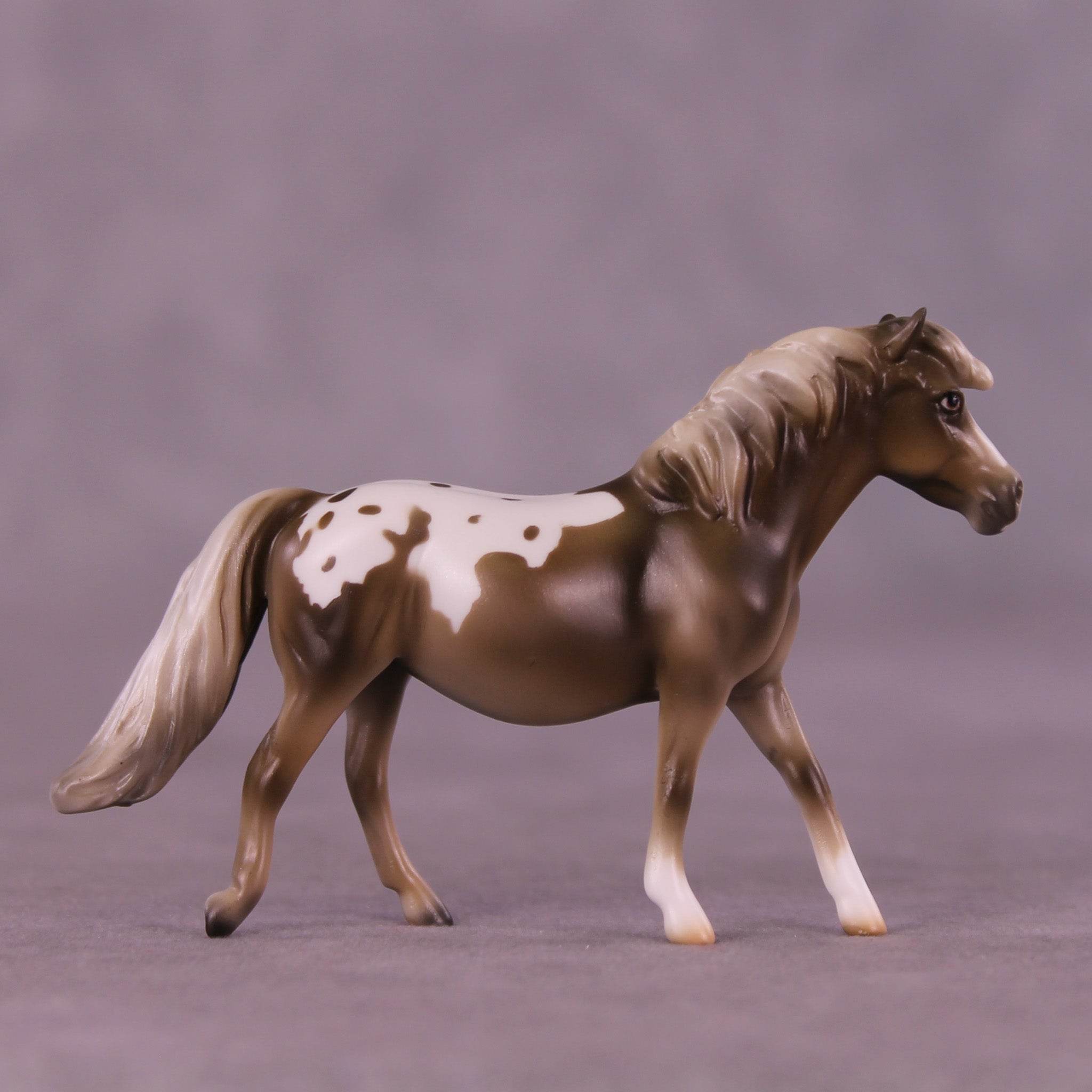 Little Brown Mushroom is just that! Mindy painted her to a lovely mushroom appaloosa, the perfect color for a little show-ready Shetland Cross pony! She sports two front socks and a sweet little blaze, with loads of delicate shading in her mane and tail especially.