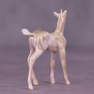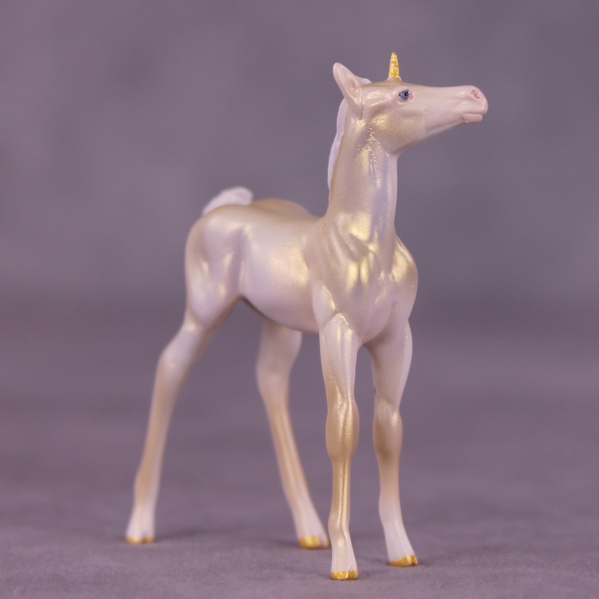 Tiffany gave our Arabian Foal mold a demure makeover into a Unicorn foal, complete with cloven hooves, a baby horn, a baby lion style unicorn tail, a tucked head, customized ears, and more. She is finished to an iconic storybook pearl white with golden shading – your archetypal unicorn baby. So sweet.
