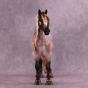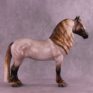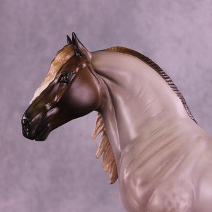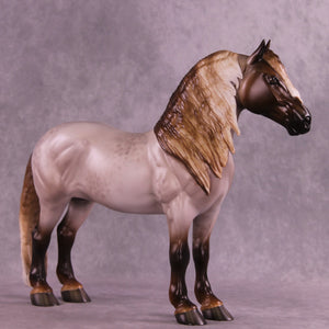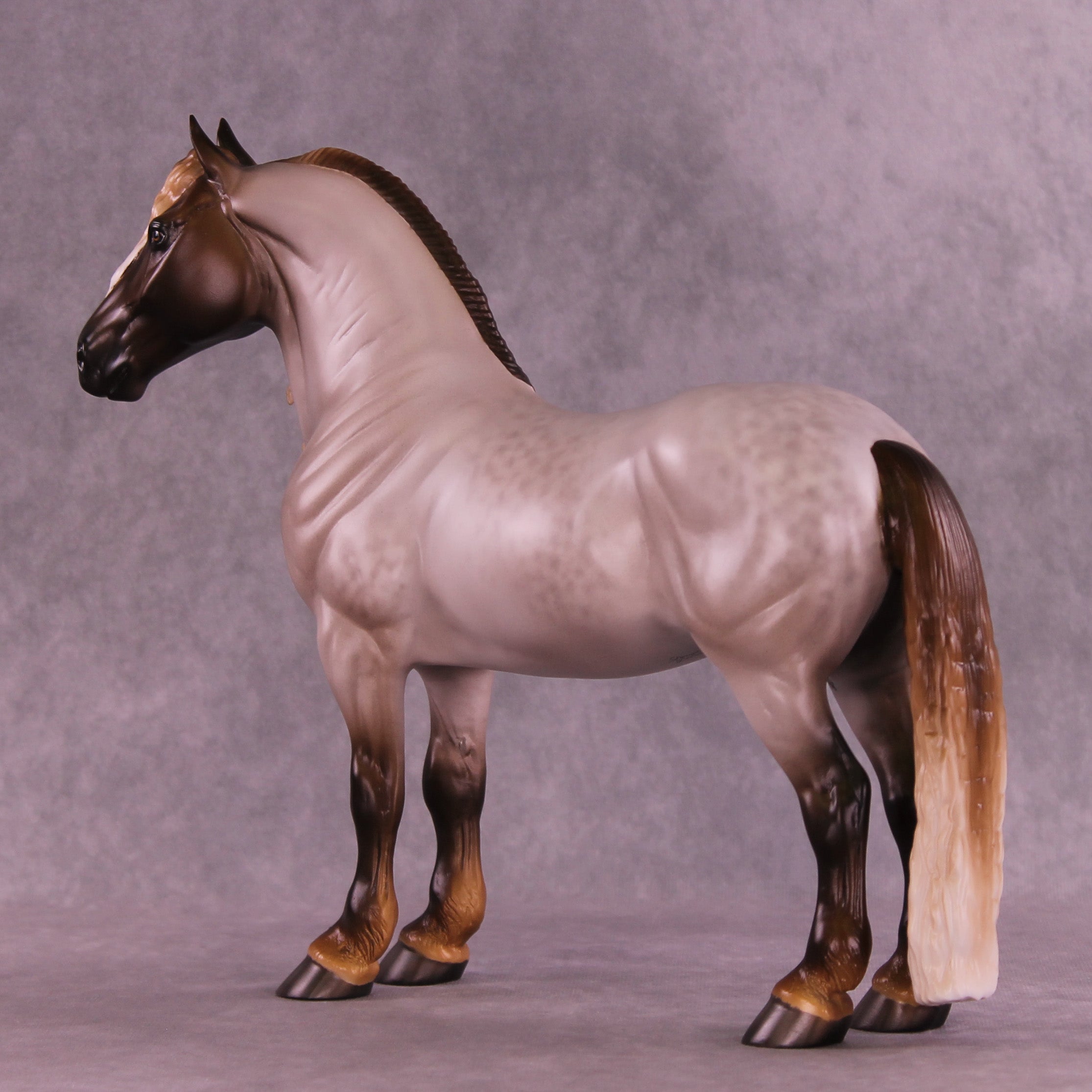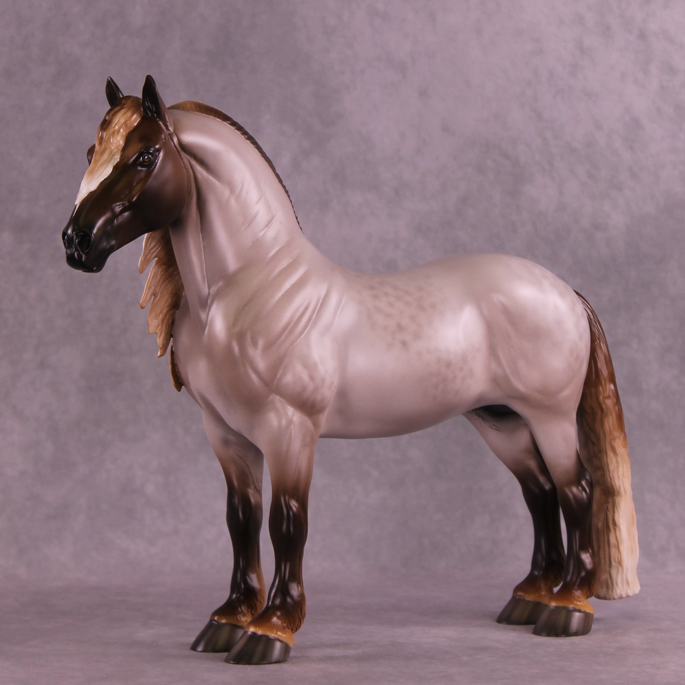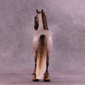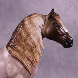 Introducing Lost in Sound, a very stately fellow. We customized him with a gorgeously wavy extra long mane and customized tail and forelock. Sheryl Leisure then gave him a gorgeous liver chestnut roan design featuring Sheyl’s gorgeous combination of soft and hair by hair detailing and brown eyes, and a stunningly soft shaded dimensional ombre mane and tail. This guy is ready to shine in any setting, and is available in all finish options.